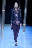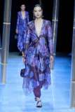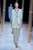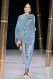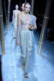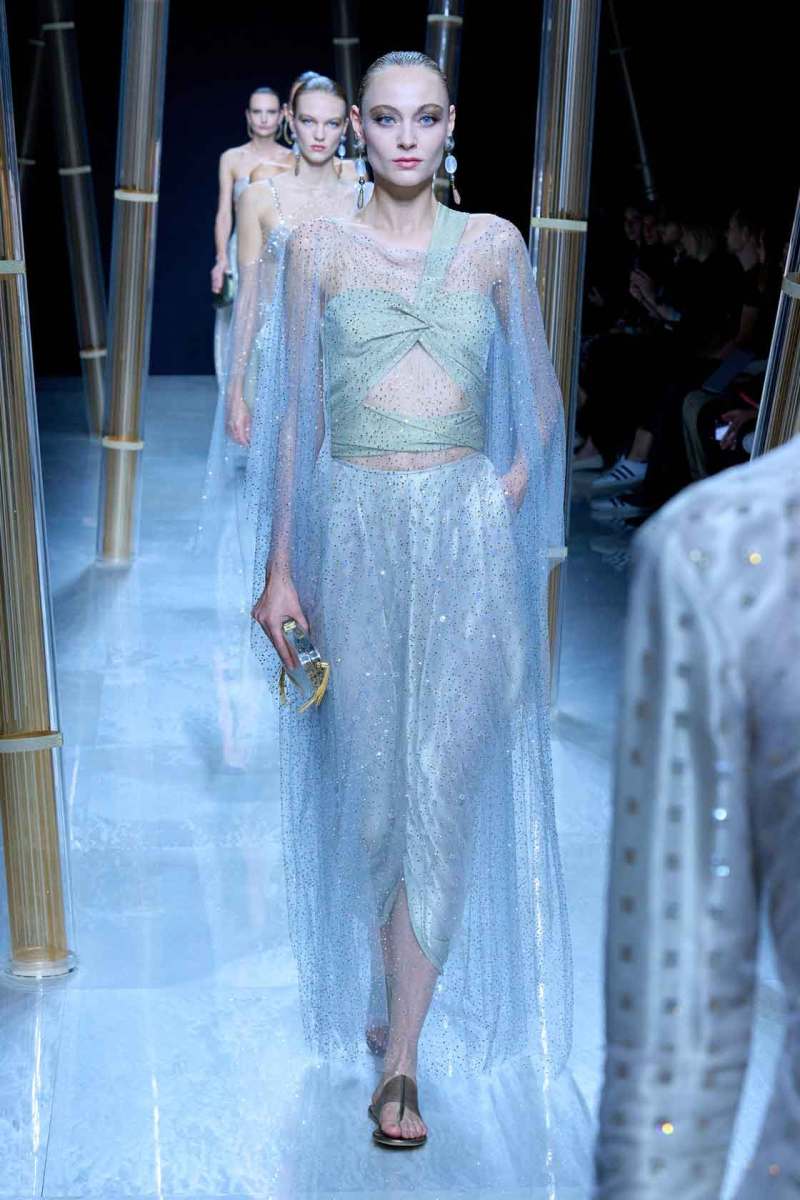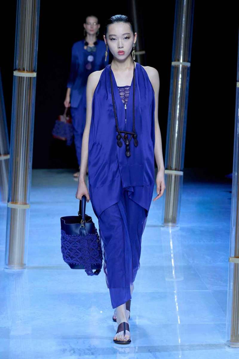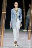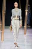 Tra i capi apparsi in passerella troviamo giacche luminescenti che sembrano intarsiate di energia dorata, slip dress sinuosi dai colori delicati, bluse e top a rete; e poi ancora, gonne a pareo o a foulard dai tessuti impalpabili, che si indossano sotto a leggeri spolverini o giacche fluide per abbracciare la figura femminile con dolce spiritualità. Le silhouette morbide e fluide sono esaltate al meglio da scarpe basse e accessori discreti. E a dare un tocco esotico alla collezione, i pantaloni sarouel sono proposti sia in oro che in colori più sgargianti. L’oro è l’assoluto protagonista della collezione, insieme a gradazioni più intense di blu inchiostro e viola.