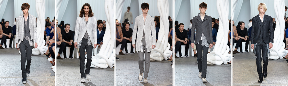 Classico e nuovo: giacche da smoking con effetti degradè, i pantaloni sono in denim affusolato, gilet di lino e seta spuntano dagli abiti, sciarpe al posto di camicie e cravatte e biker-jacket in pitone per un tocco rock’n roll. Casual e formale: i cardigan diventano giacche con fibre di lino e metallo, i pantaloni vengono decorati di lato con zip, le giacche hanno i bottoni in corno che conferiscono quell’allure preziosa.