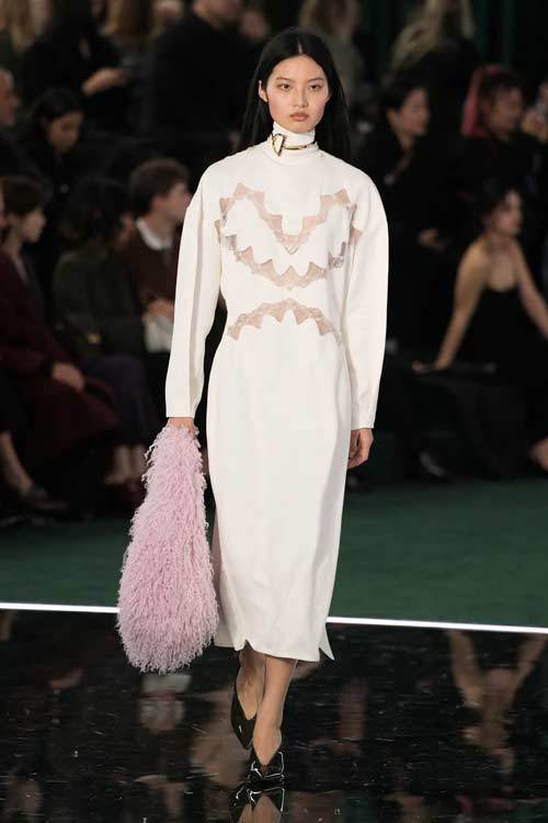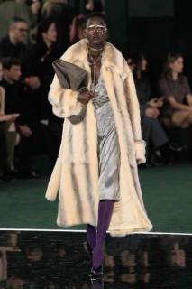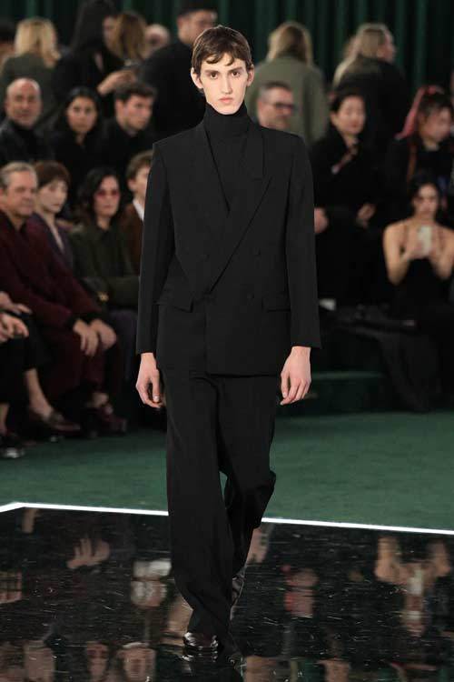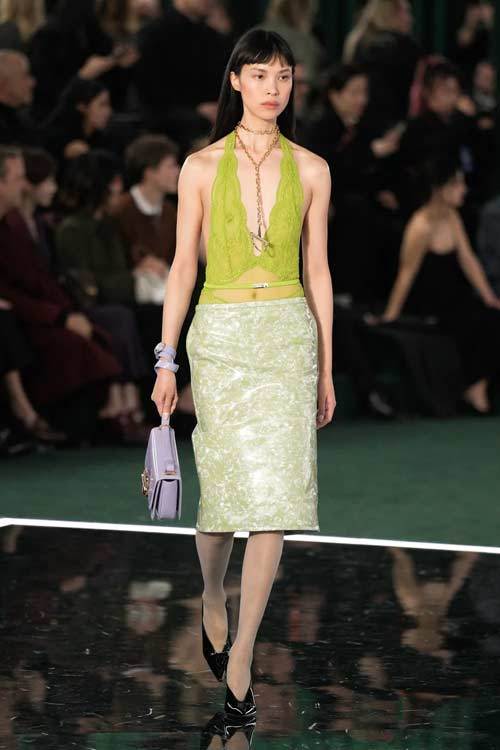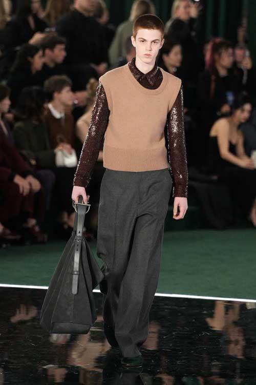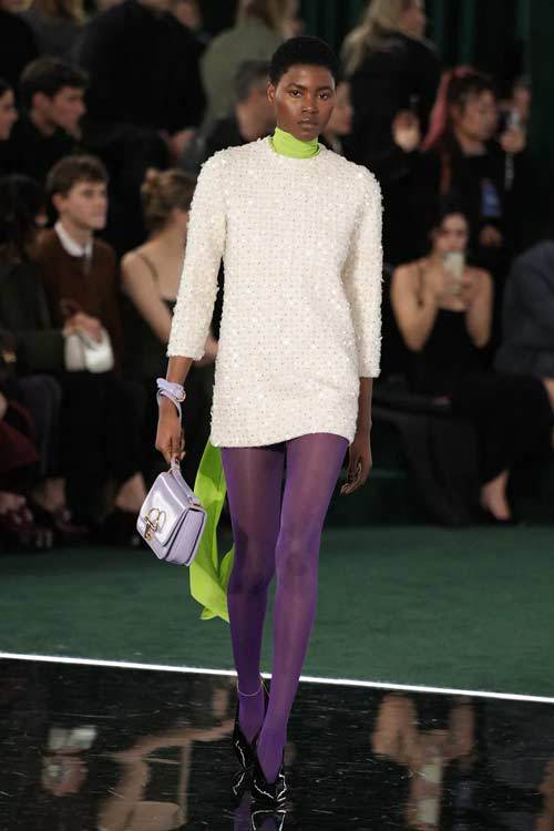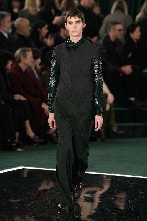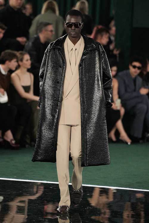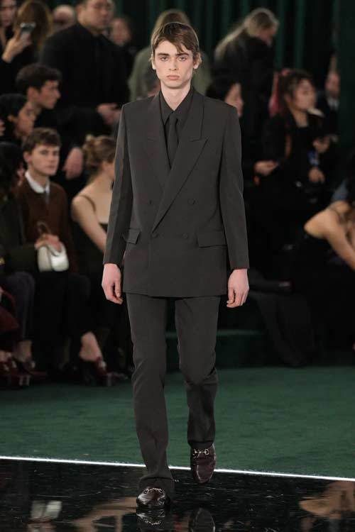 “Continuum” è un viaggio nei decenni chiave di Gucci: dagli anni ’60, epoca in cui nacque il ready-to-wear del brand, al minimalismo sofisticato degli anni ’90, fino al massimalismo più recente. Il tutto si traduce in una gamma di materiali sperimentali e strutture fluide: mohair pettinato, pelle madreperlata, filati in lana rivestita e tweed fiammati. Le nuance spaziano tra verde, grigio, viola e marrone, unendo classico e contemporaneo con una fluidità che attraversa il tempo.