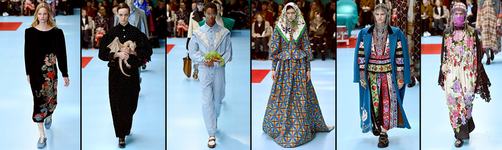 La sfilata Gucci si configura nell’ottica di un Manifesto Cyborg, di cui viene celebrato l’ibrido, ovvero la possibilità di mescolare identità multiple tenendo insieme concetti come natura e cultura, maschile e femminile, normale e alieno.