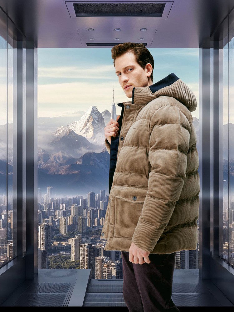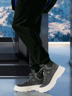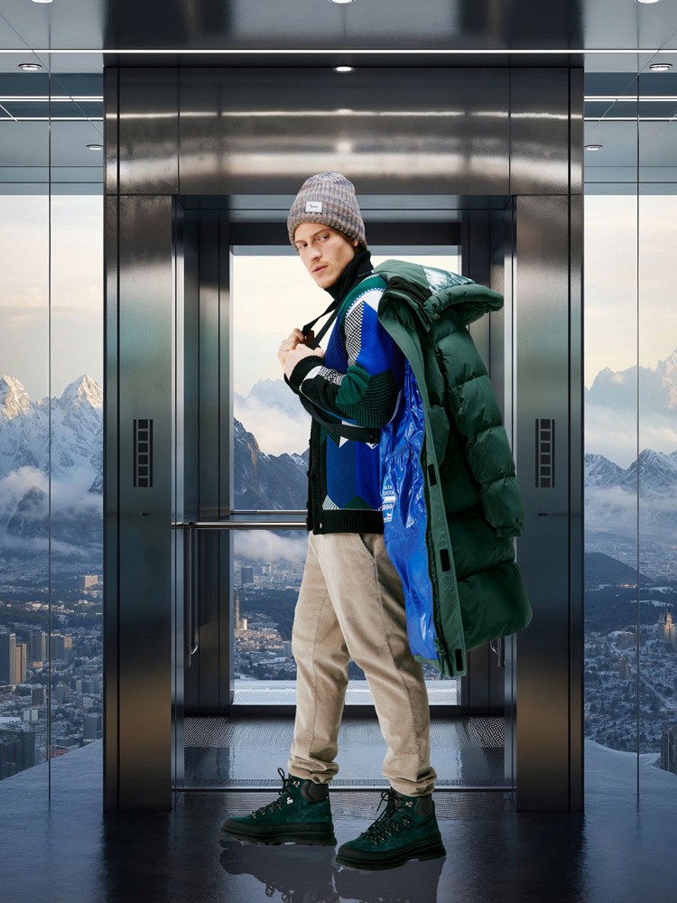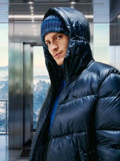 In questo caso, la proposta ricade su toni più scuri, tenaci, verdi, neri e grigi, che richiamano gli elementi e l’atmosfera di montagna. I materiali utilizzati sono tecnici e caldi per consentire la massima protezione contro le basse temperature.