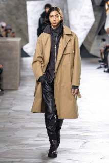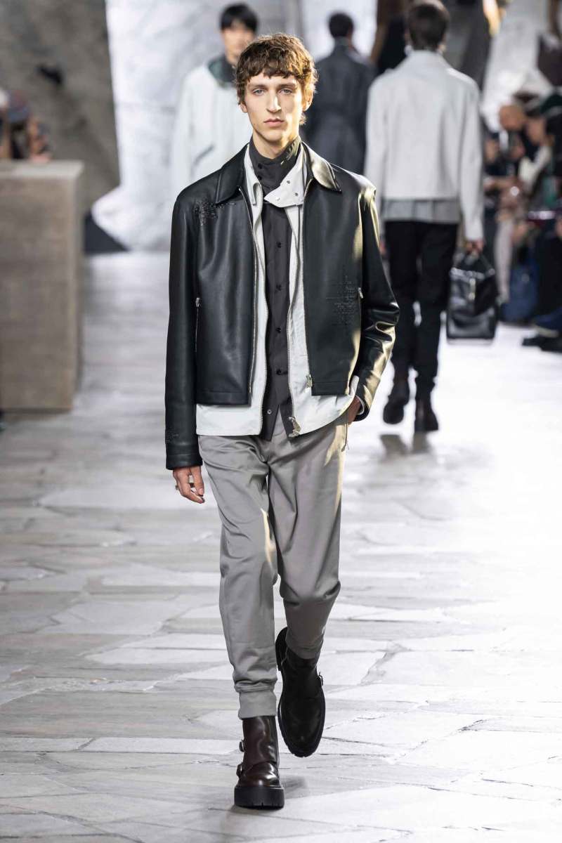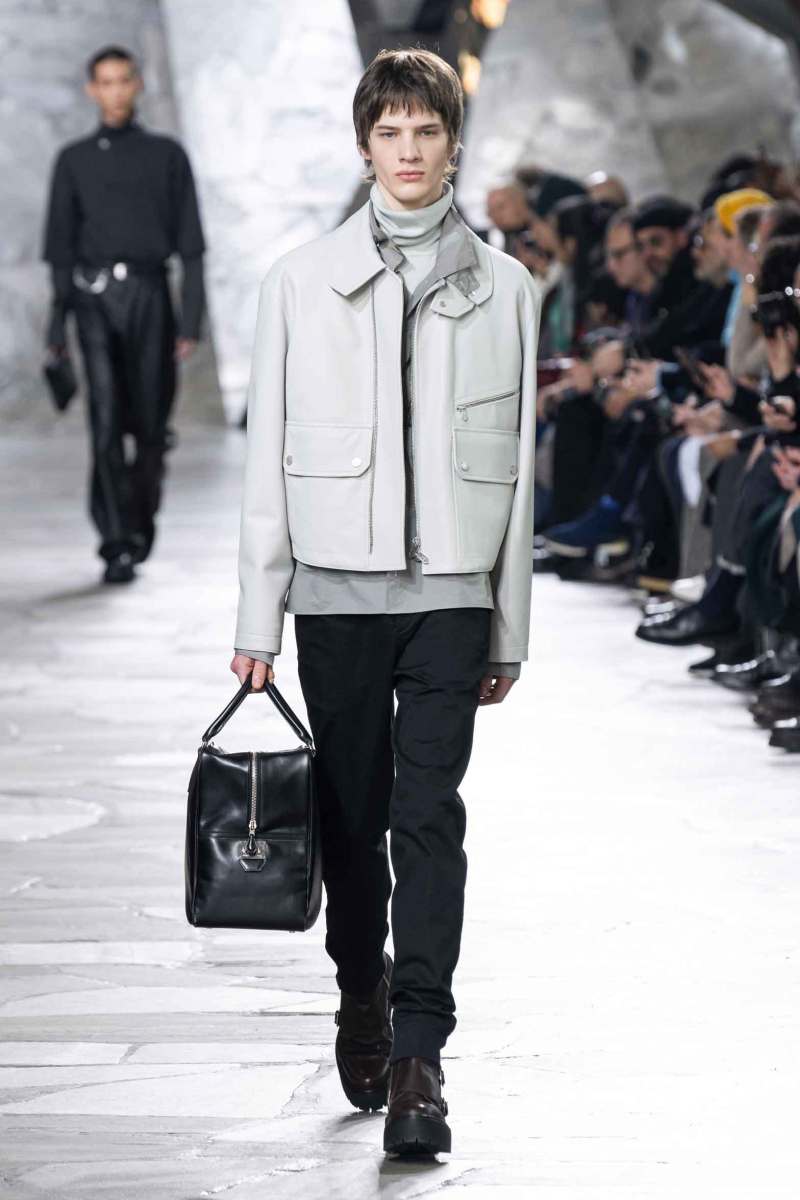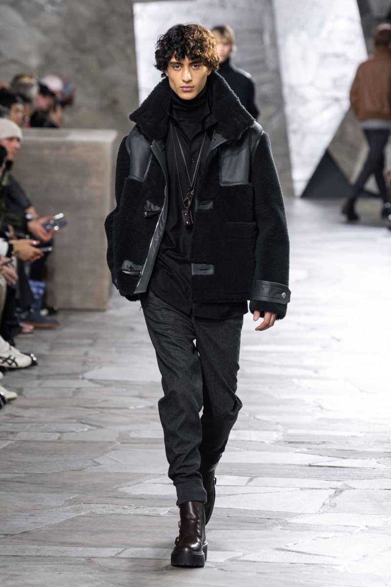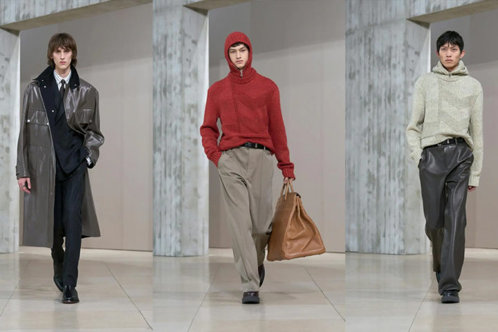Per l’autunno inverno, l’uomo Hermès indossa capi morbidi ma raffinati. Grande focus di quest’anno è sulla pelle, da quella di vitello per i pantaloni a gamba ampia, per le giacche, le felpe e le camicie a mezza zip; pelle di cervo usata invece per un blouson e uno shearling di agnello per un cardigan nero. E ancora, di pelle erano un trench-coat e le giacche con chiusura a gancio tipica delle divise da pompiere.