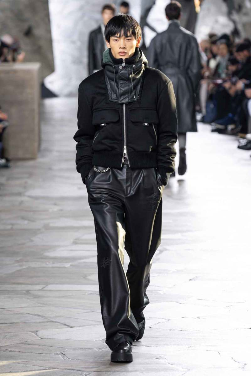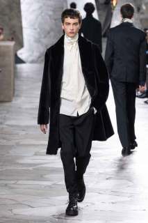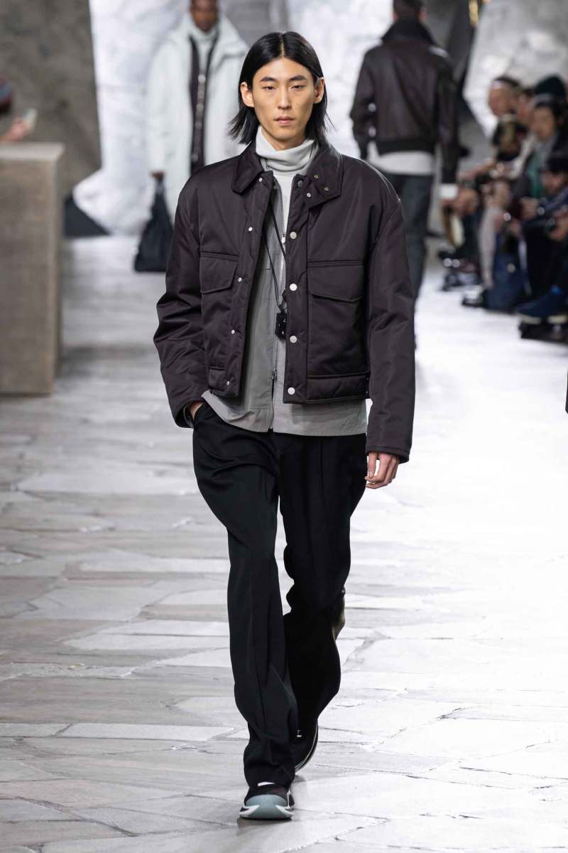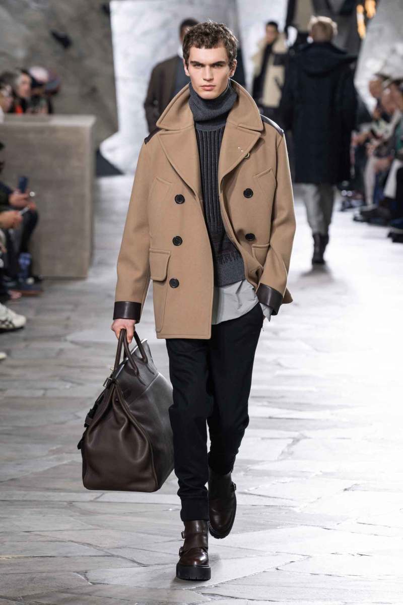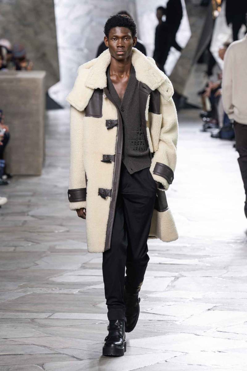 Per l’autunno inverno, l’uomo Hermès indossa capi morbidi ma raffinati. Grande focus di quest’anno è sulla pelle, da quella di vitello per i pantaloni a gamba ampia, per le giacche, le felpe e le camicie a mezza zip; pelle di cervo usata invece per un blouson e uno shearling di agnello per un cardigan nero. E ancora, di pelle erano un trench-coat e le giacche con chiusura a gancio tipica delle divise da pompiere.