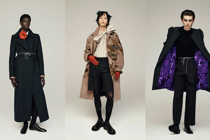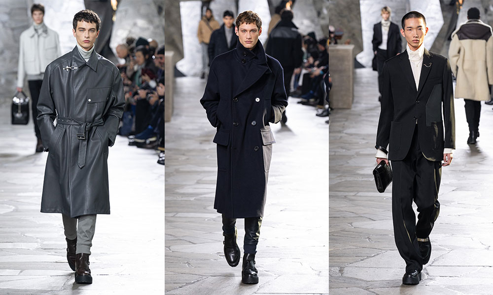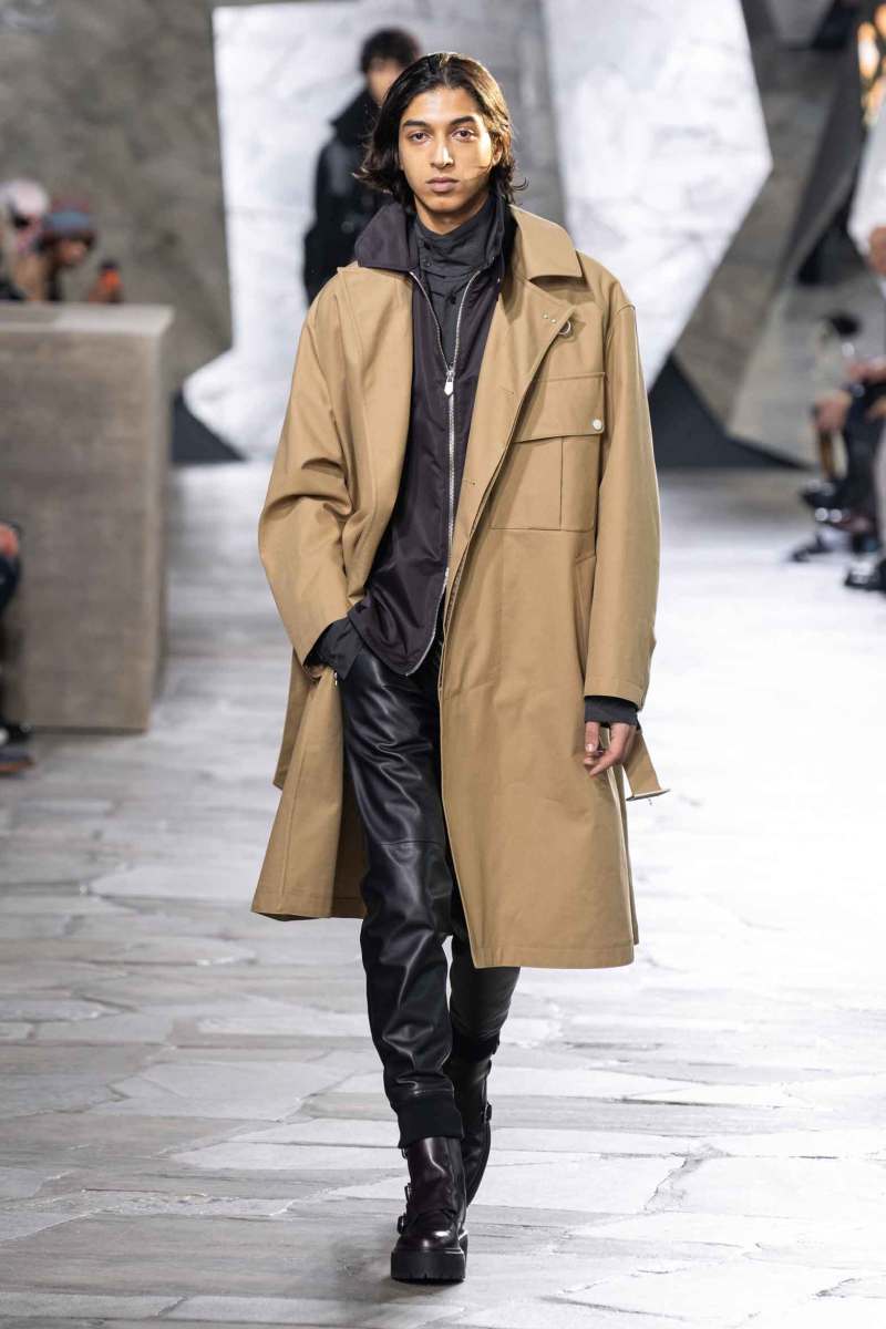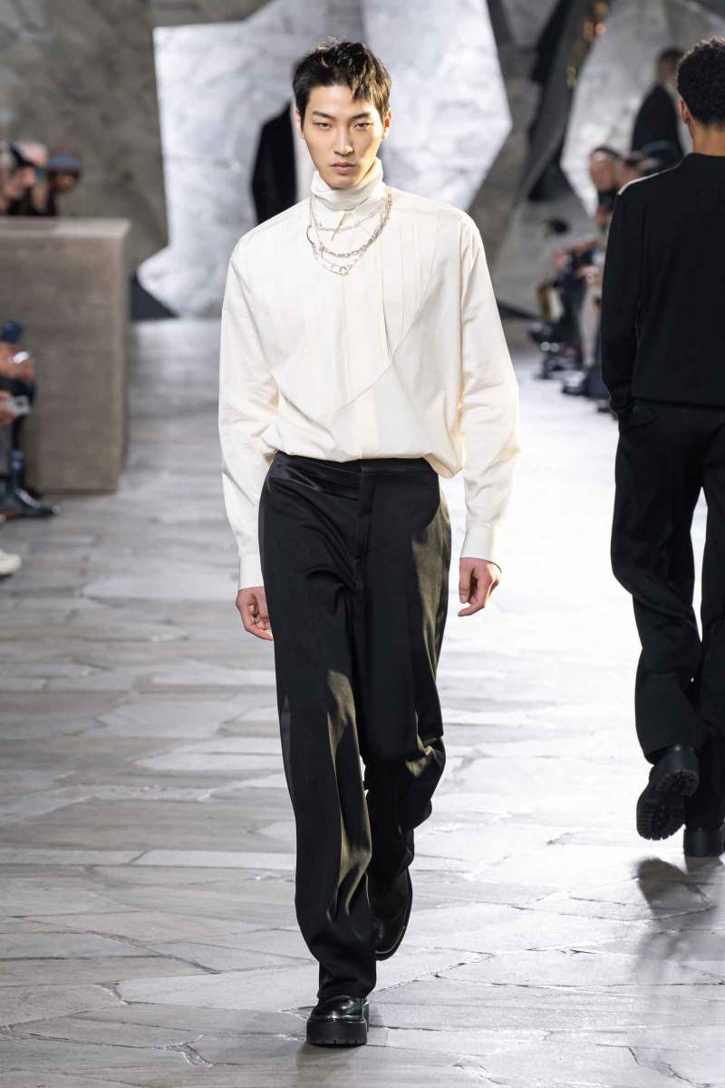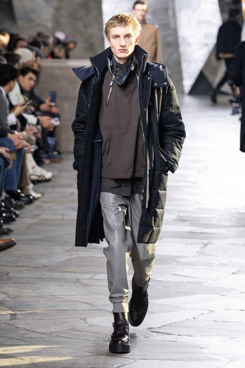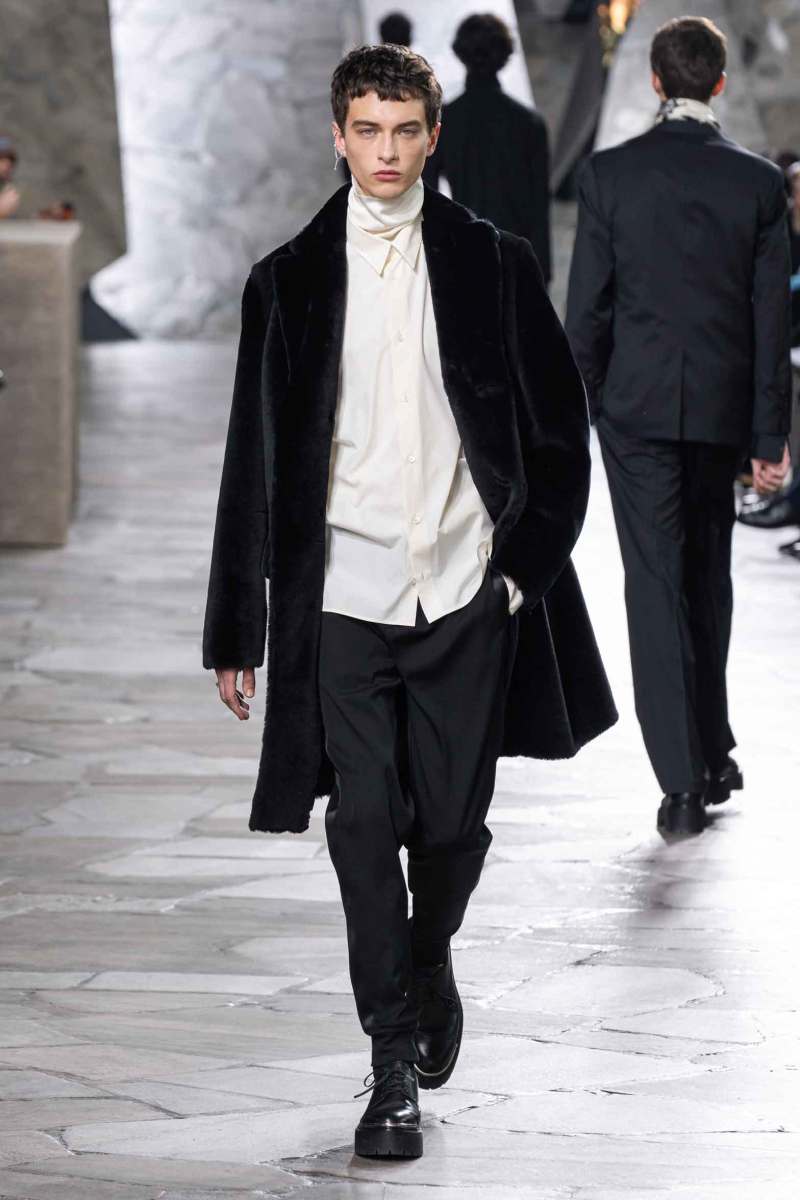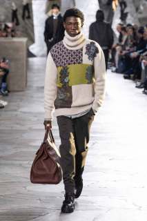 I moderni uomini di Hermès rinunciano alle loro cravatte, sostituendole con lussuosi dolcevita e gemelli ai polsini delle camicie; blouson dal collo alto o sciarpe stampate che aggiungevano svolazzo. La maglieria e molti dei capi presenti in sfilata vedevano motivi geometrici tessuti o applicati che astraggono i disegni tipici presenti sui foulard Hermès, emblemi della maison francese. Per la sera, Nichanian ha scambiato le cravatte tradizionali con i colli alti delle camicette e le ha decorate con molte catene delicate per infondere un tocco dandy e bohémien.