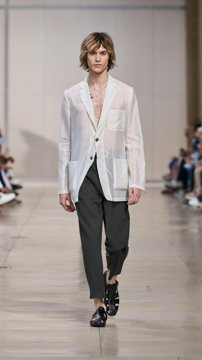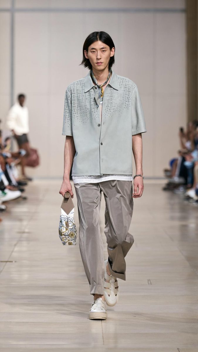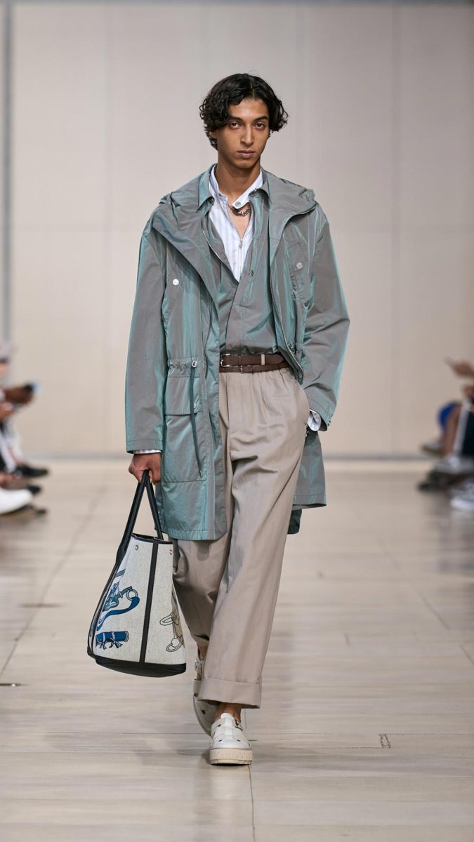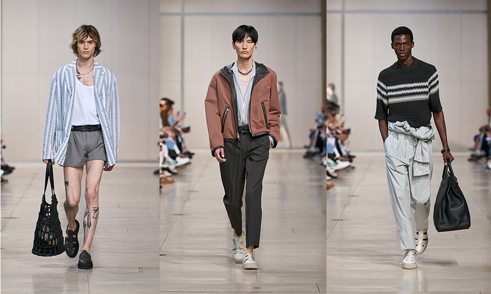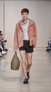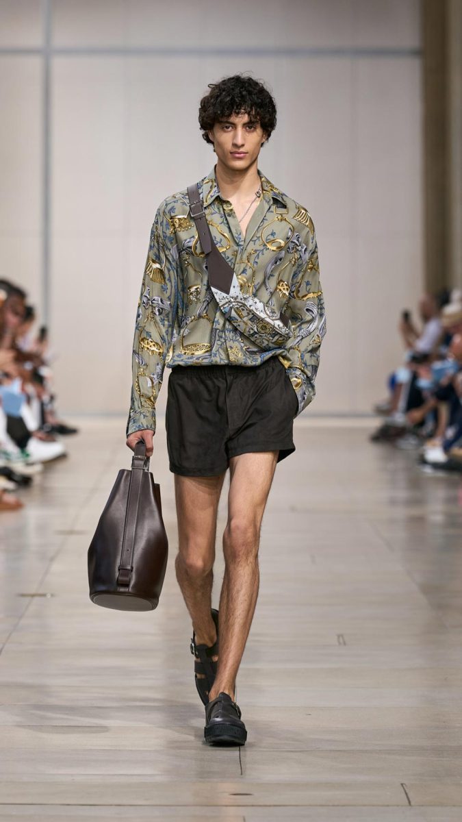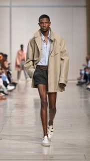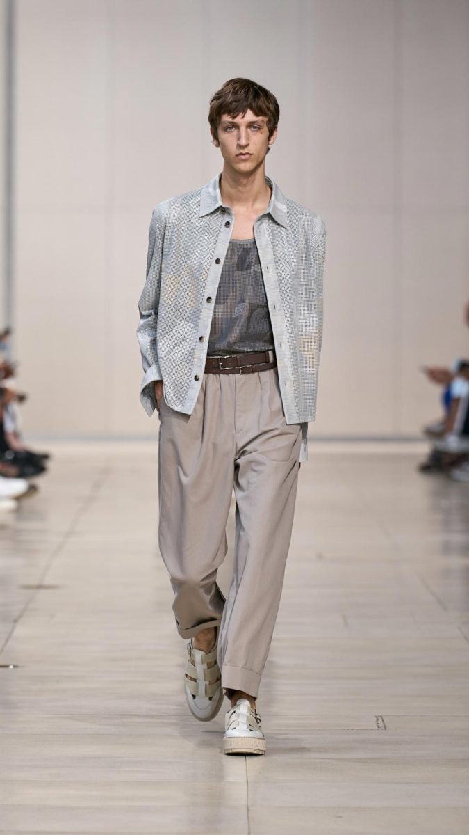 Nella nuova collezione firmata Hermès i corpi risultano liberi; shorts, bluse, trench corti, blazer da spiaggia in tessuto tecnico caratterizzano la nuova collezione Hermès Uomo. La palette dei colori utilizzati richiama le nuances tipiche del deserto, del vapore e del ghiaccio: queste tonalità si fondono perfettamente insieme e si riflettono.