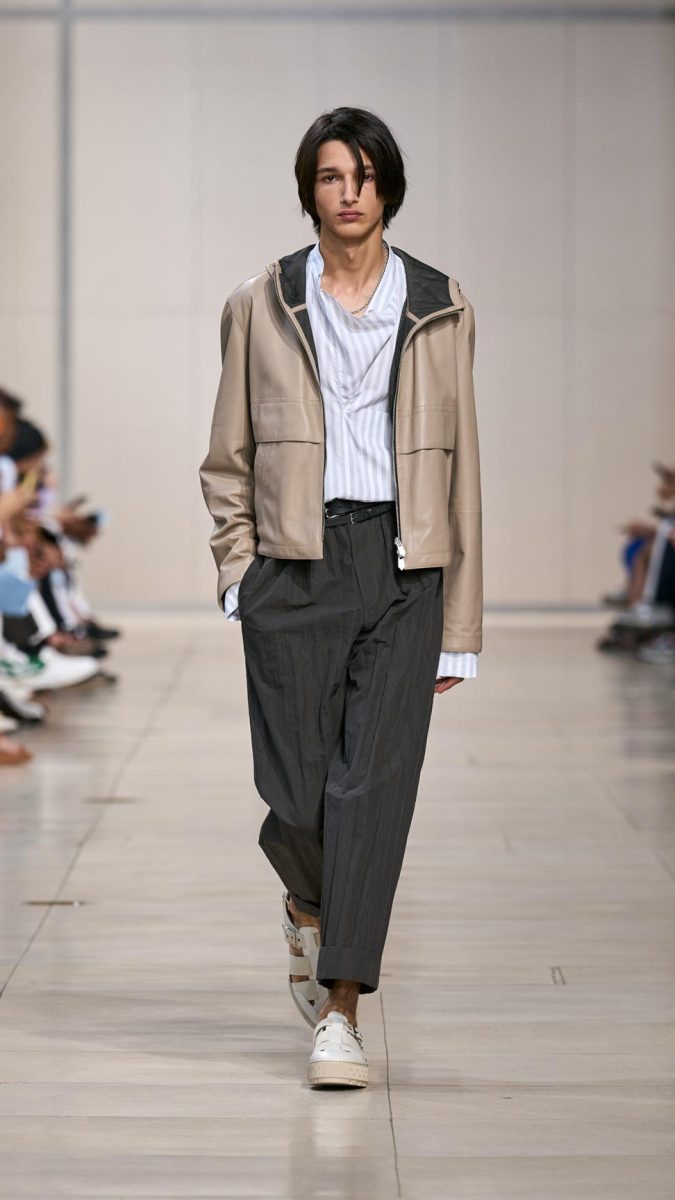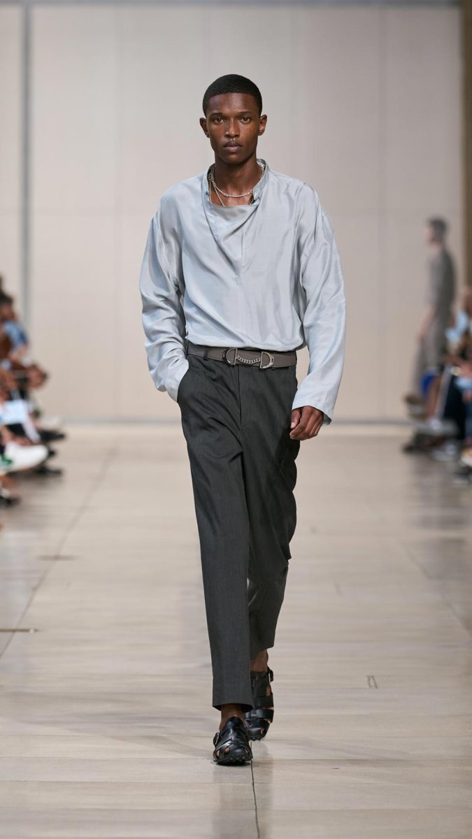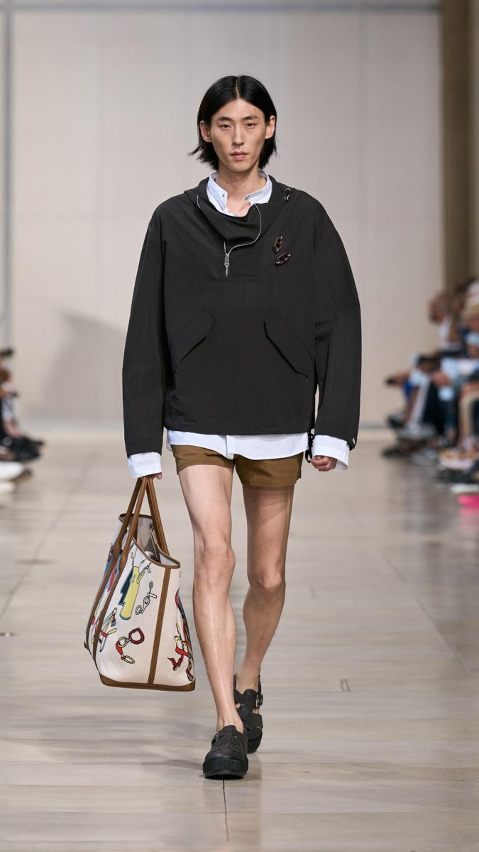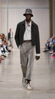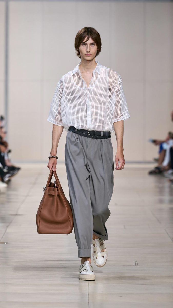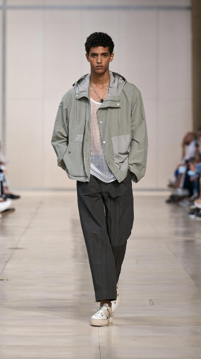 Nella nuova collezione firmata Hermès i corpi risultano liberi; shorts, bluse, trench corti, blazer da spiaggia in tessuto tecnico caratterizzano la nuova collezione Hermès Uomo. La palette dei colori utilizzati richiama le nuances tipiche del deserto, del vapore e del ghiaccio: queste tonalità si fondono perfettamente insieme e si riflettono.