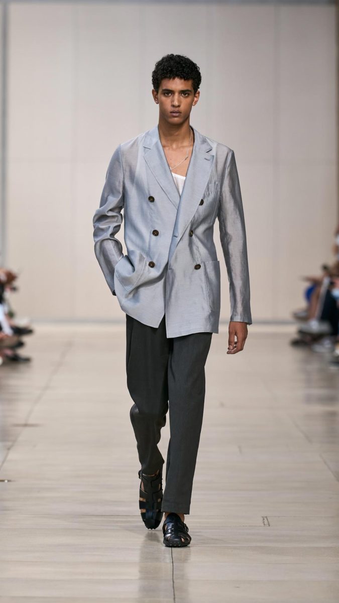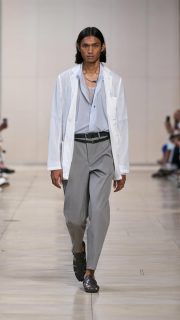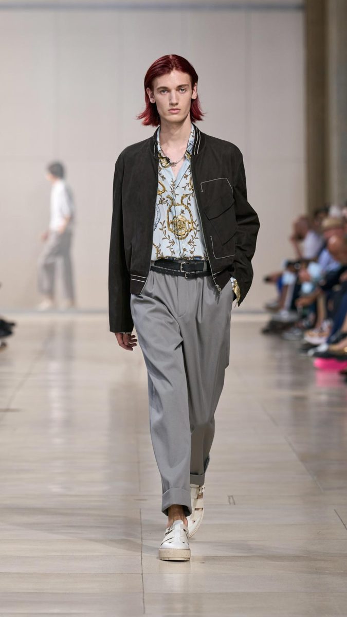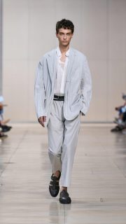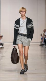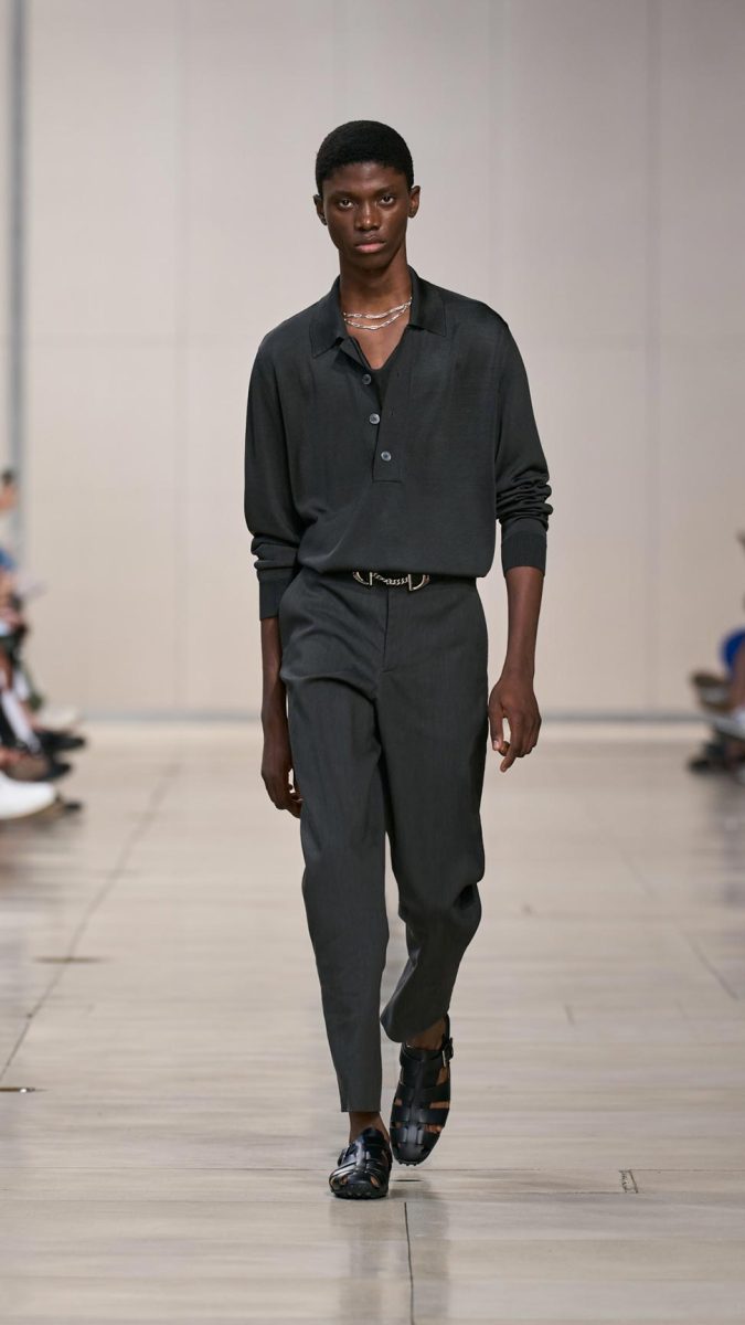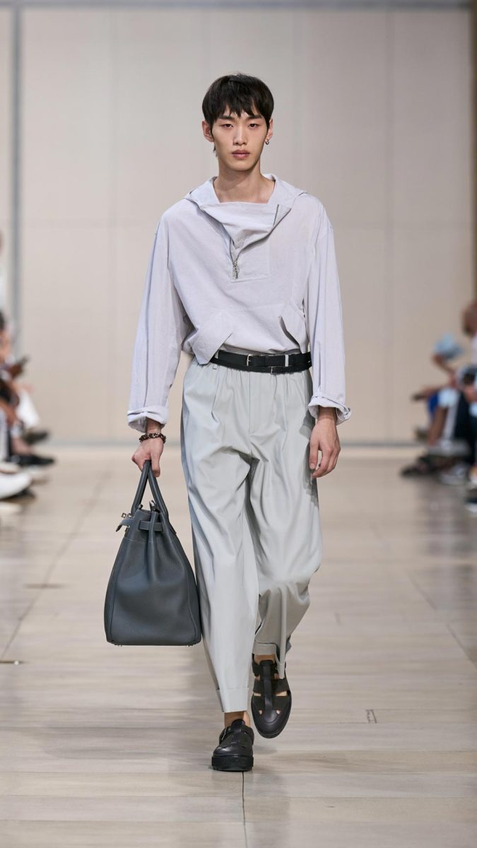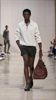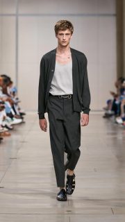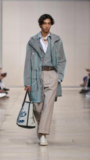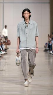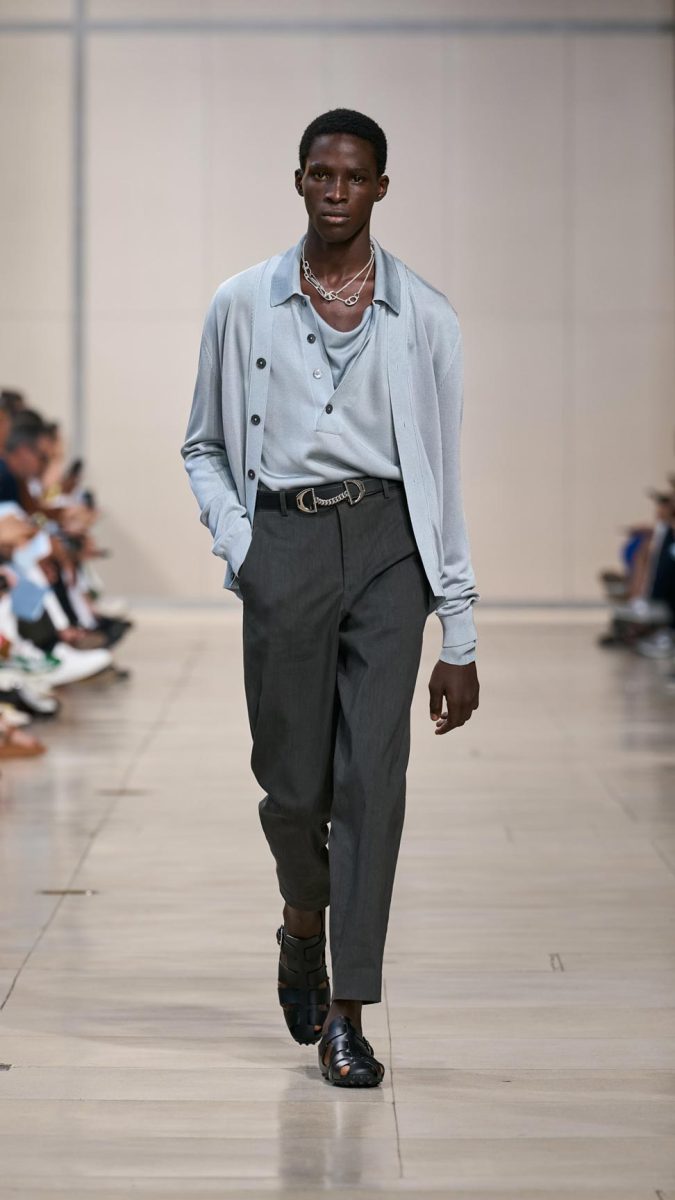 Nella nuova collezione firmata Hermès i corpi risultano liberi; shorts, bluse, trench corti, blazer da spiaggia in tessuto tecnico caratterizzano la nuova collezione Hermès Uomo. La palette dei colori utilizzati richiama le nuances tipiche del deserto, del vapore e del ghiaccio: queste tonalità si fondono perfettamente insieme e si riflettono.