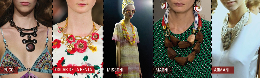 Missoni punta ai toni brillanti con i suoi fili di “caramelle” nei colori del Sole. Le collane Pucci sono metalliche invece, anche qui enormi, riproducono l’effetto di una serie di ingranaggi montati insieme, intorno al collo, molto originali.
