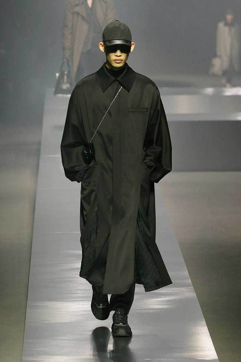 I modelli di Fendi sfilano su un originale sistema di passerelle – una pedana costruita con l’iconico logo FF specchiato Fendi progettata dall’artista Nico Vascellari – facendo emergere capo dopo capo un’idea sempre più definita del “new gentleman”.