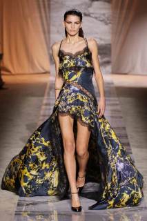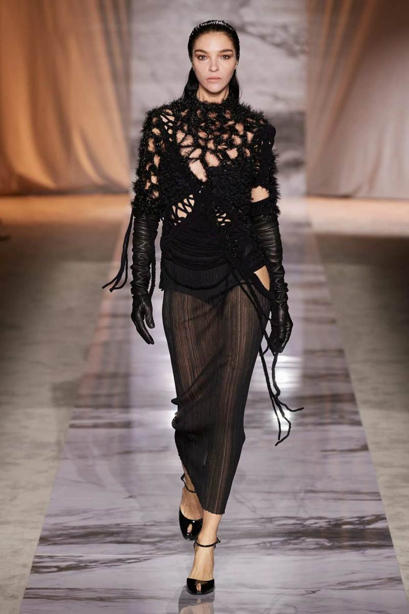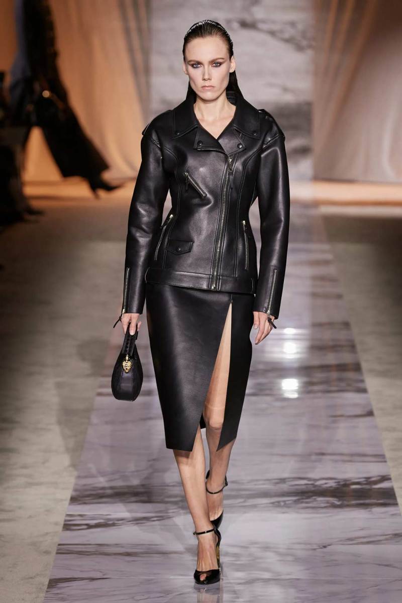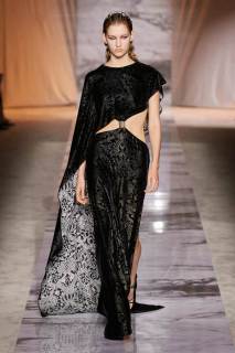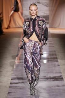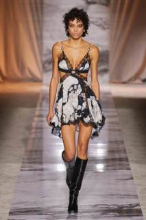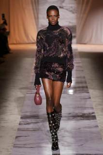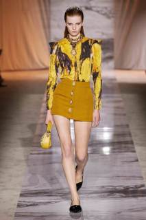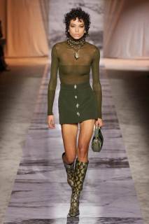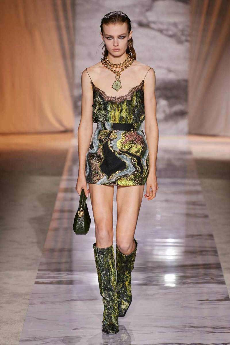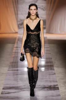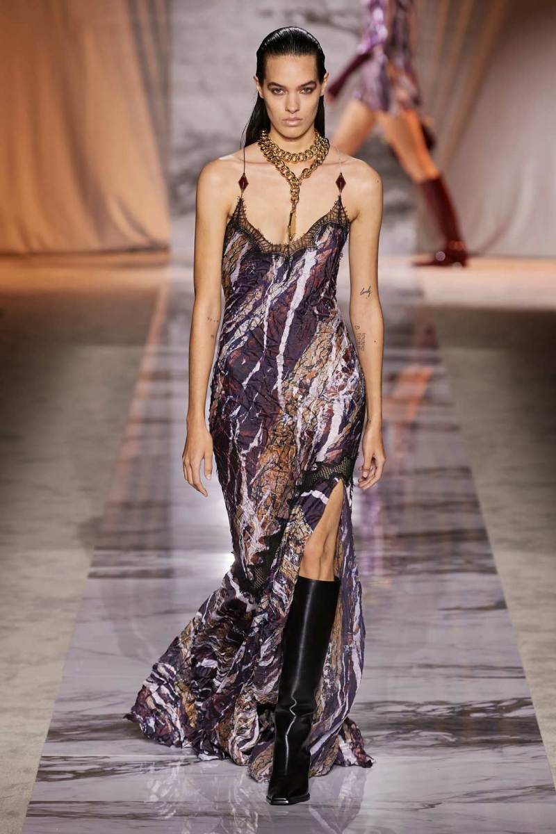 L’esecuzione della collezione resta fedele alle linee sensuali di una delle griffe più glamour di sempre dell’intero fashion system, ottenute dai tagli a sbieco, le scollature, le sottovesti e i plissè. I tessuti rendono nobile e indossabile ogni aspetto di questa roccia sedimentaria, con il vinile di trench e pantaloni si ricorda il suo aspetto nella finitura lucida, il velluto devorè la cristallizzazione oro su nero del marmo Portoro, e le trasparenze richiamano i suoi profondi solchi naturali. Oltre ai sensuali abiti lunghi con spalline rinforzate da metallo, minigonne a pieghe e dritte sotto a tailleur ladylike dalle giacche a clessidra. Puglisi punta tutto sul piumino come capospalla della prossima stagione fredda, in versione maxi sia sulle lunghezze che sulle impunture.