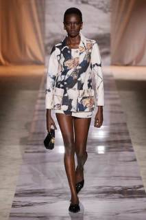 Le tonalità di colore protagoniste sono quelle del marmo bianco con venature nere, per poi tingersi di viola, rosso e burgundy e anche giallo oro, senape e verde. Non tutto è stampa, i look monocolore nel burgundy, senape e rosso sono in plissè effetto corteccia e solo guardandoli attentamente ci si accorge che sono due capi sovrapposti, di cui l’orlo del top è tagliato a vivo e termina con delle punte. Immancabile la scia di total black sul finale illuminata dagli accessori a catena oro con pietre di marmo incastonate.