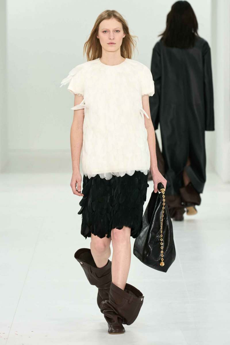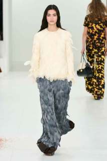 Se pensavate che l’abito fantasma fosse una grande sorpresa, a stupirci ancora ci sono le borse che si trasformano in abiti, dove la loro catena in realtà sostiene l’orlo del vestito. E poi ancora, le piume che diventano un tessuto andando a coprire l’intera texture di maglie, pantaloni e gonne creando un effetto assolutamente incredibile. Sfilano poi un maxi-abito drappeggiato sorretto solamente da una piccola sfera e un abito stampato con un rivestimento marrone metallizzato, che sembra una pelliccia in movimento.