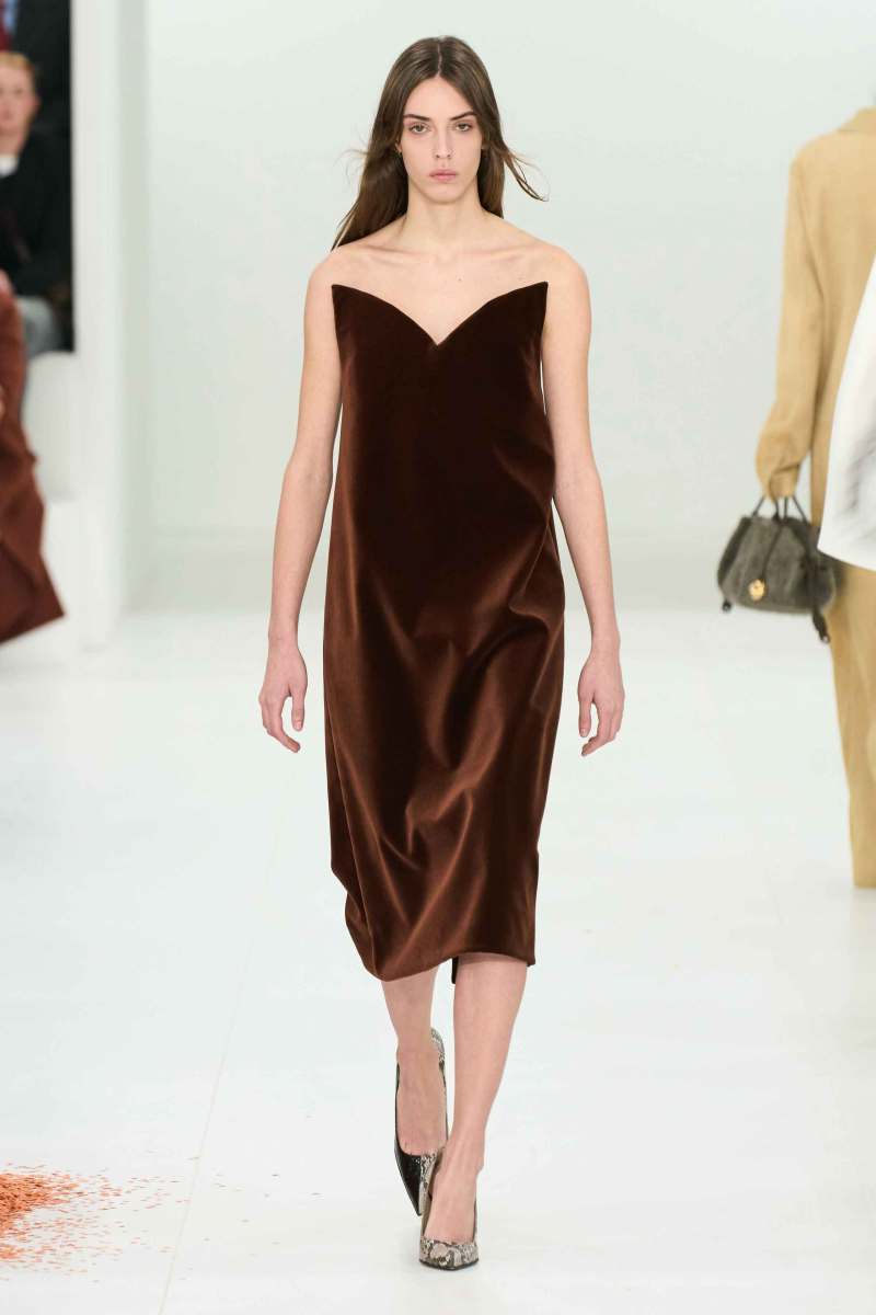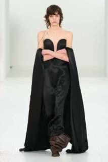 In un momento attuale definito dalla totale estroversione, la passerella femminile AI 2023-24 presenta una posizione introversa che riguarda la silhouette, la texture e il modo in cui i materiali reagiscono alla luce. I protagonisti sono la pelle, duchesse di seta, raso, velluto, maglia cashmere, piume, cristalli. La palette colori è caratterizzata dai toni del nero, marrone, cammello, bianco, rosso e non mancano i color pastello.