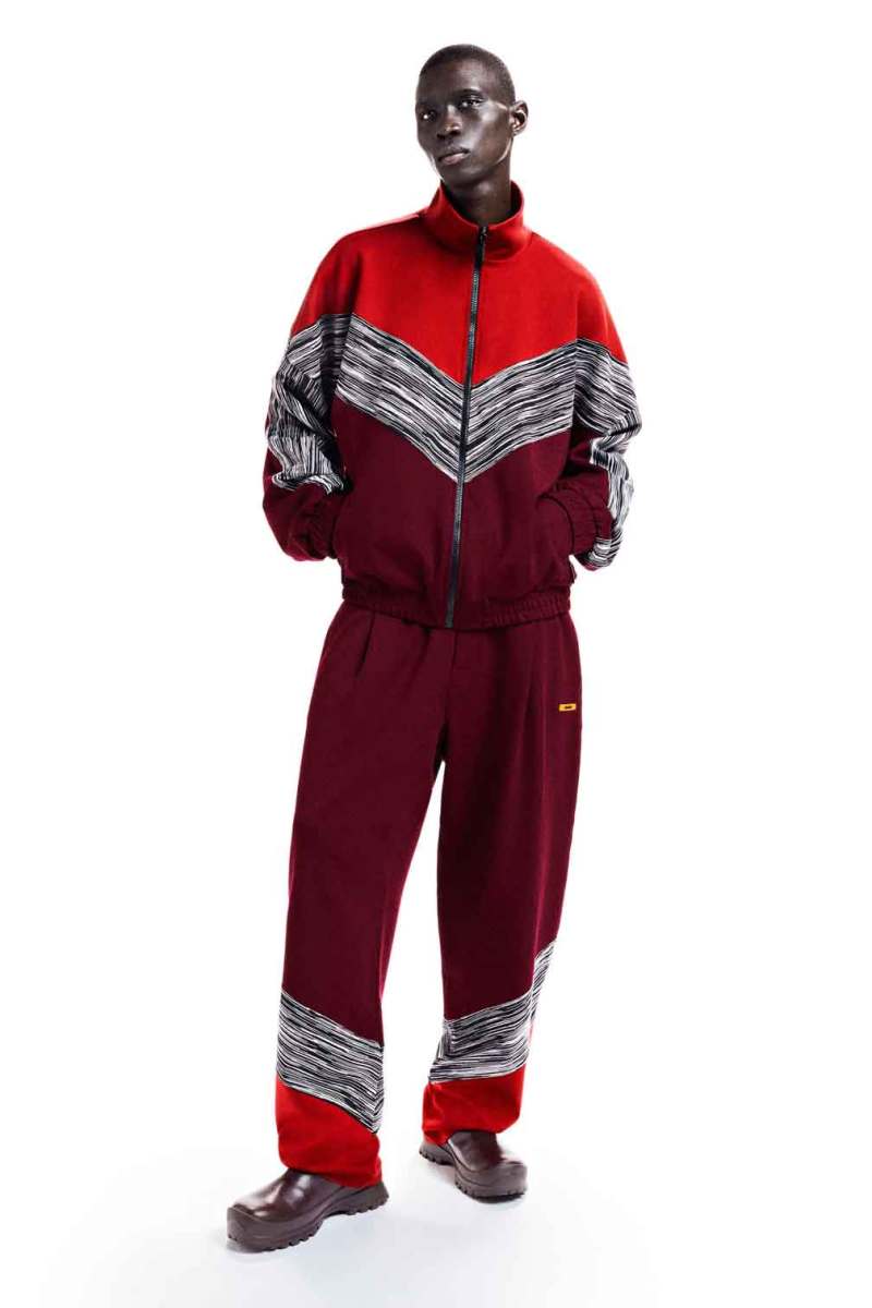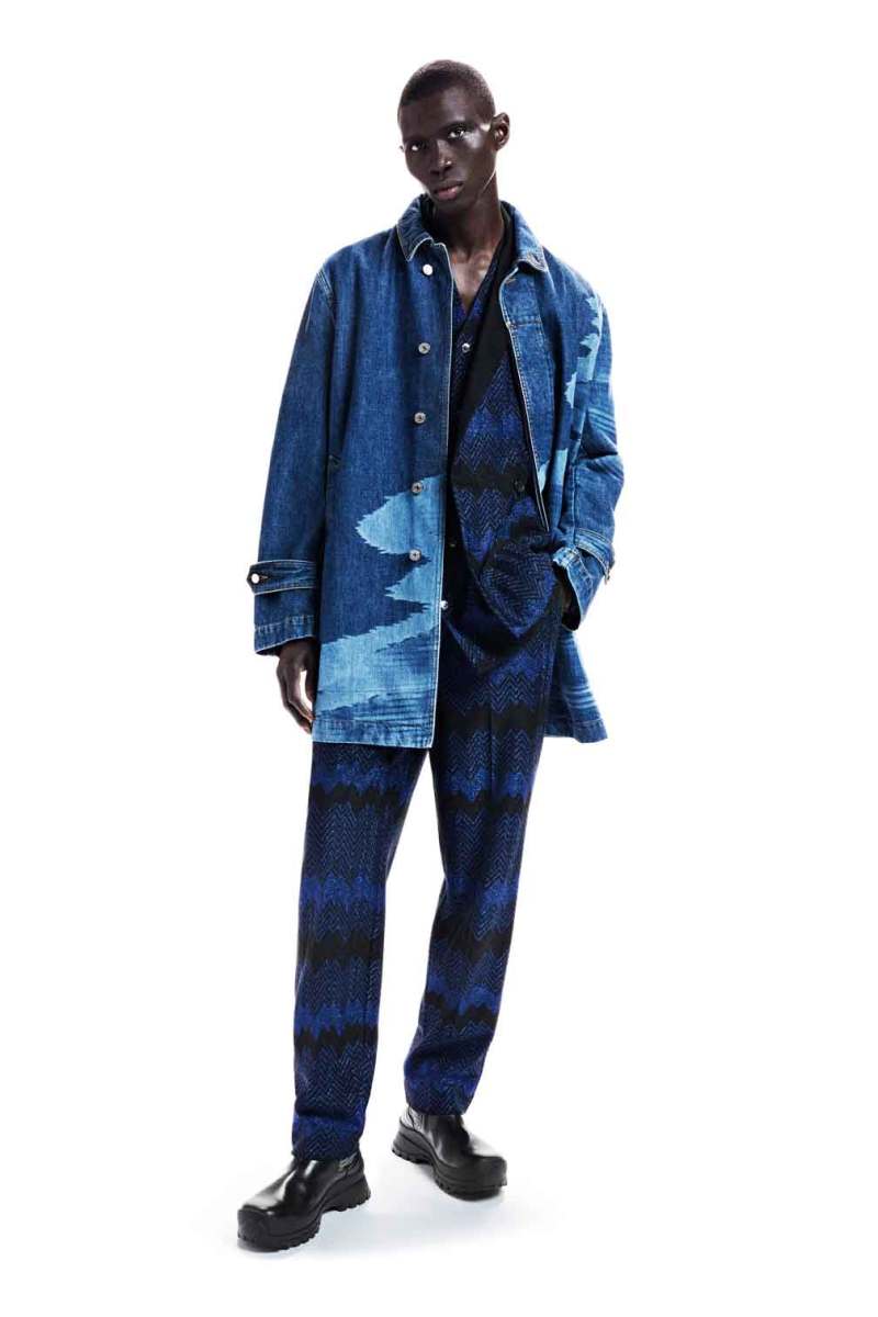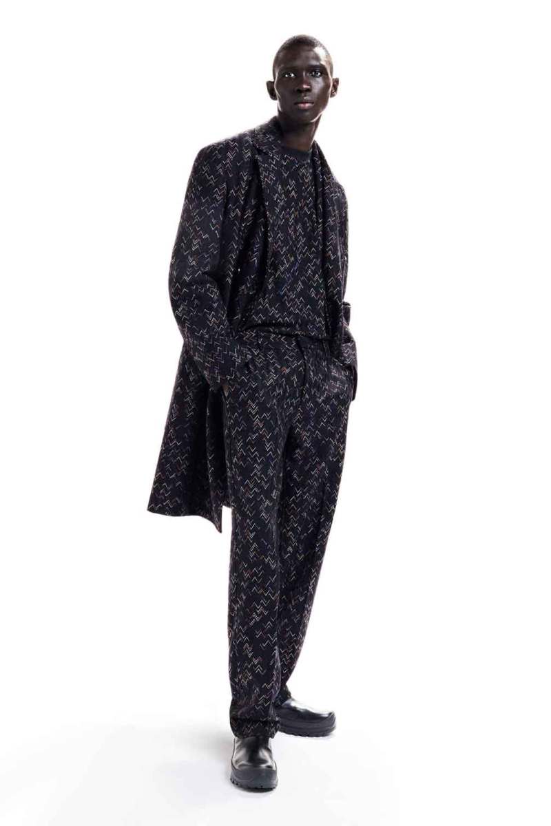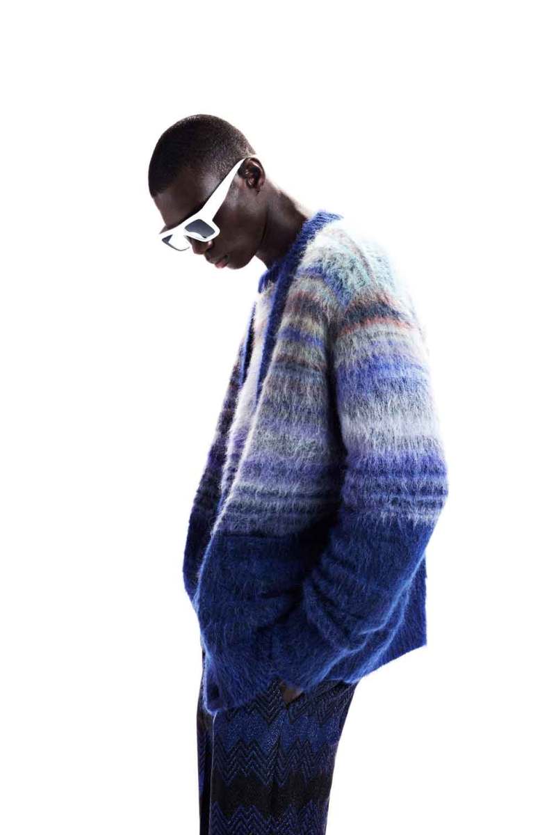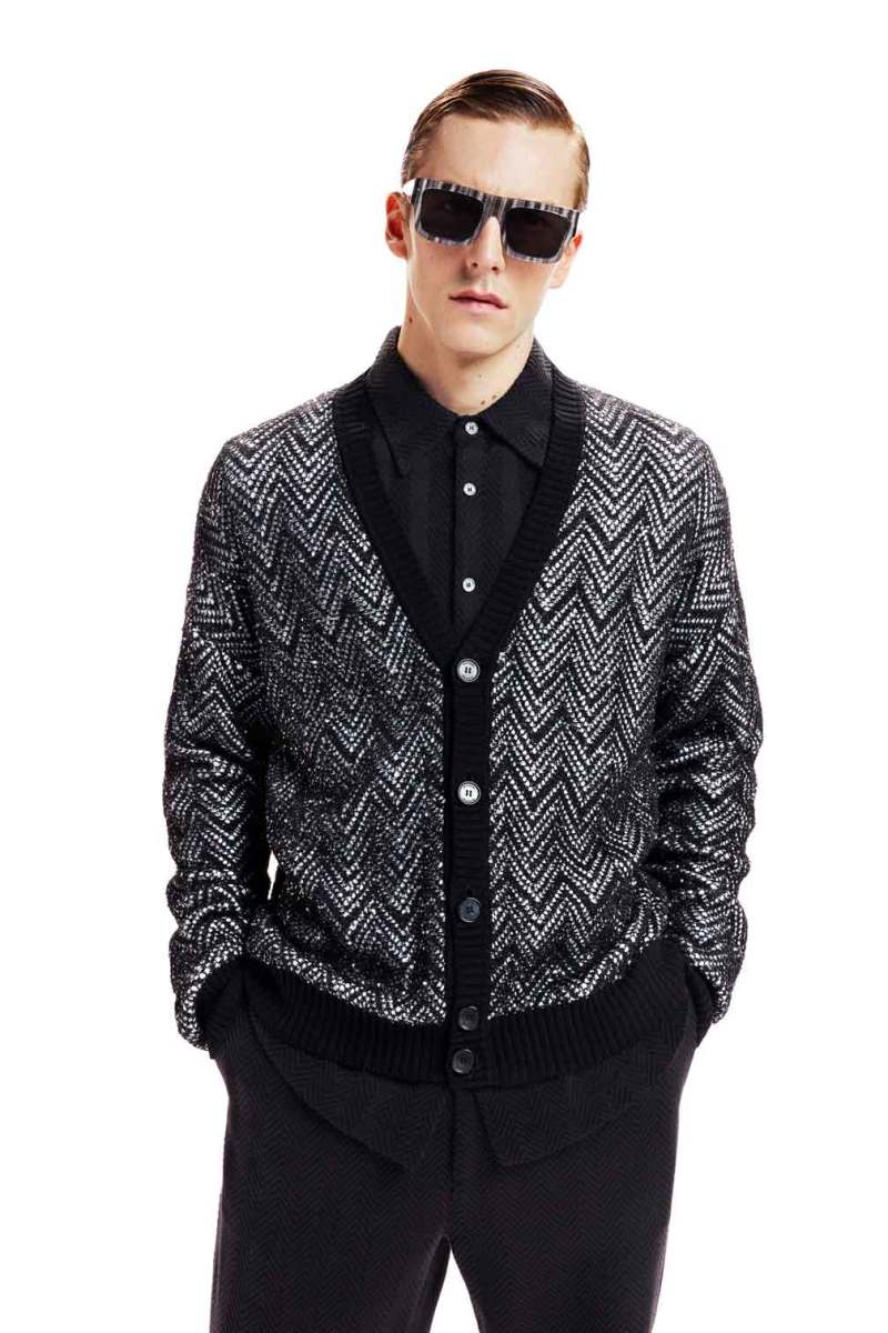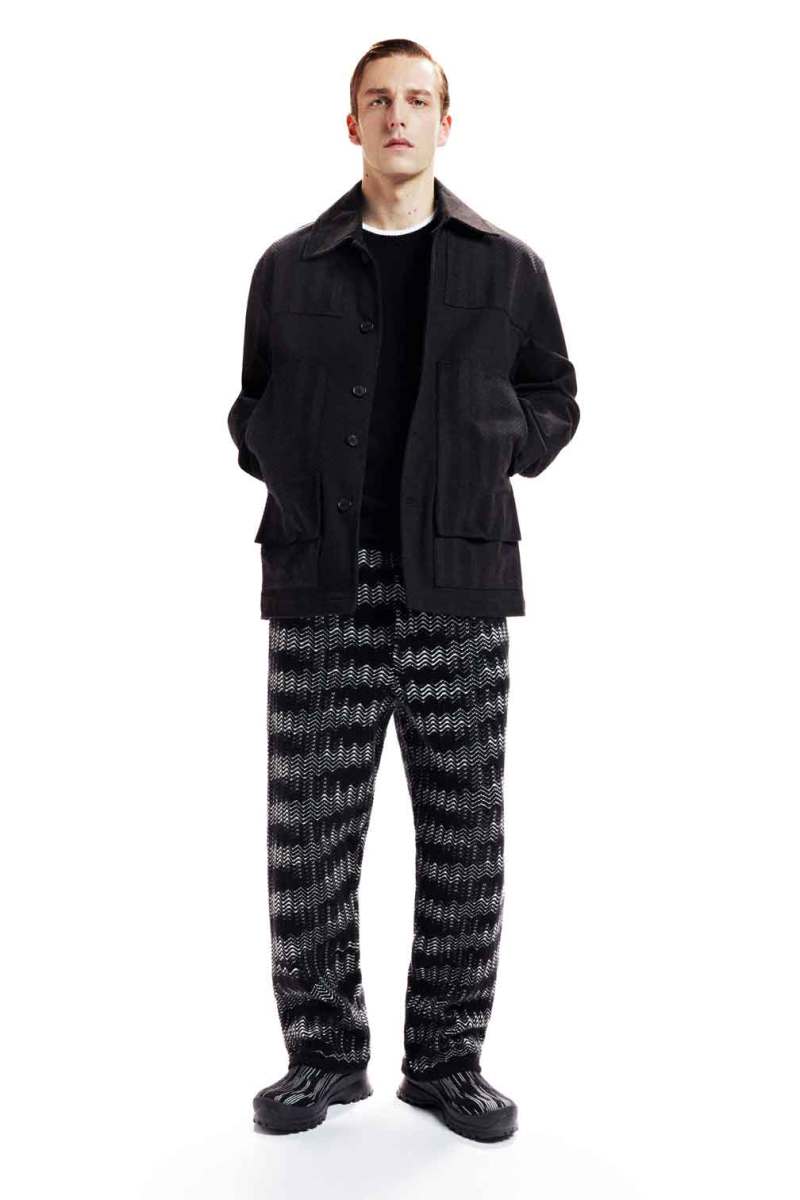 Le forme ricercate in questa collezione sono silhouette sciolte per liberare il corpo dalle mode troppo consistenti, valorizzando le caratteristiche di un capo presentandolo però nella sua basicità. Torna così la vestibilità oversize, maglieria morbida che abbraccia il corpo maschile, abiti che hanno un richiamo alle linee delle tute, scarpe comode. I motivi sono ovviamente quelli che richiamano subito il mondo Missoni: fiammato, zig-zag, strisce, intarsi e l’iconico chevron. Una grande innovazione la si trova nel trattamento delle superfici dei capi in denim, dove i temi del fiammato e dello zig-zag s’intrecciano dando vita a un tema ondulato ton-sur-ton. I colori sono invece più tenui, spesso la base utilizzata è il bianco o il nero, ma troviamo anche colori pastello, il beige, il blu, mentre il tocco di colore viene dato dal bordeaux e dal ruggine.