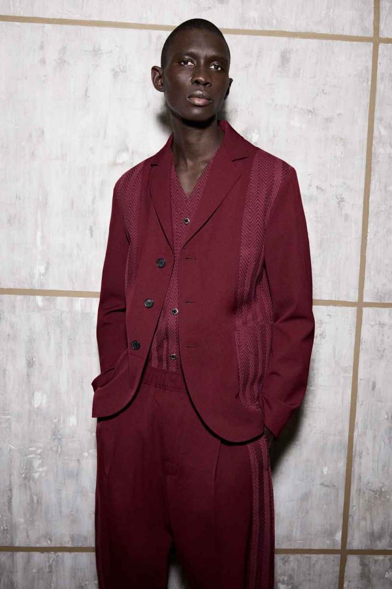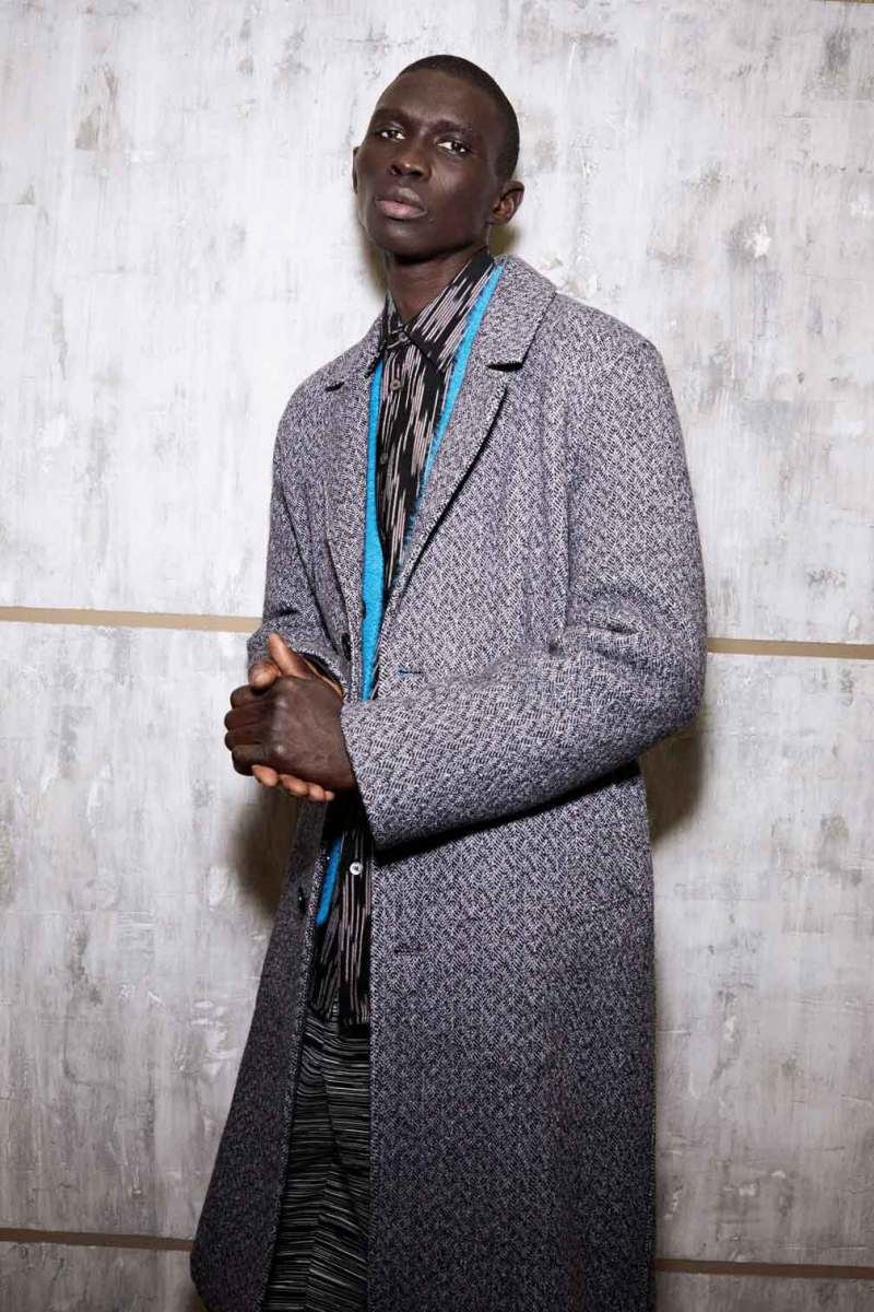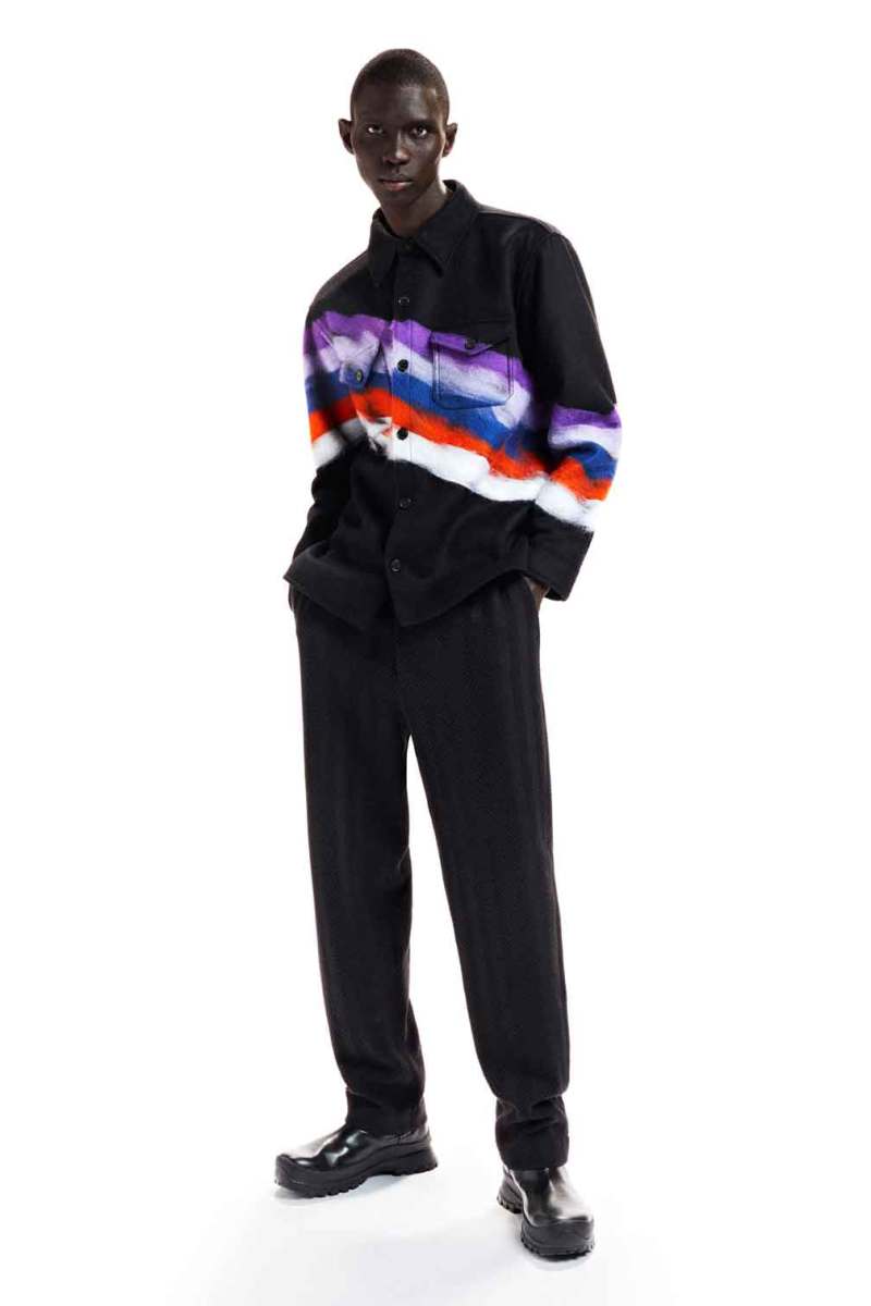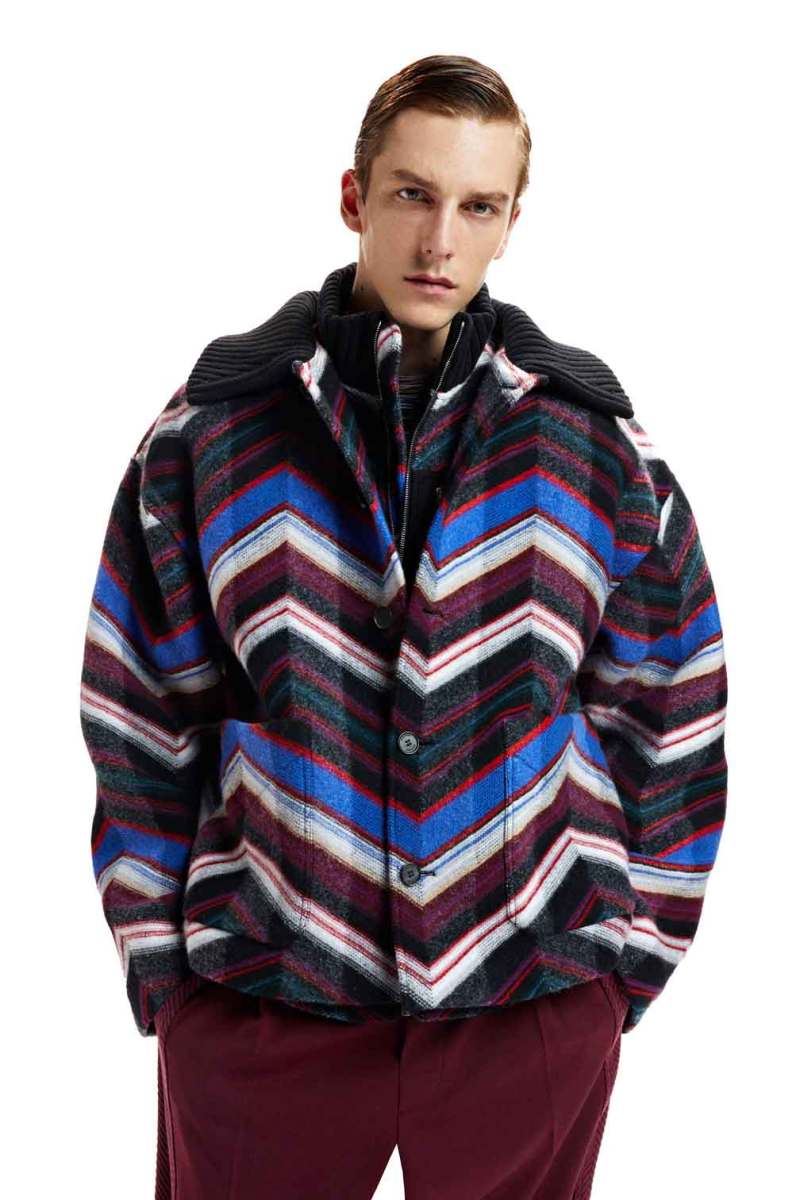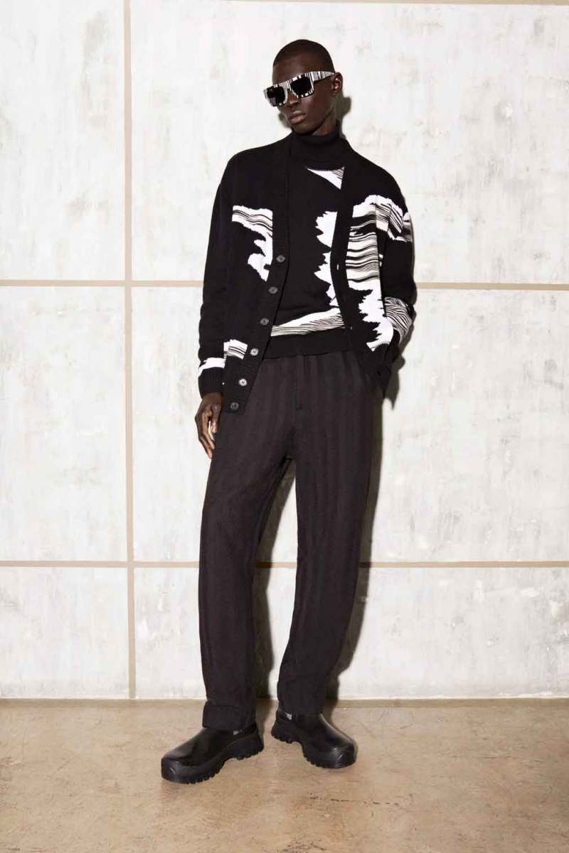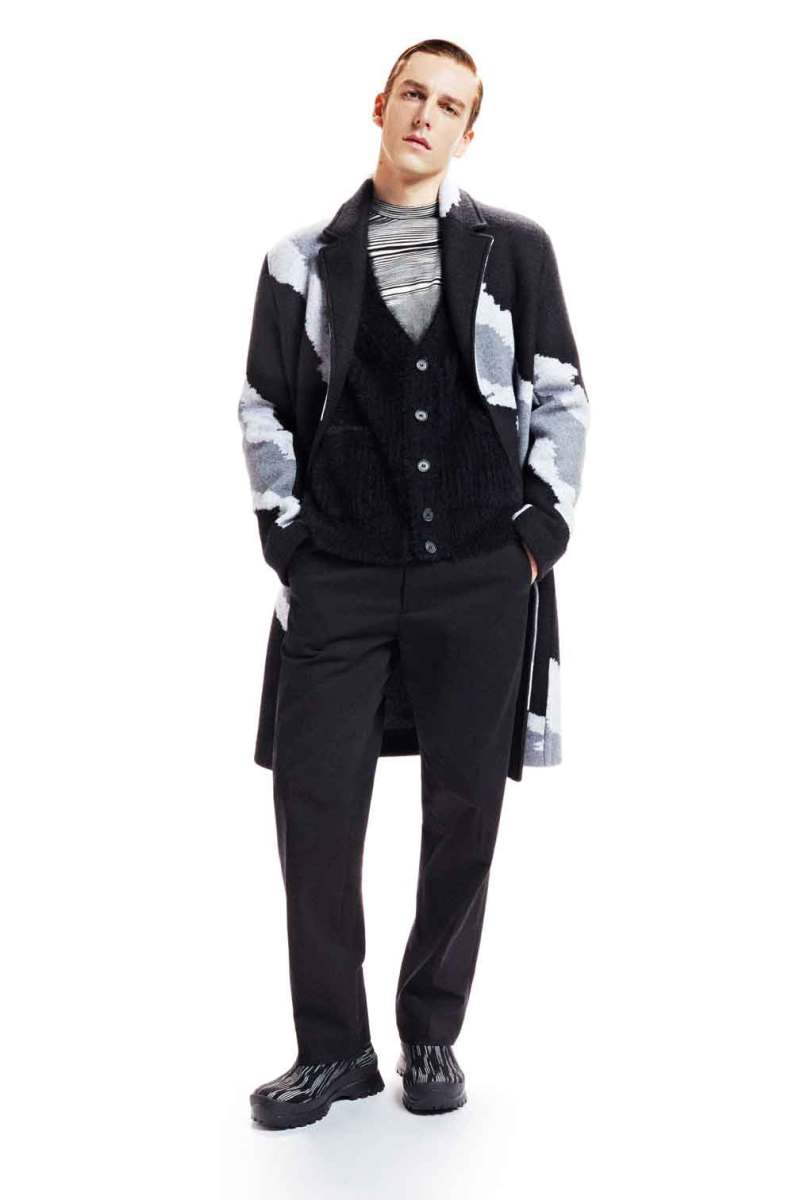 Le forme ricercate in questa collezione sono silhouette sciolte per liberare il corpo dalle mode troppo consistenti, valorizzando le caratteristiche di un capo presentandolo però nella sua basicità. Torna così la vestibilità oversize, maglieria morbida che abbraccia il corpo maschile, abiti che hanno un richiamo alle linee delle tute, scarpe comode. I motivi sono ovviamente quelli che richiamano subito il mondo Missoni: fiammato, zig-zag, strisce, intarsi e l’iconico chevron. Una grande innovazione la si trova nel trattamento delle superfici dei capi in denim, dove i temi del fiammato e dello zig-zag s’intrecciano dando vita a un tema ondulato ton-sur-ton. I colori sono invece più tenui, spesso la base utilizzata è il bianco o il nero, ma troviamo anche colori pastello, il beige, il blu, mentre il tocco di colore viene dato dal bordeaux e dal ruggine.