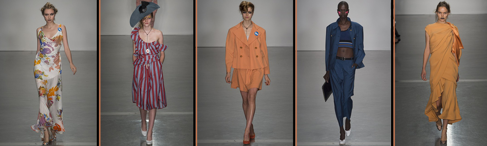 Dopo i primi modelli, fanno la comparsa i colori della terra, abiti slim e sinuosi e gonne morbide a righe, strette in vita da una cintura, con uno stile bohemien, che sembra quasi non studiato.