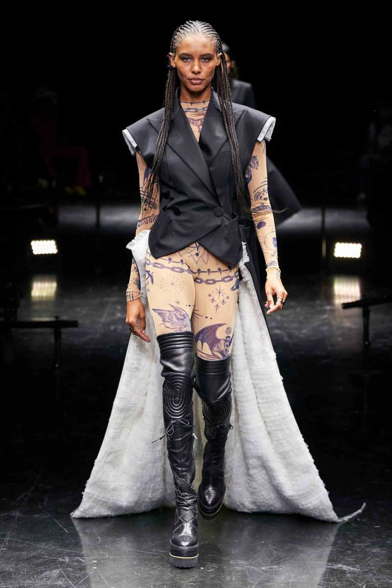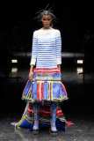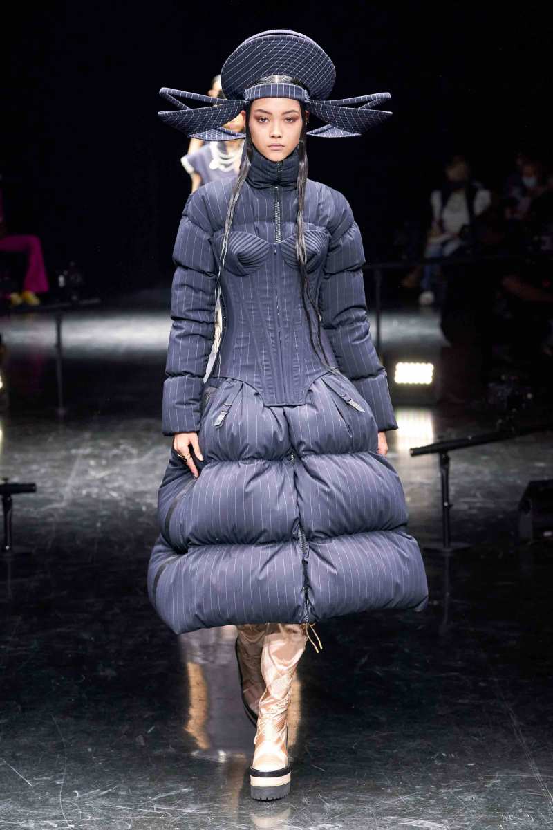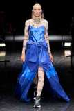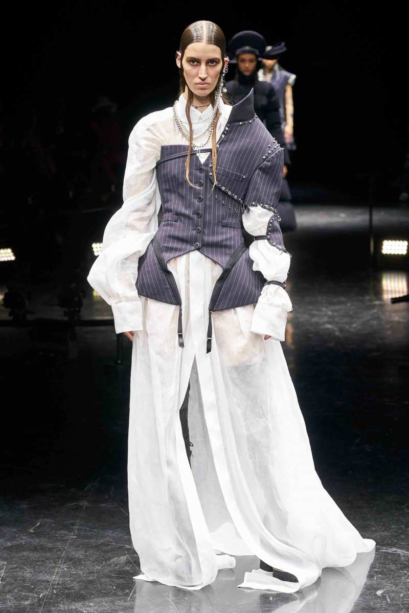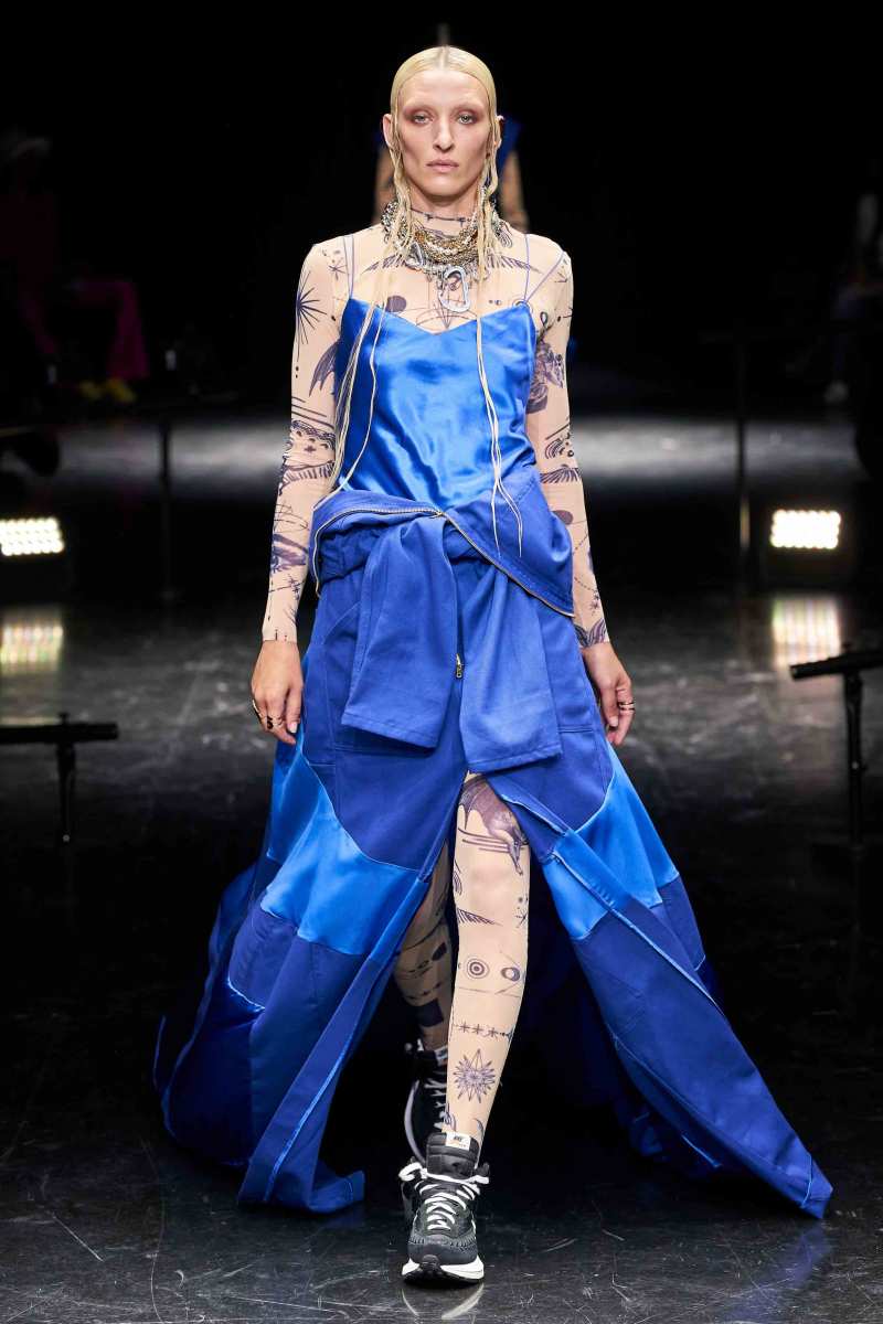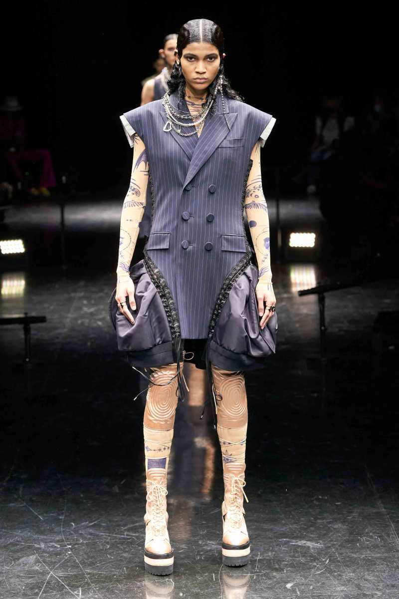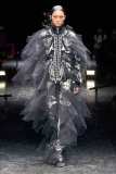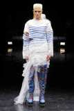 Alcuni abiti sono in maglia chiara e presentano un grande lavoro artigianale. Immancabili i classici della maison, come i bustier con coppe dei reggiseni a punta alla “marinière” e la giacca con bottoni dorati da ufficiale. Eleganti sono i capi in gessato blu e particolari quelli con stampe tattoo di Dr Woo come il vestito con tulle.