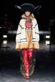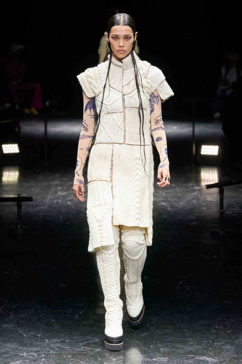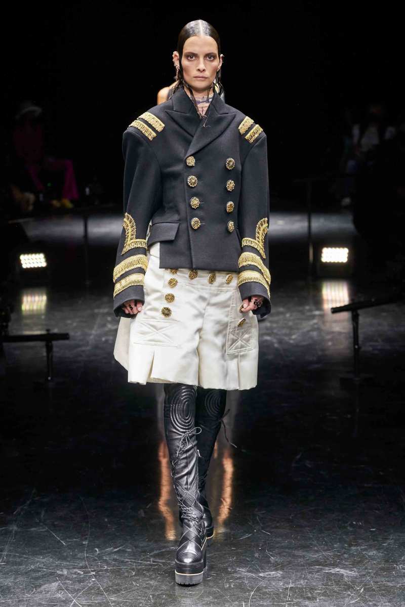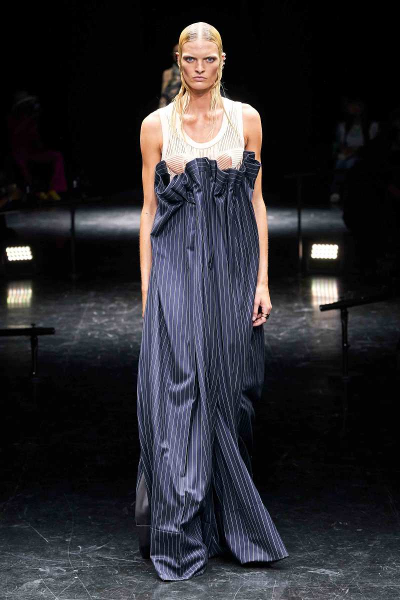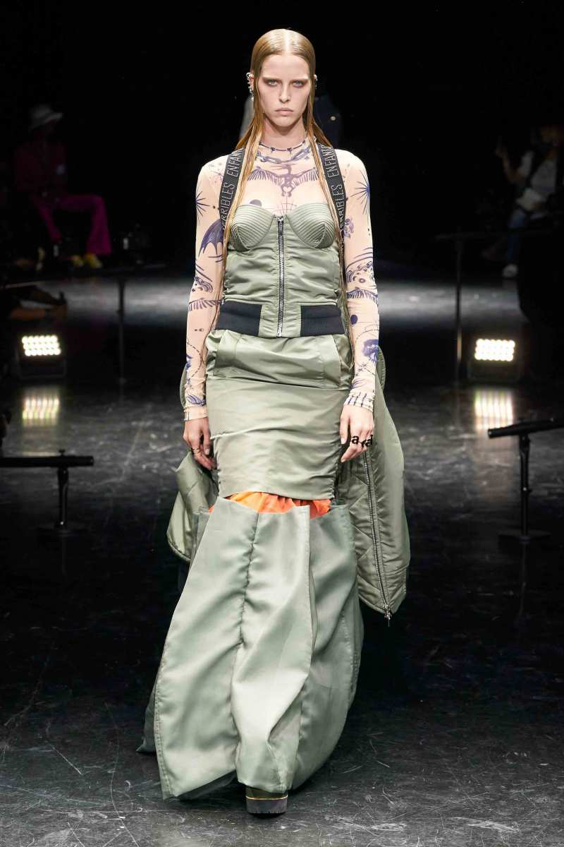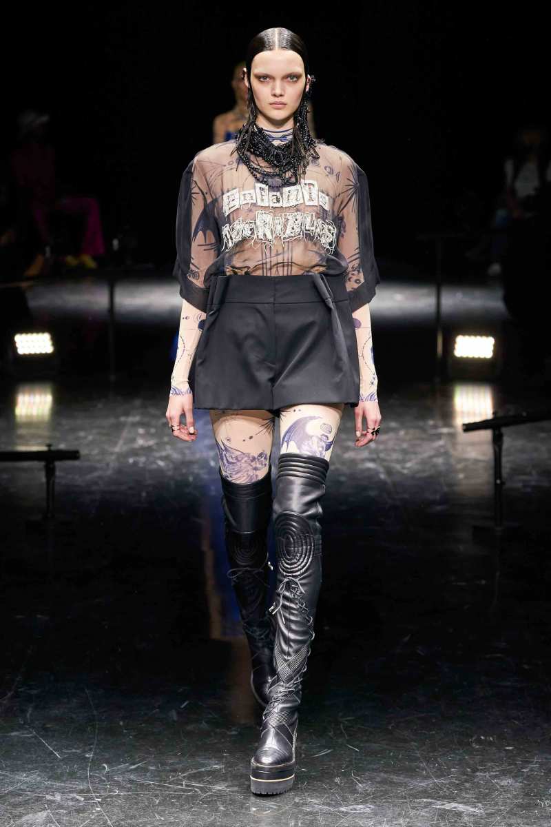 Alcuni abiti sono in maglia chiara e presentano un grande lavoro artigianale. Immancabili i classici della maison, come i bustier con coppe dei reggiseni a punta alla “marinière” e la giacca con bottoni dorati da ufficiale. Eleganti sono i capi in gessato blu e particolari quelli con stampe tattoo di Dr Woo come il vestito con tulle.