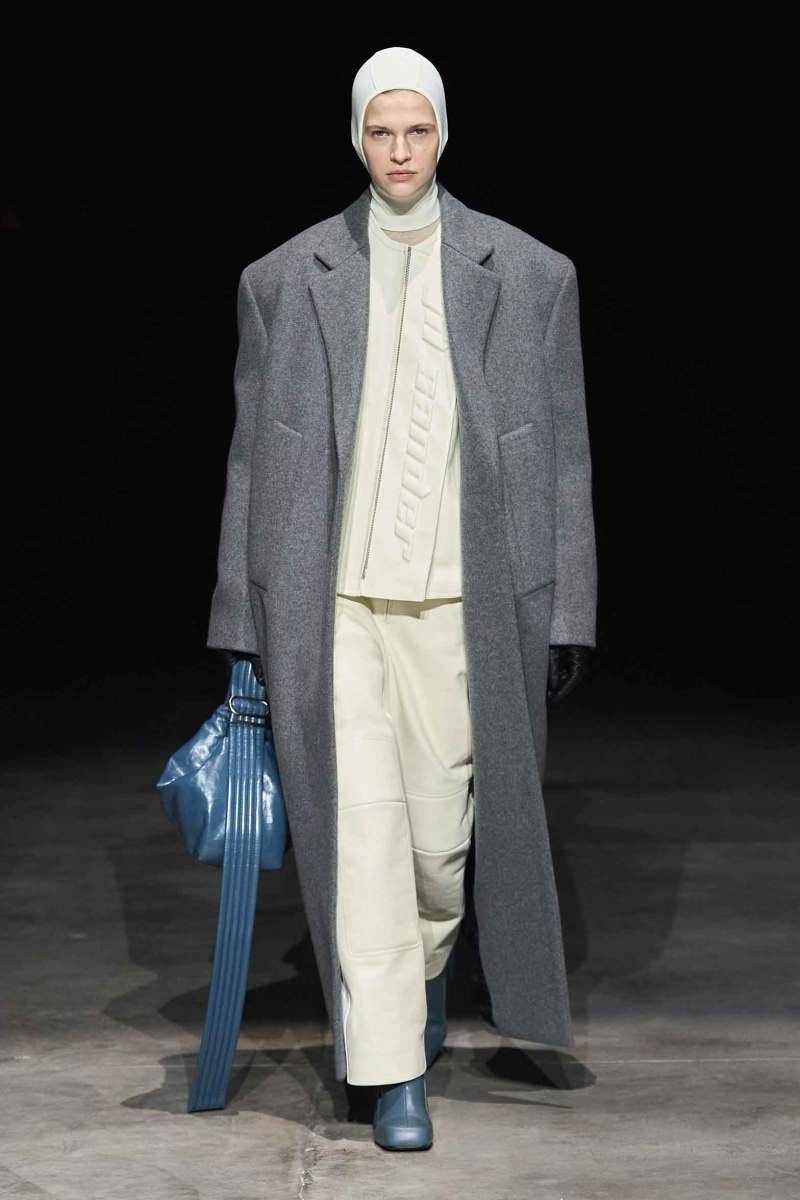 Per la nuova collezione AI 2023-24, Jil Sander pensa a una stagione dominata dal genderless e dall’unione dei vari stili e delle diverse funzioni degli abiti. L’incipit della sfilata è molto strong, con una giacca motociclistica in pelle bianca e nera con logo in evidenza, i pantaloni abbinati e i guanti rossi.