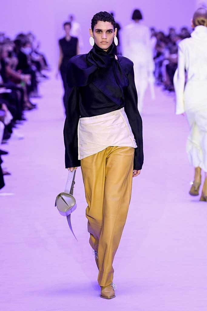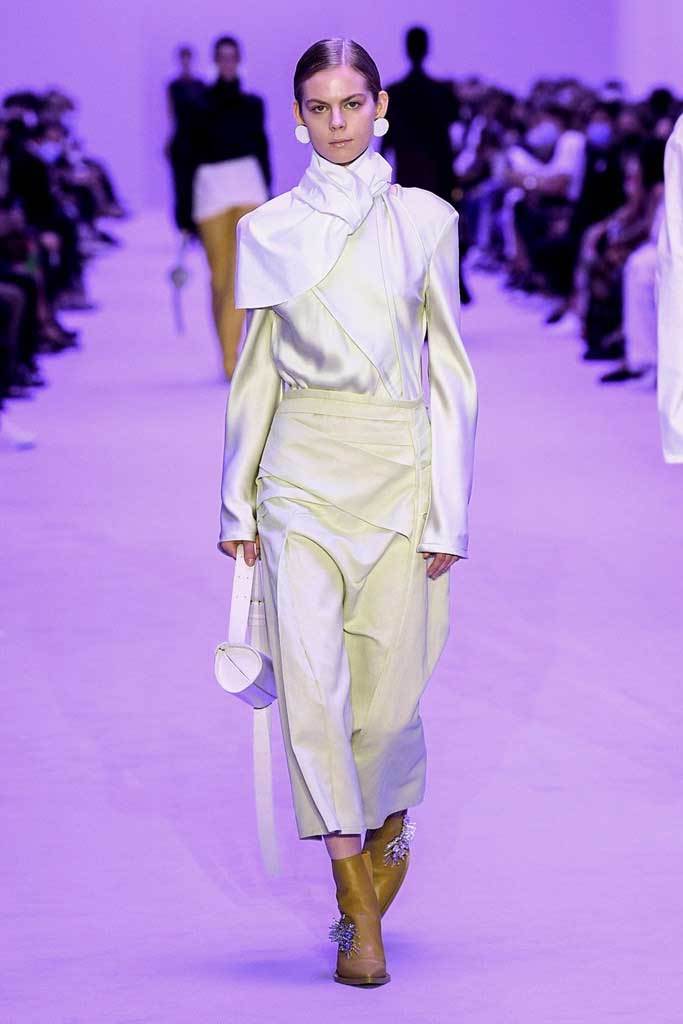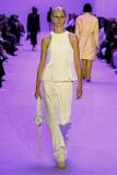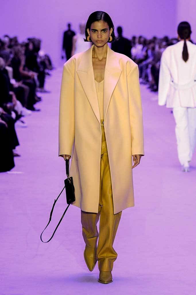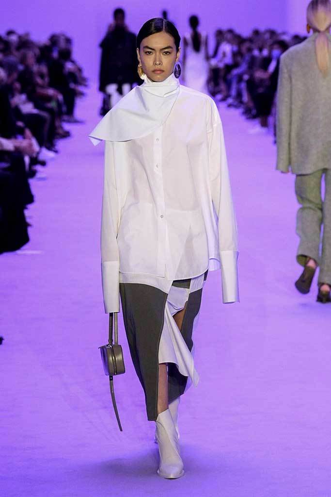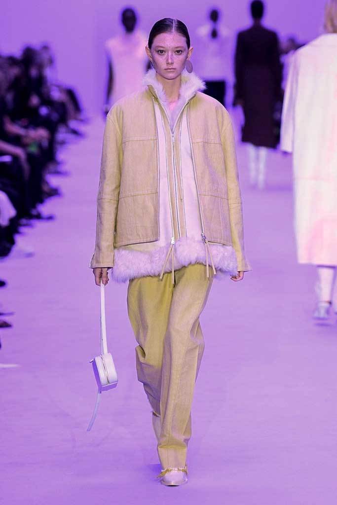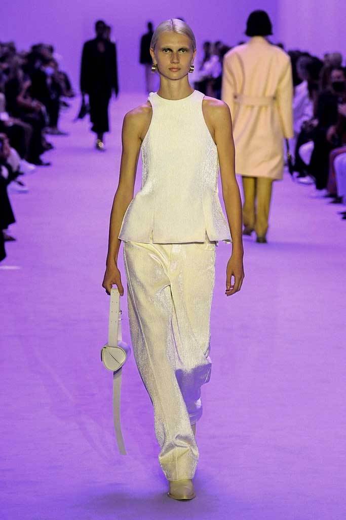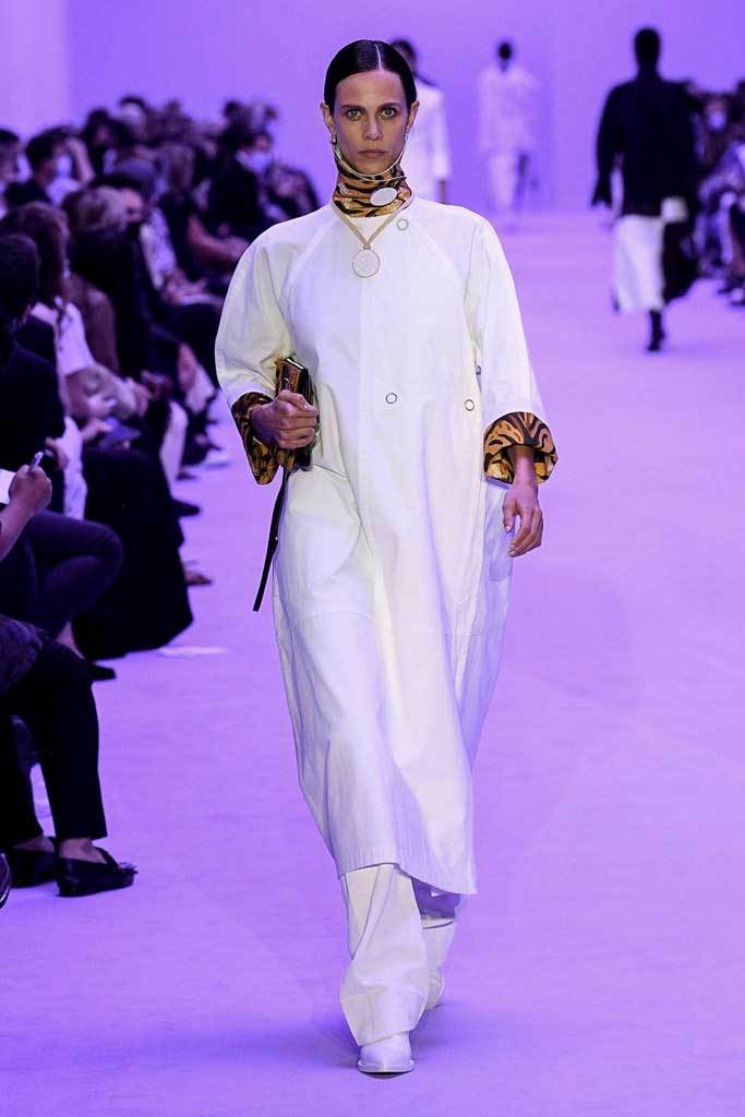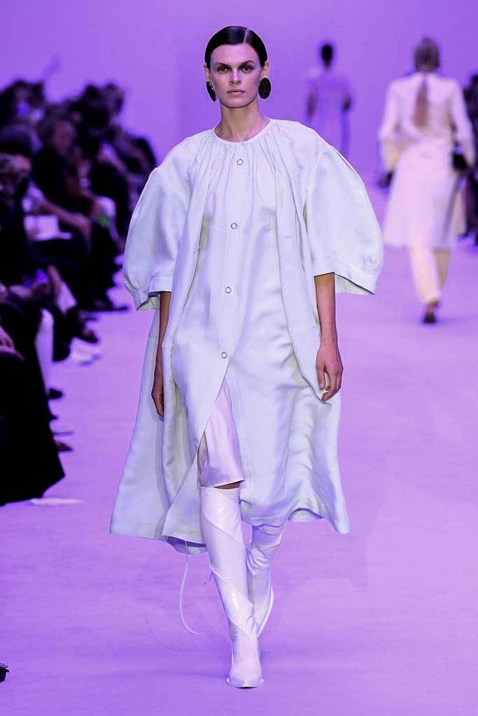 «Abbiamo giocato sui contrasti tra rigidità e fluidità, durezza e morbidezza, maschile e femminile» spiegano i Meier. Una collezione meno fredda e più connessa, più incline alla vita reale e quotidiana. La passerella si è aperta con una serie di giacche oversize senza revers abbinate a pantaloni in lino.