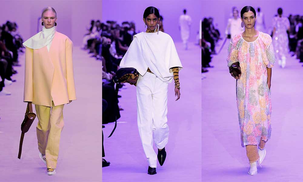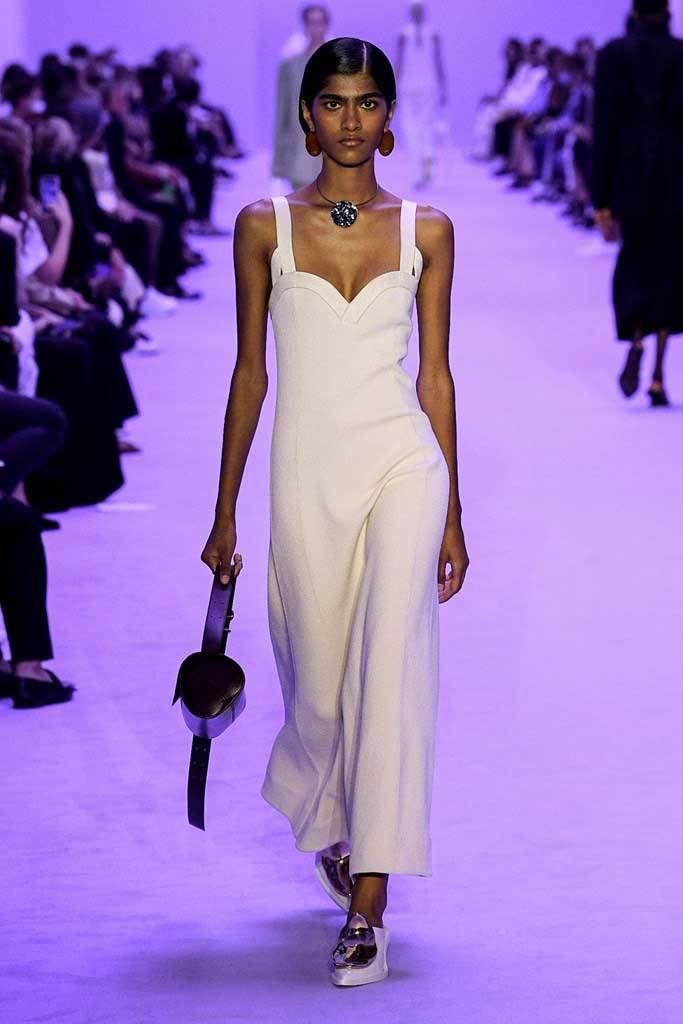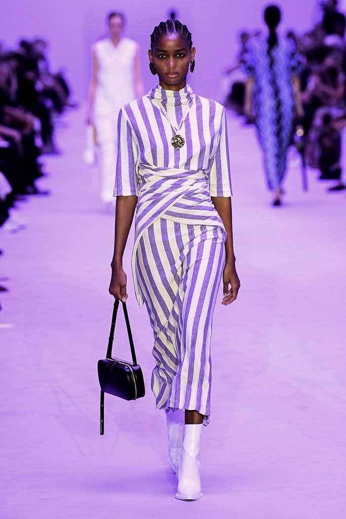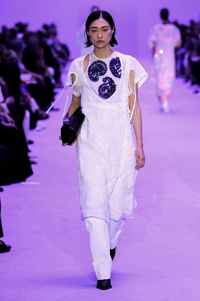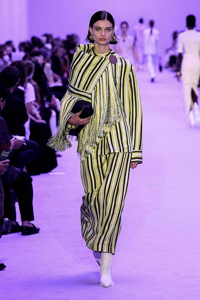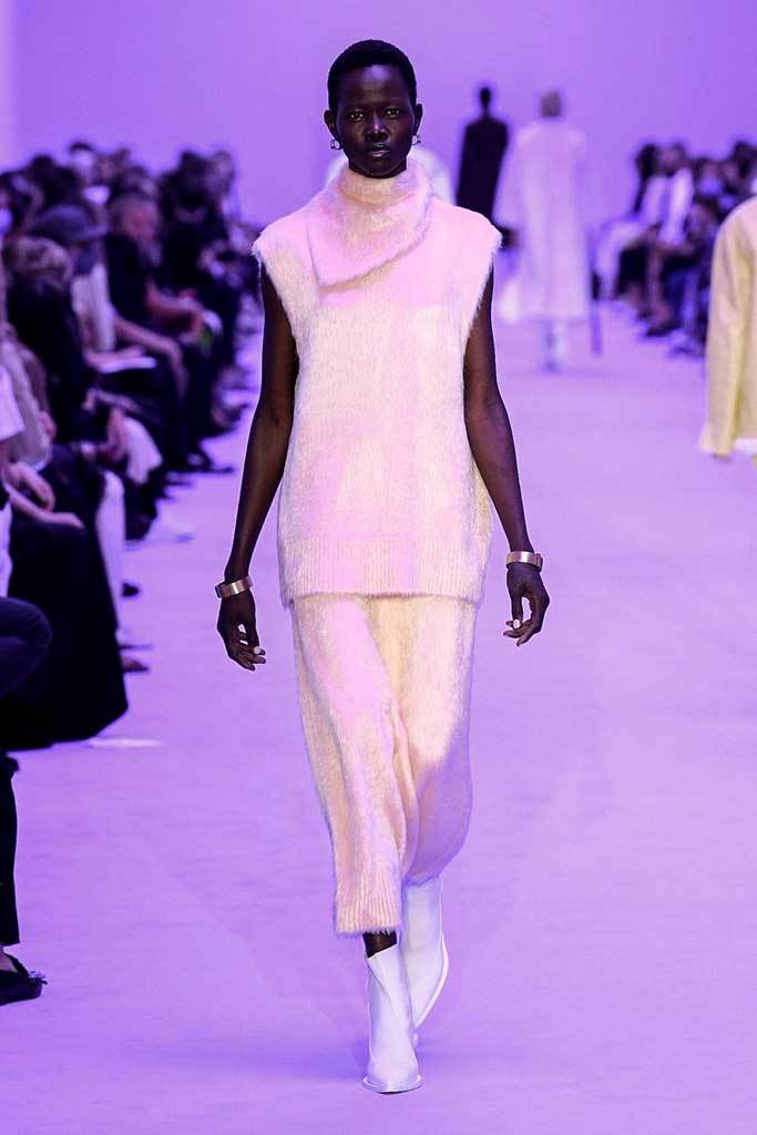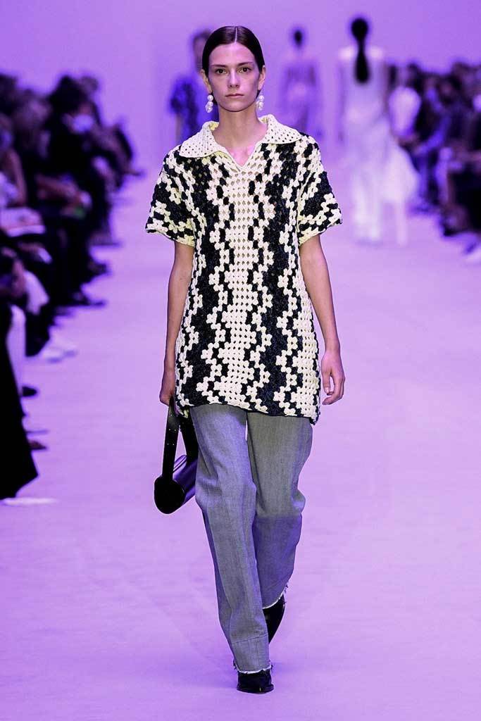La cosa che forse più ci sorprende della nuova collezione (e della nuova visione creativa) di Jil Sander è la tavolozza cromatica. Se nelle precedenti stagioni la palette era strutturata intorno al bianco e al nero, per la SS22 non sono mancati colori brillanti e sfumature pastello. Presenti anche giochi di fantasie: righe colorate, motivi a uncinetto e fiori, oltre a una divertentissima stampa paisley ricamata in paillettes.