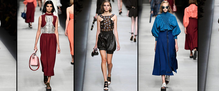 Un tocco aggressive e femminile è dato da abbinamenti di capi completamente in pelle come pantaloni coordinati a maxi giacche con revers a lancia indossate senza nulla sotto. Ricorre in molte uscite la pelliccia utilizzata in alcuni casi come inserto per creare contrasti materici in altri come elemento di decoro sulle spalle per accentuarne il volume.