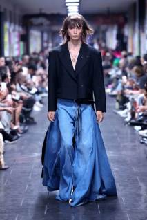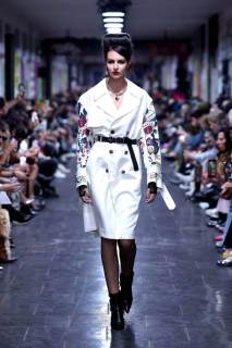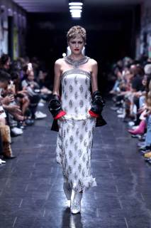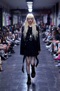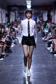 Un rimando fondamentale è agli anni Settanta e Ottanta; non a caso, in sottofondo c’è la musica rock tipica di quel periodo. Tutti i look presentati sono dinamici, in movimento e vintage. Immancabili le giacche con spalle ampie, le gonne maschili, suit, micro top, cinture borchiate; a mantenere desta l’attenzione dello spettatore, i contrasti black & white.