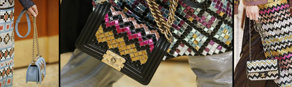 La collezione invernale firmata dalla maison francese torna a celebrare le mini bag in pelle, con lavorazione matelassè, in vesti glitterate più estrose e in nuances più intense come il blu. Le shoulder bag con manico a catena, una delle forme più amate dalla griffe, nella forma rettangolare più classica, in vesti multicolor con decori in stile mosaico e in quelle bicolor nel più tradizionale e amatissimo black & white.