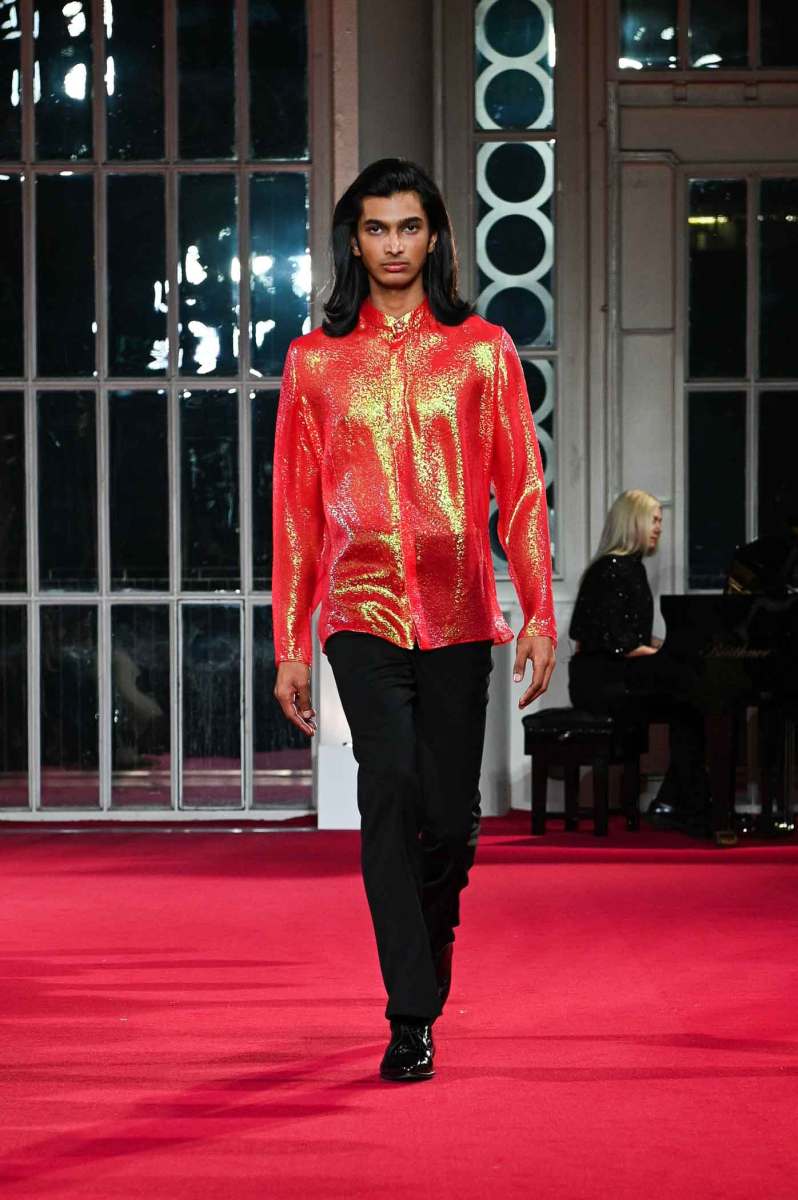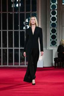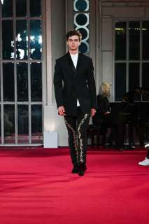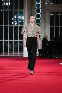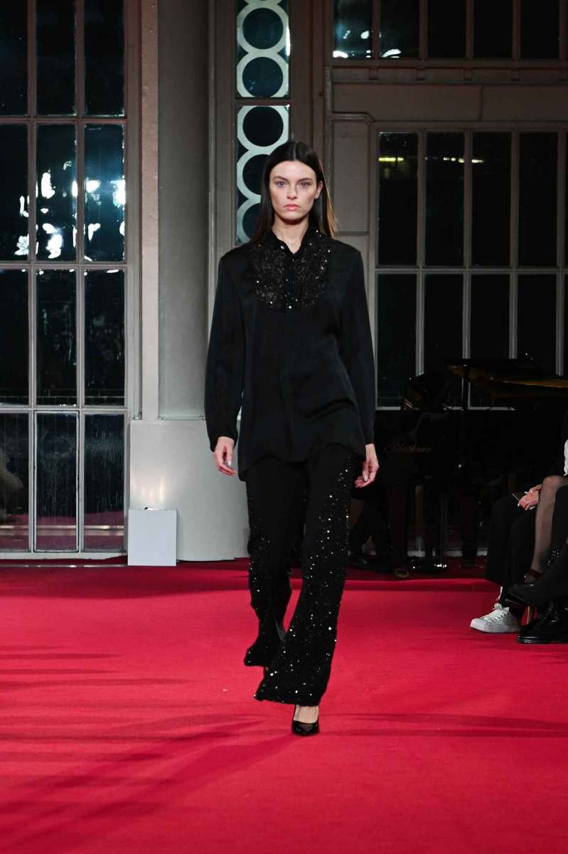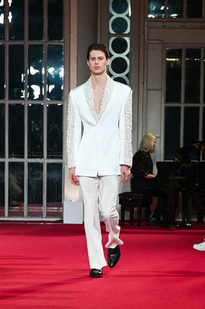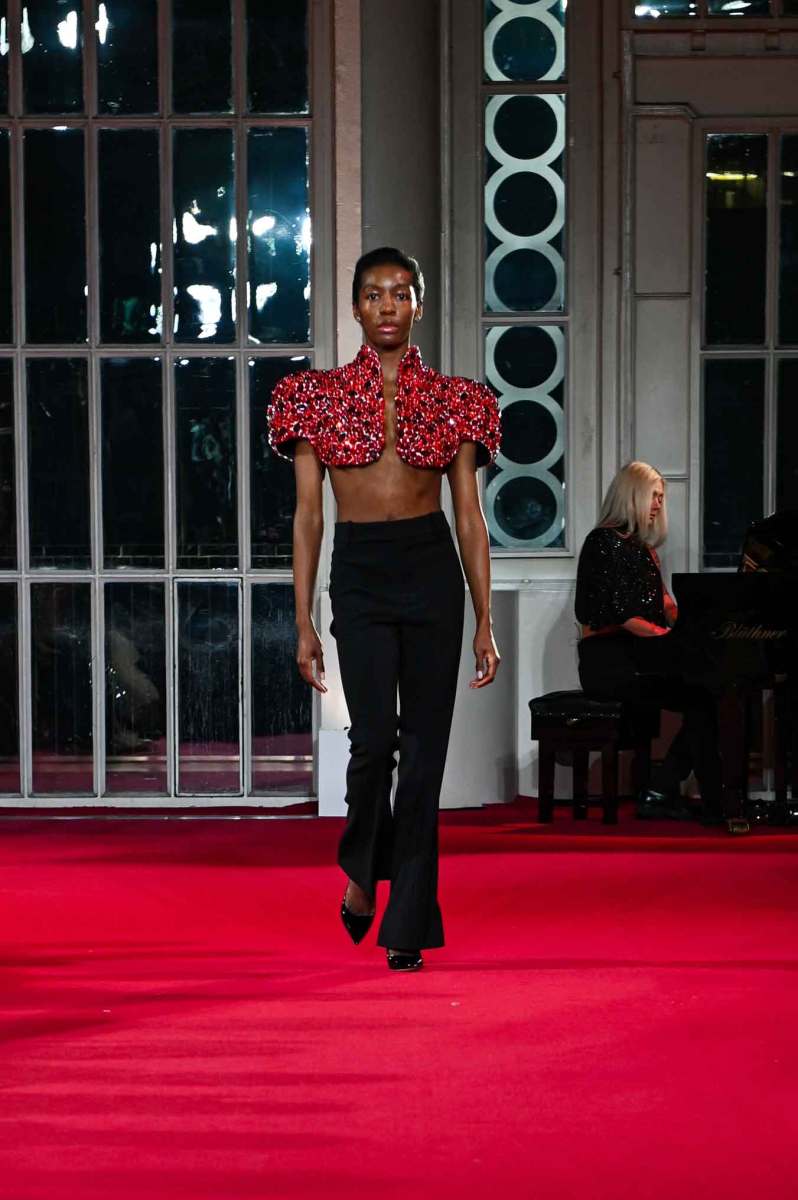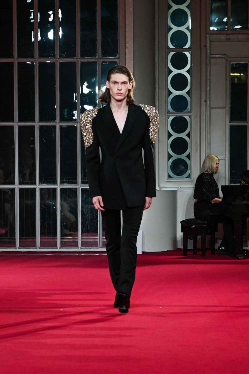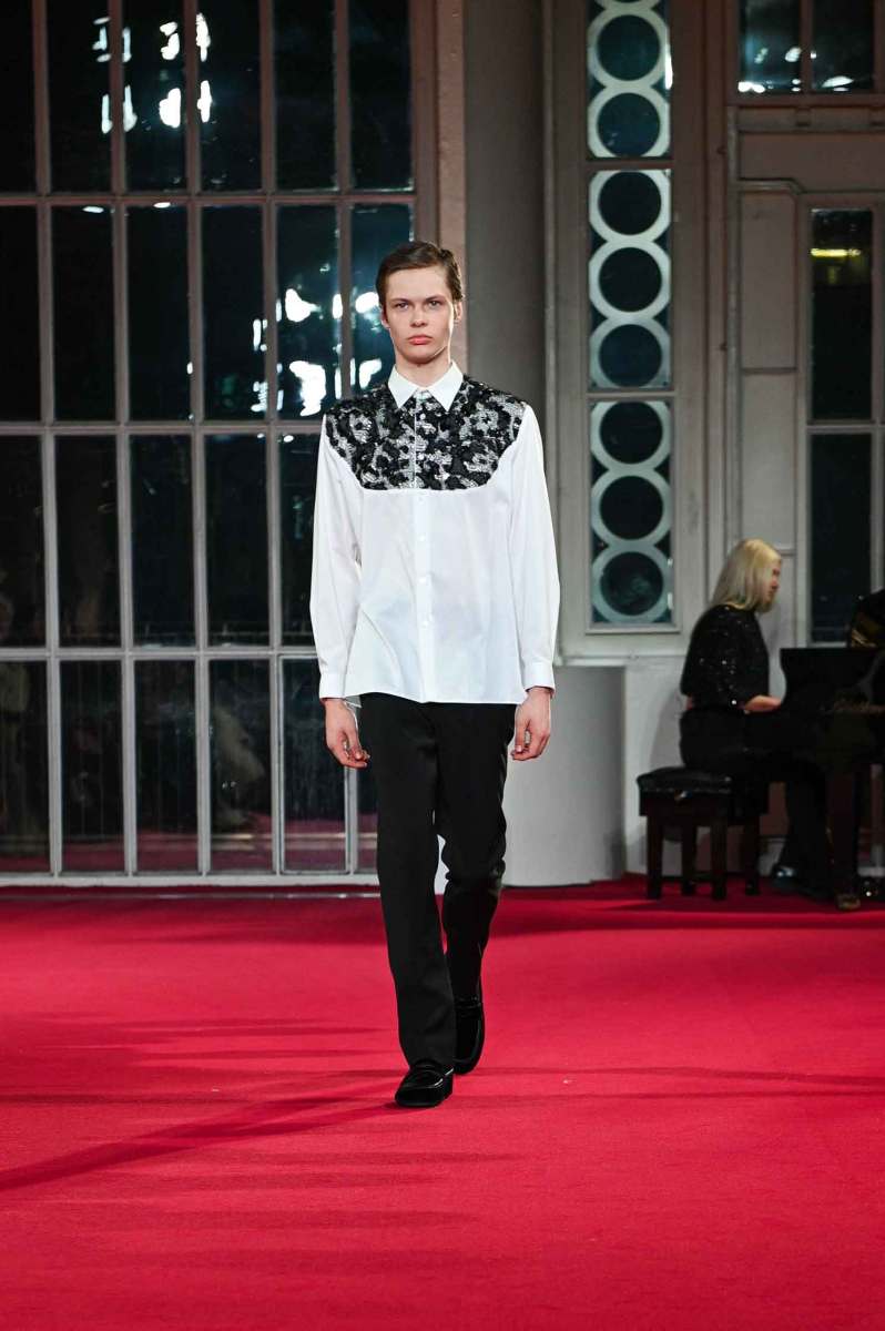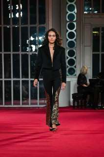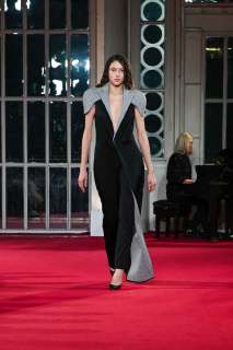 I vari capi mettono in evidenza l’artigianato couture della casa grazie a pezzi intricati e sapientemente abbelliti. Vengono messe in particolare risalto le spalline, marchio di fabbrica dell’atelier, che mettono in mostra corone di rubini e di cristalli brillanti.