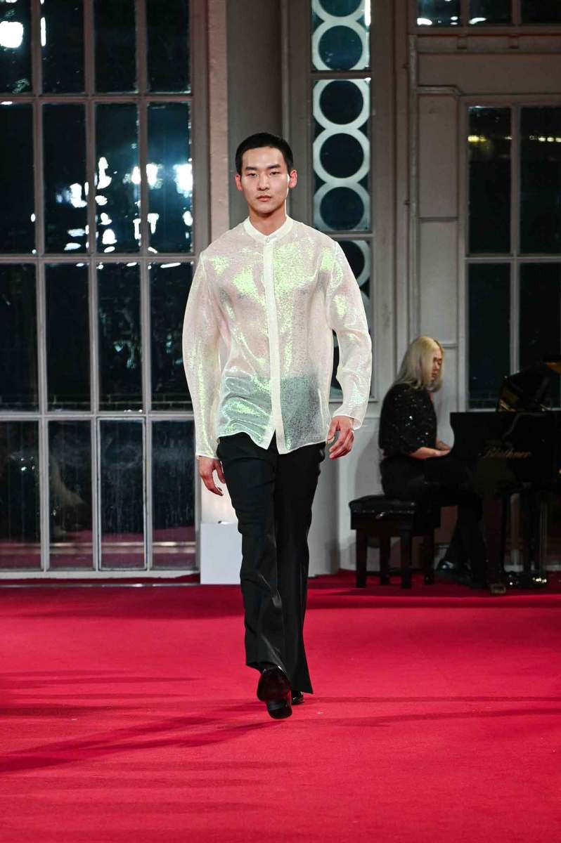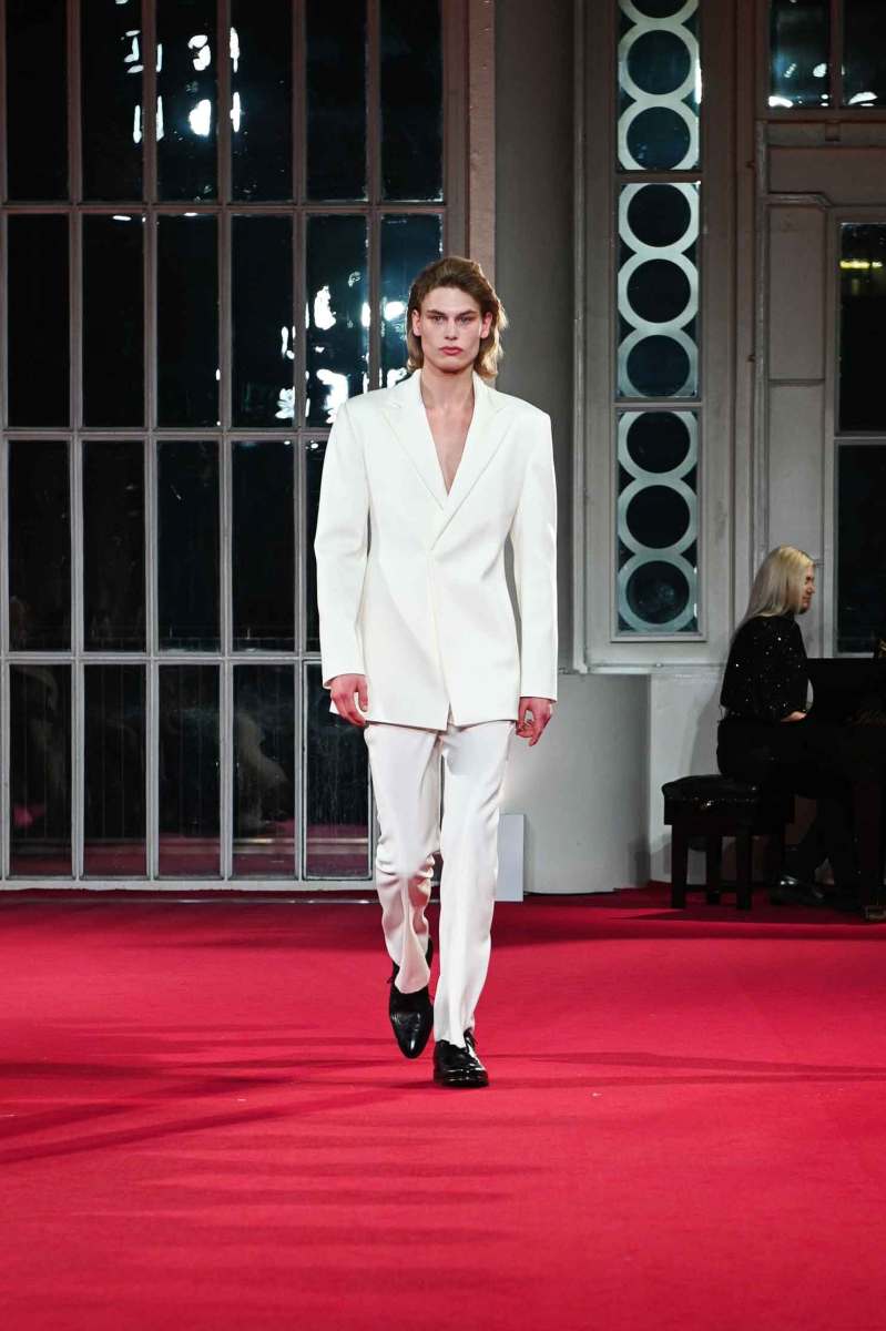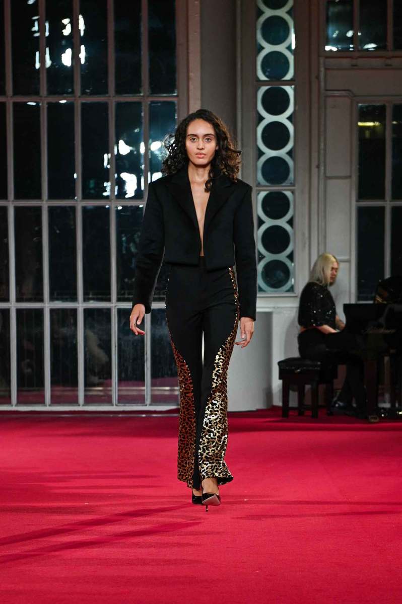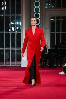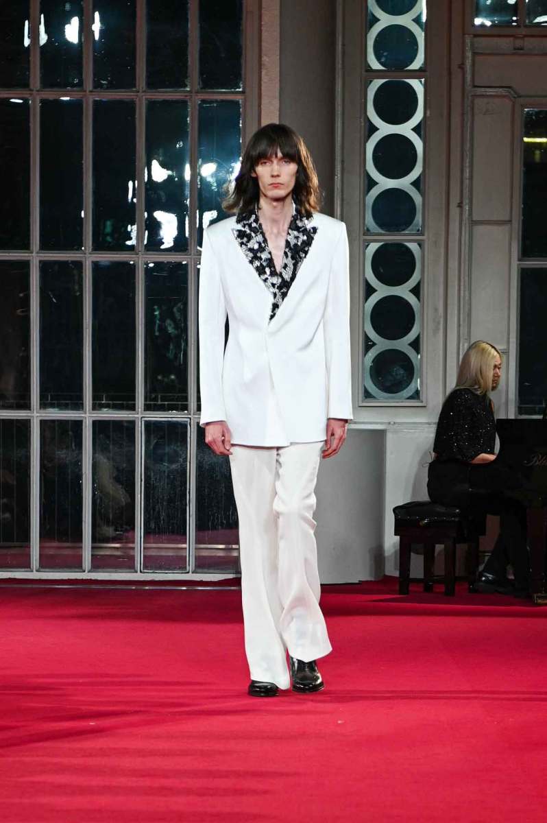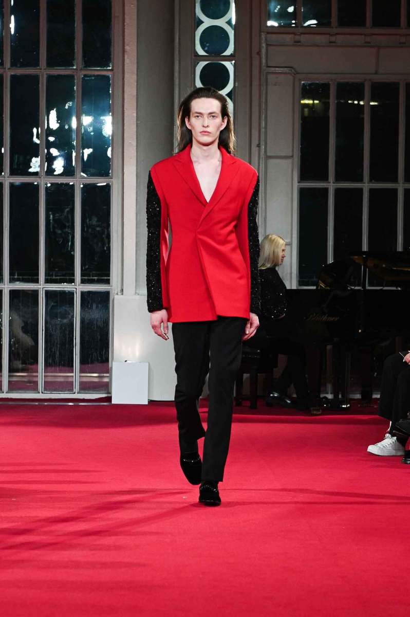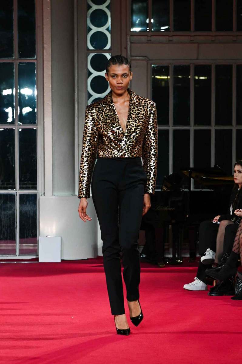 I vari capi mettono in evidenza l’artigianato couture della casa grazie a pezzi intricati e sapientemente abbelliti. Vengono messe in particolare risalto le spalline, marchio di fabbrica dell’atelier, che mettono in mostra corone di rubini e di cristalli brillanti.