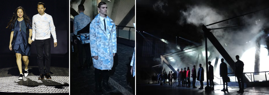 L’uomo di Kenzo ha sfilato in un’atmosfera suggestiva, con giochi di luce e macchine del fumo, tra strutture tiranti d’acciaio e nuvolette di zucchero a velo, interpretando il tema del viaggio come scoperta più profonda del sé, senza mai rinunciare ad un tayloring impeccabile. Si assiste in passerella alla presentazione di un moderno aviatore, dalla silhouette che parte dal basso, con scarponcini chiusi dalla zip, prosegue con pantaloni skinny dal taglio lineare e, infine, si allarga con giacche e cappotti delicatamente over. In una collezione votata all’estrema leggerezza, poco spazio è lasciato agli accessori, costituiti per lo più da zainetti e borse minimal. Il tutto in tessuti tecnici e colori tenuissimi, tra i quali domina il celeste baby, la tonalità del cielo, appunto; le proposte per la sera, invece, assumono tinte più scure, in una continuità di forme, tessuti e silhouettes.