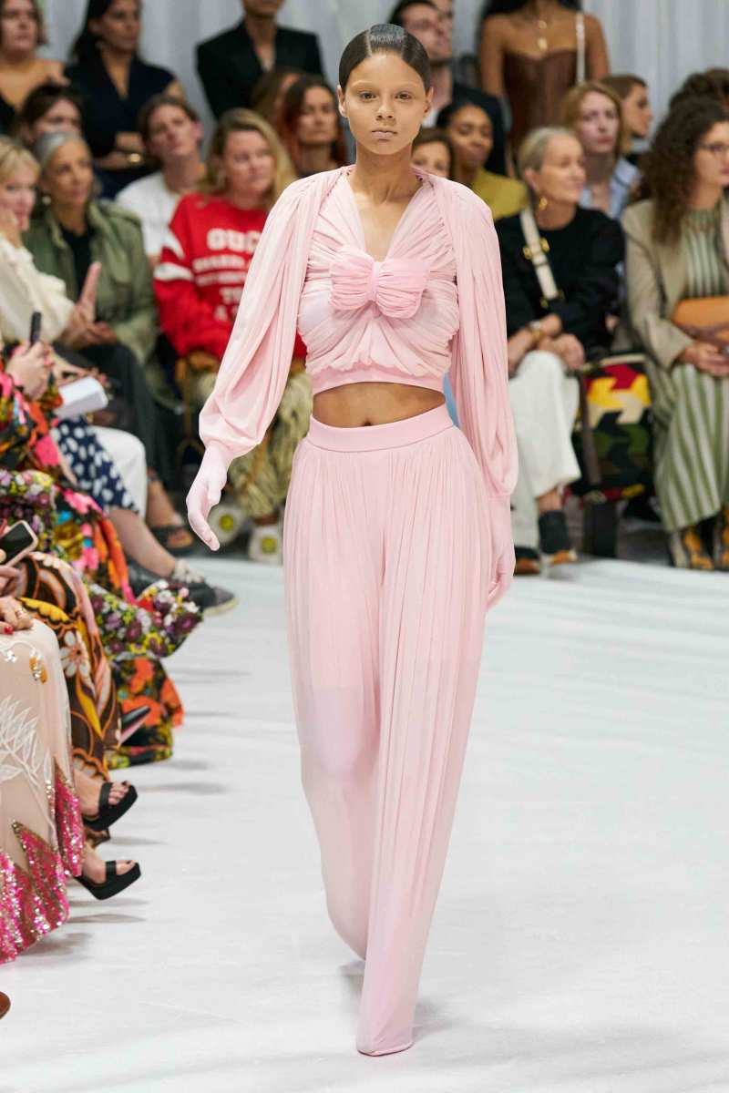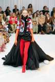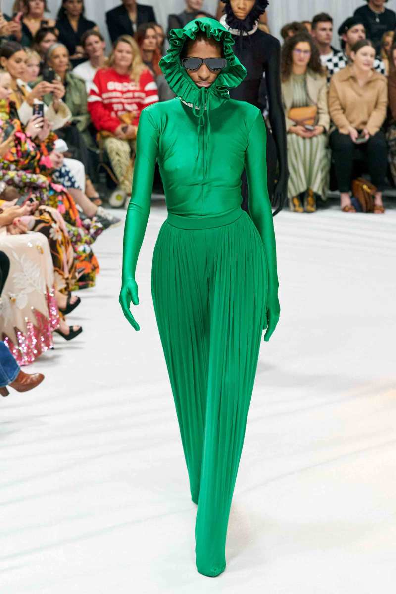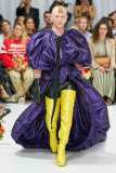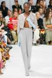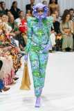 Conosciuto per le sue stampe floreali, il designer inglese ha invece stupito tutti con un look d’apertura in rosso drappeggiato. Leitmotif dei primi look della collezione è infatti un modello di pantalone plissettato dal fit morbido che ricade fino a coprire e inglobare le calzature. Sette look si sono susseguiti, in cui il nuovo modello di pantalone è stato abbinato a diversi top per un effetto monocromatico in una varietà di colori intensi: lampone, giallo neon, smeraldo, nero, rosa carne e blu.