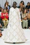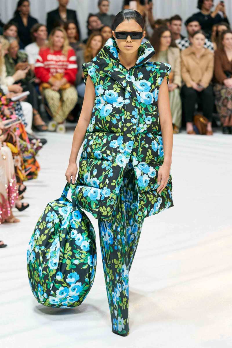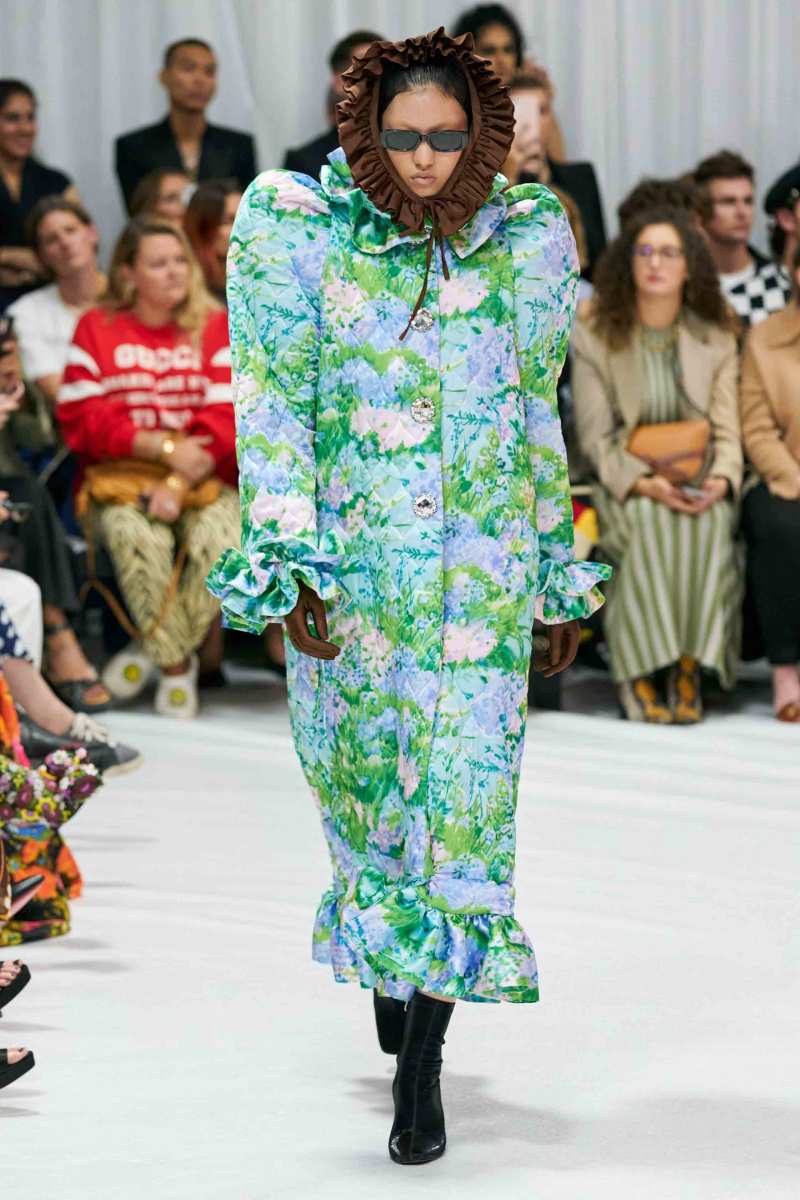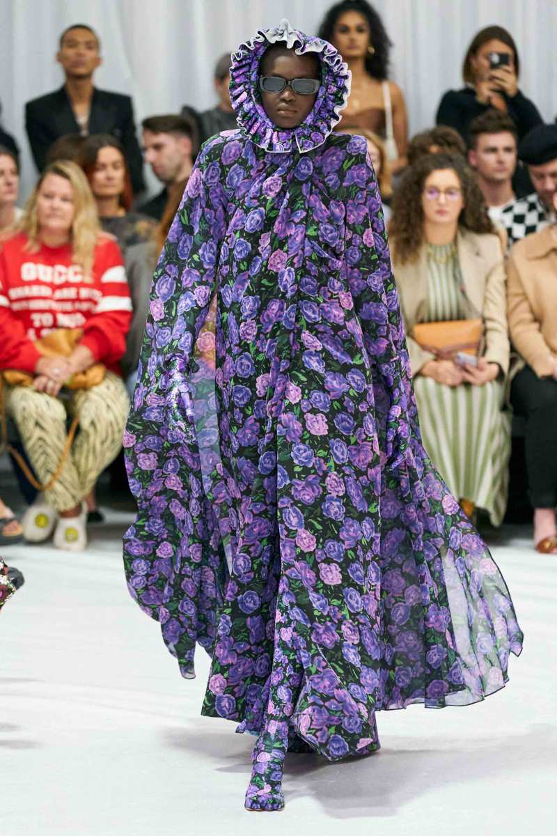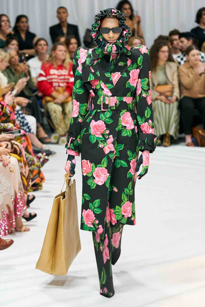 Tra le forme, si vede il ritorno delle spalle imbottite dall’effetto gotico che ricordano le creazioni di Demna Gvasalia per Balenciaga di qualche collezione fa. Ma in realtà lo stilista inglese le ha nel suo dna fin dalla collezione di debutto. Il pattern di punta è il classico di Quinn, la stampa floreale in dimensioni macro, che invade abiti e ingombranti cappotti dalle spalle ricurve e dalle rouches alle estremità.