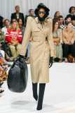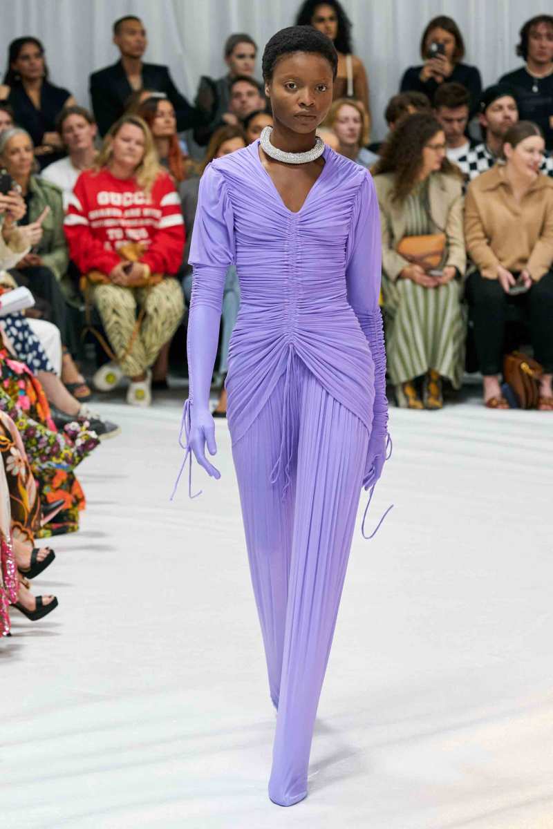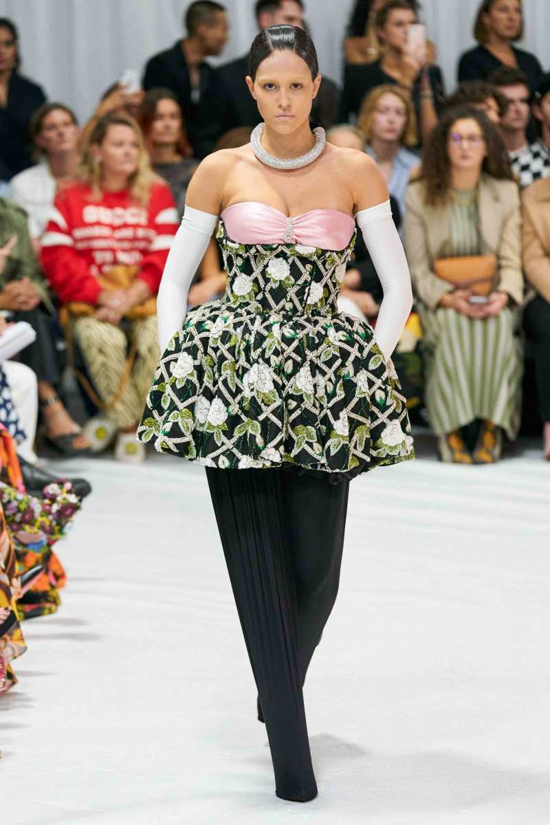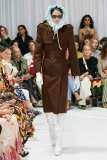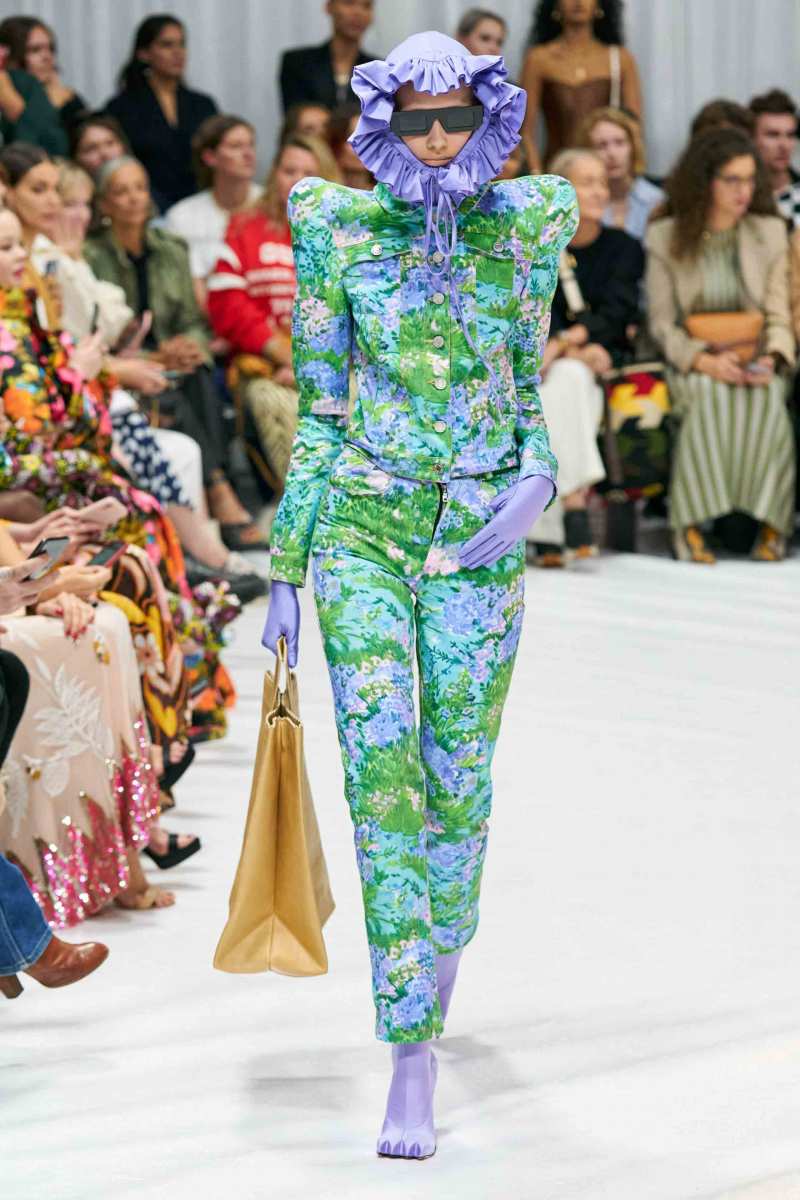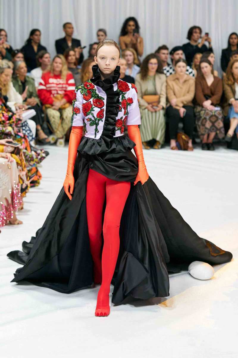 Tra le forme, si vede il ritorno delle spalle imbottite dall’effetto gotico che ricordano le creazioni di Demna Gvasalia per Balenciaga di qualche collezione fa. Ma in realtà lo stilista inglese le ha nel suo dna fin dalla collezione di debutto. Il pattern di punta è il classico di Quinn, la stampa floreale in dimensioni macro, che invade abiti e ingombranti cappotti dalle spalle ricurve e dalle rouches alle estremità.