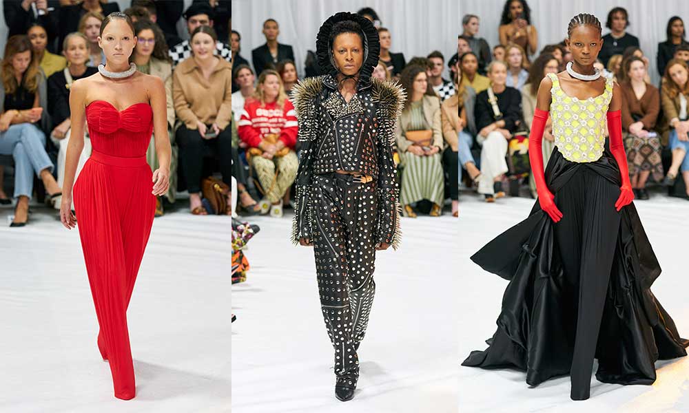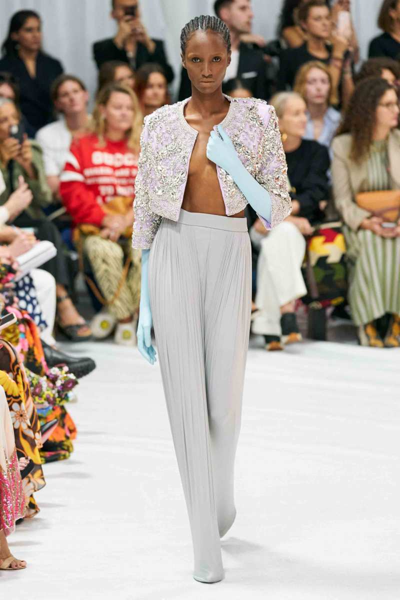 La parte finale della collezione regala emozioni da red carpet, con maestosi abiti da sera. Se sono “mini”, sono accompagnati dai pantaloni plissettati; se sono maxi, hanno un lungo strascico con un ampio spacco frontale. Non mancano i dettagli preziosi nei corpetti e nel meraviglioso abito-scultura bianco di chiusura.