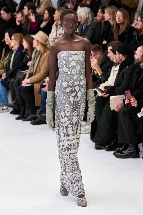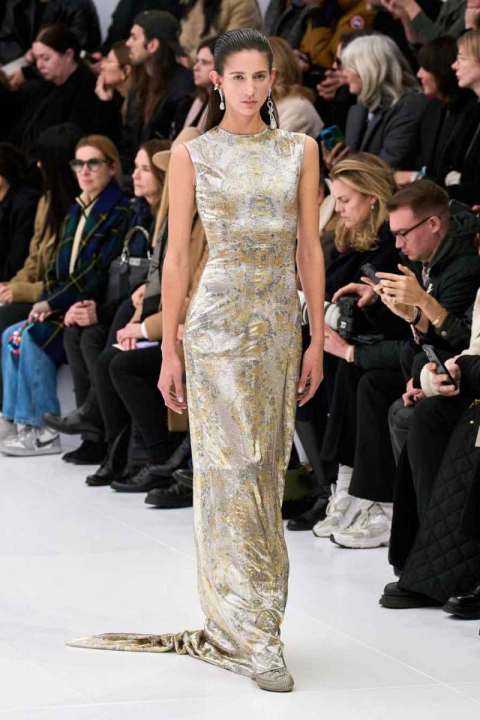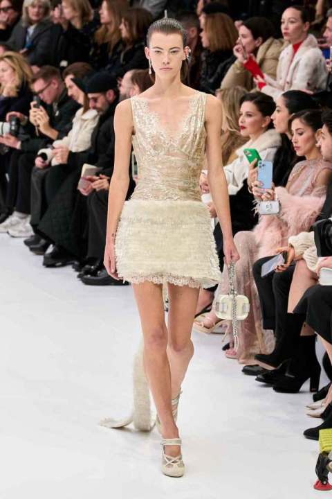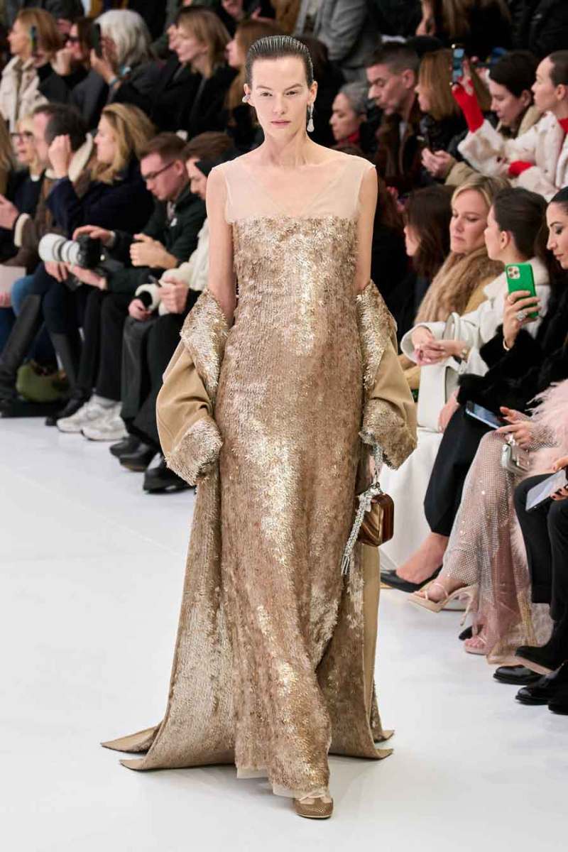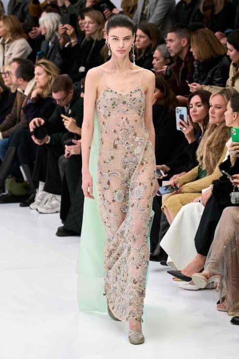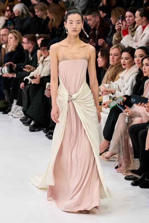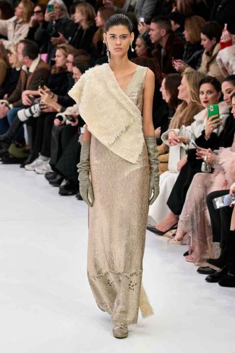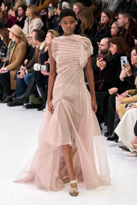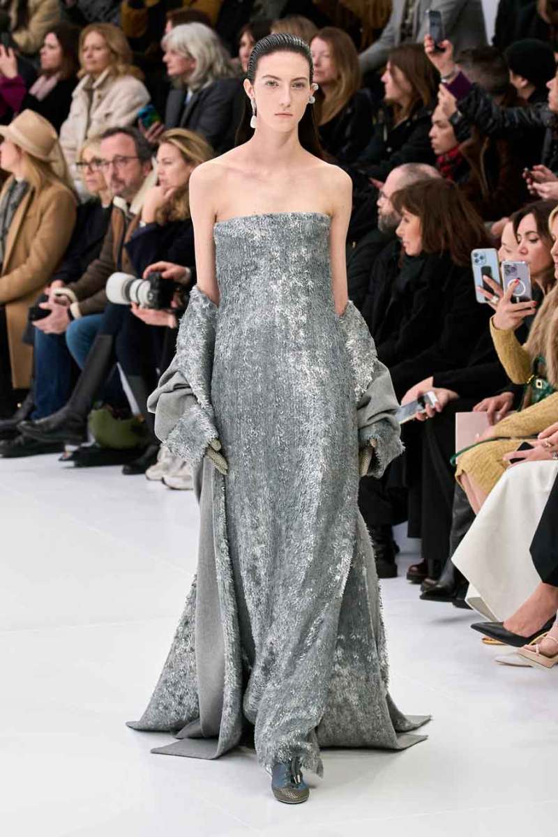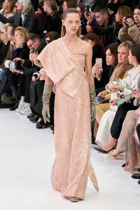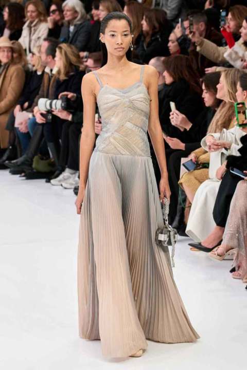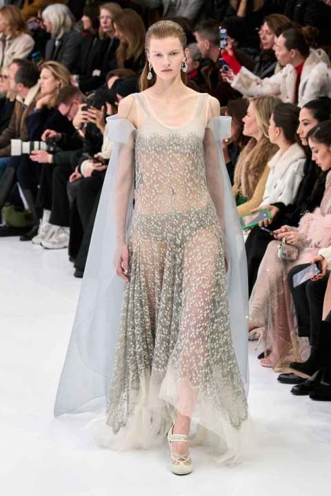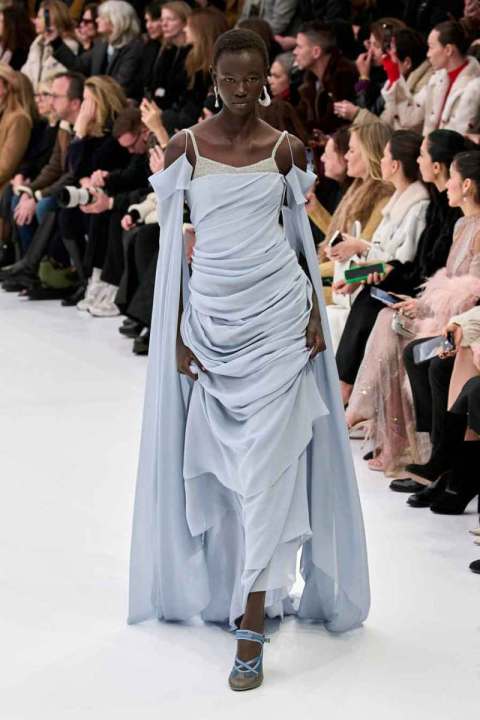 In questa sfilata l’Alta Moda è “spogliata”. Senza rinunciare allo sfarzo degli strascichi e dei lustrini, Kim Jones ci regala una collezione complessa che pure lascia un senso di “nudità”; una collezione che regala il senso di “non-finito” nel lusso più totale.