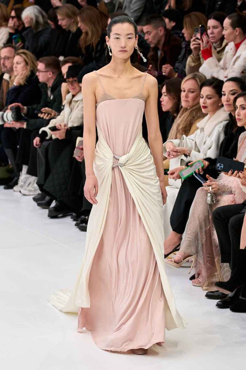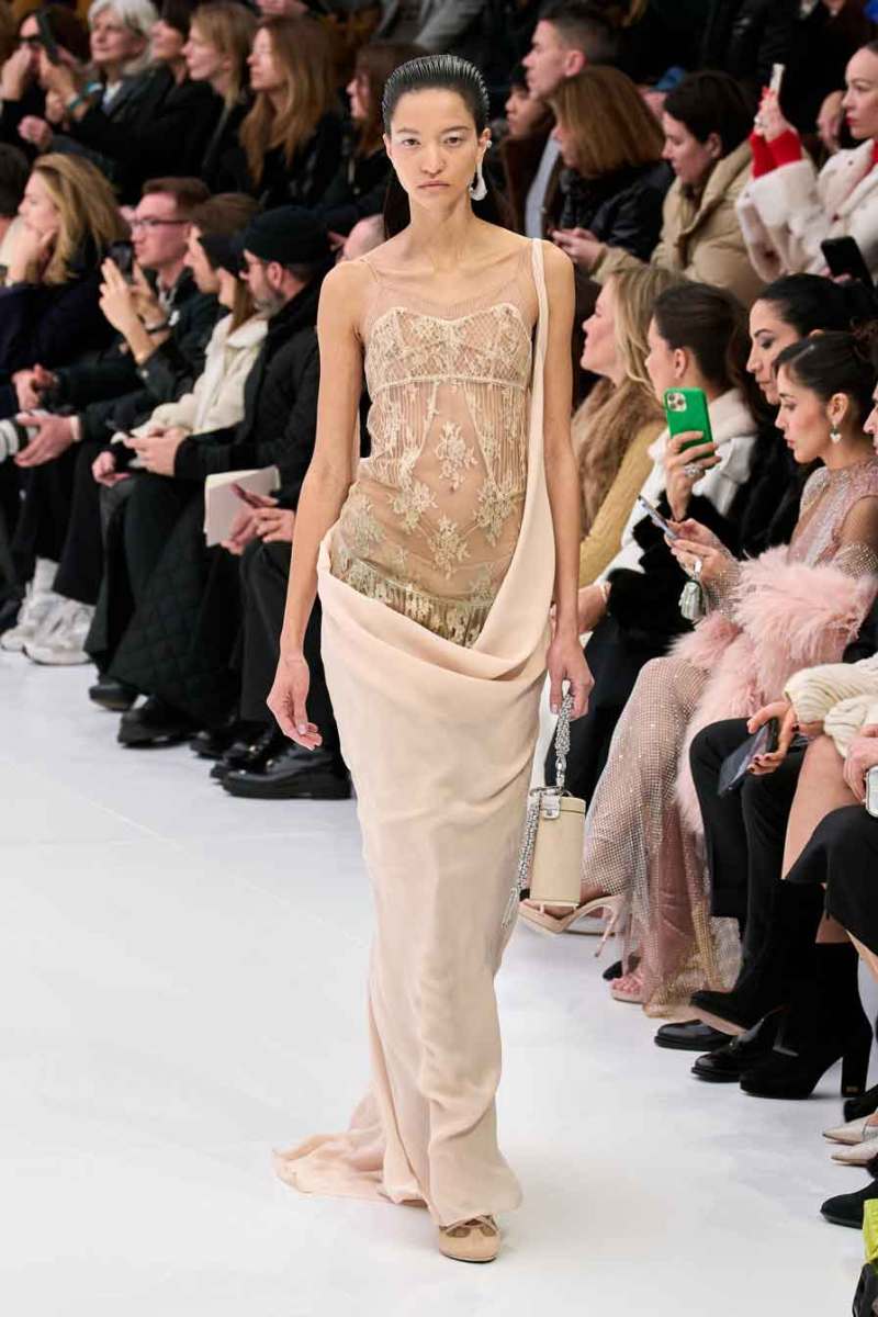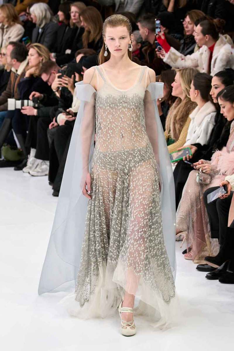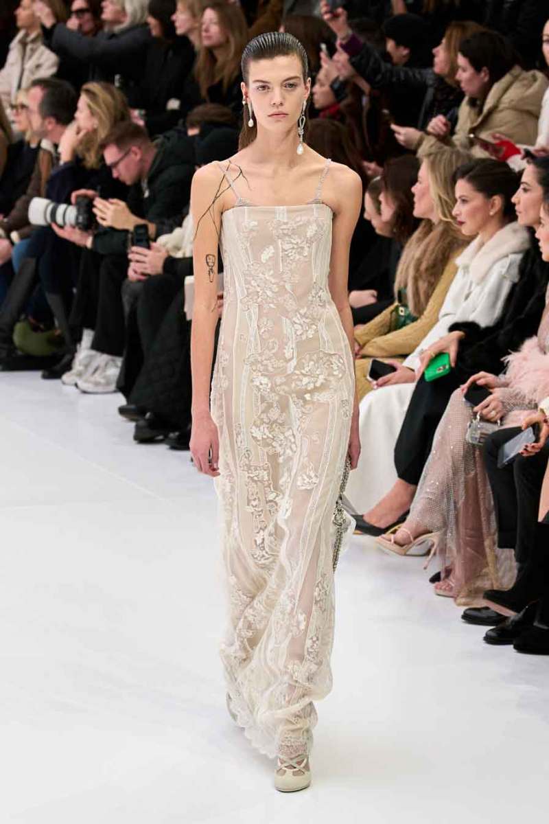 Su di una passerella circolare minimal sfila la PE 2023 di Fendi Couture. Una collezione romantica per i suoi colori tenui e le ricorrenti trasparenze. Tulle, pizzo e sete ricreano un’atmosfera serale delicata e pura. E, allo stesso tempo, gli abiti leggeri che rimandano ai capi di lingerie introducono note di sensualità. “La collezione è un mondo interiore trasformato in uno esterno – sia in senso figurato che letterale – in cui il senso di intimo diventa abito da sera”, spiega il direttore creativo Kim Jones.