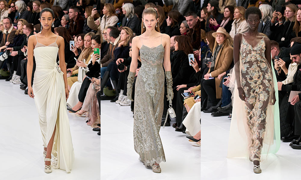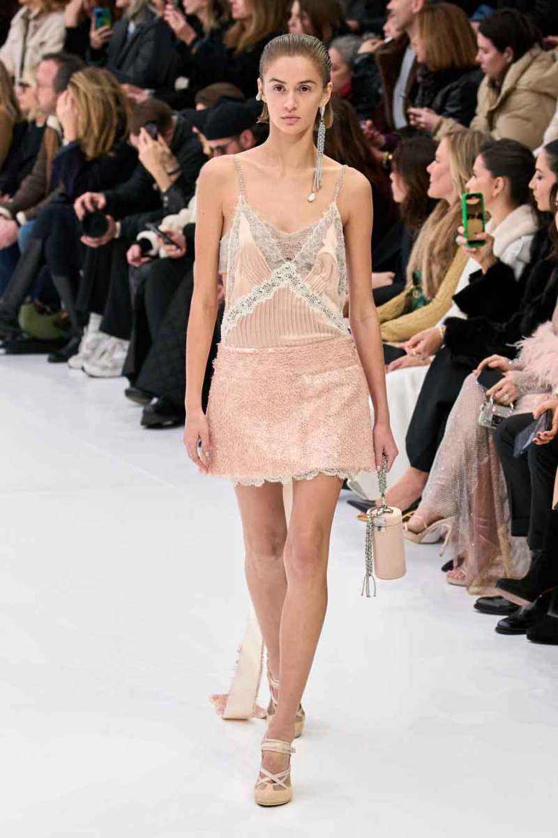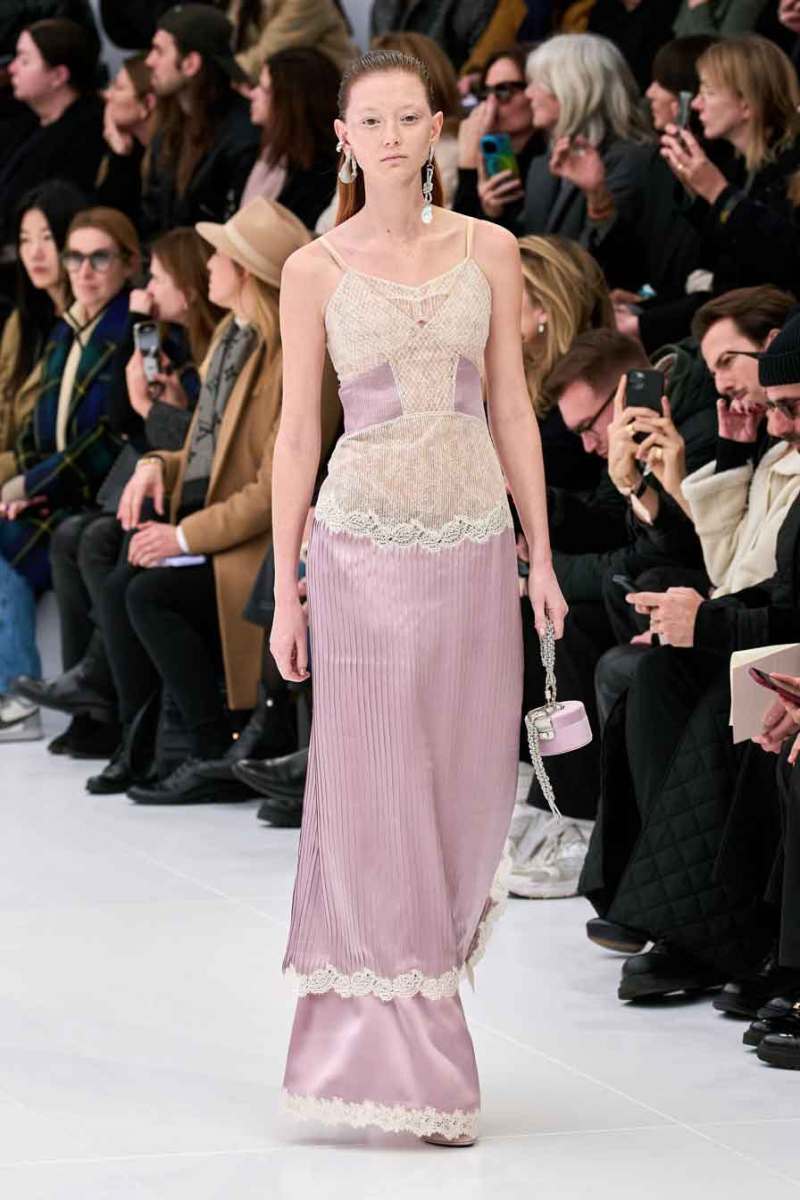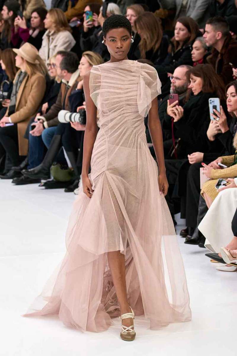 Su di una passerella circolare minimal sfila la PE 2023 di Fendi Couture. Una collezione romantica per i suoi colori tenui e le ricorrenti trasparenze. Tulle, pizzo e sete ricreano un’atmosfera serale delicata e pura. E, allo stesso tempo, gli abiti leggeri che rimandano ai capi di lingerie introducono note di sensualità. “La collezione è un mondo interiore trasformato in uno esterno – sia in senso figurato che letterale – in cui il senso di intimo diventa abito da sera”, spiega il direttore creativo Kim Jones.