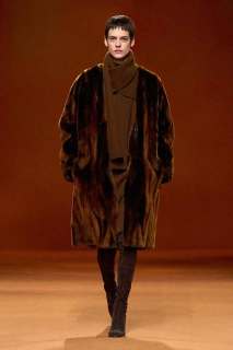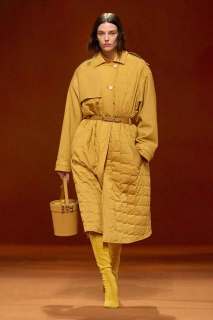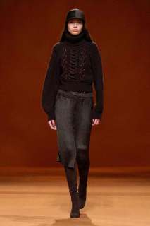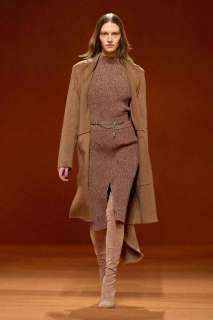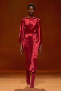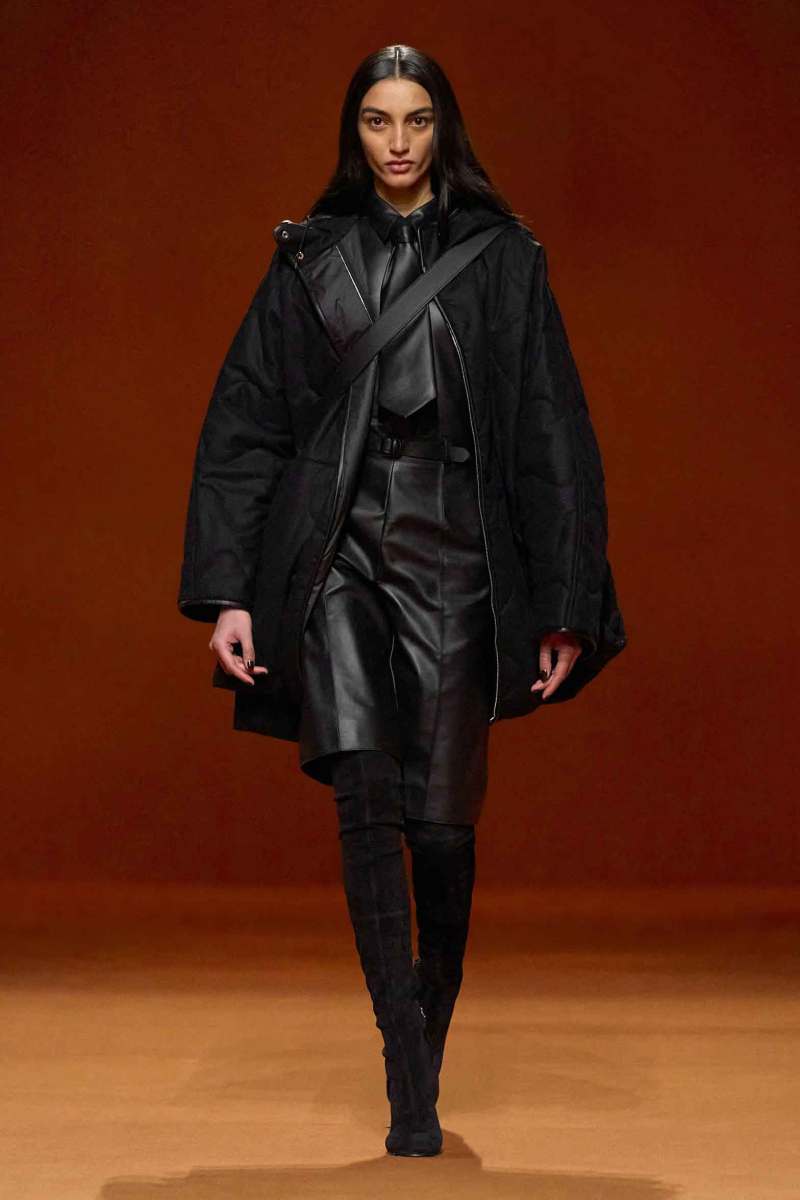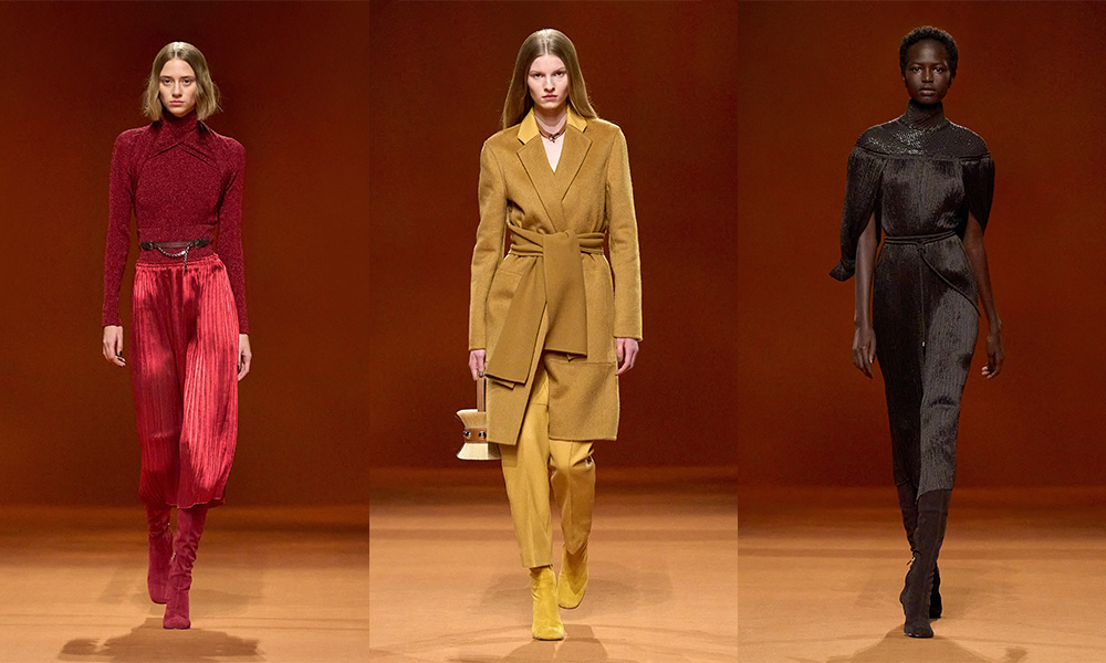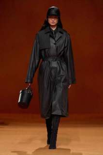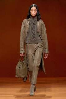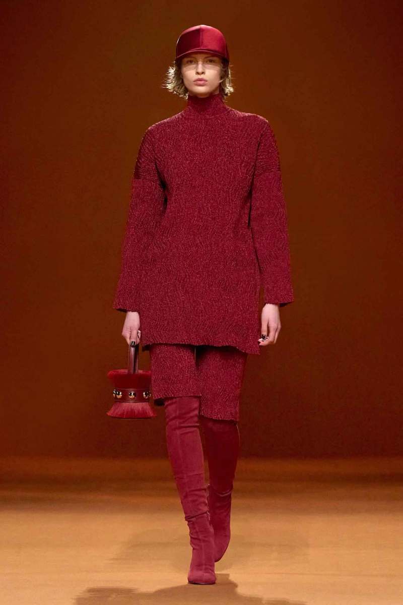 Infuocato, sensuale e dirompente: questo l’effetto che ci lasciano i primi look che sfilano, caratterizzati dal colore rosso acceso. Si alternano un’ampia varietà di maglieria, trench in lana d’alpaca stretti in vita con una cintura, giacche e cappotti trapuntati in pelle o in flanella di lana talvolta con zip, montgomery lunghi, gonne plissè, maglioni in cashmere, pantaloni a vita alta e abiti senza maniche. A metà sfilata subentra poi il colore nero che conferisce ai look grande eleganza.