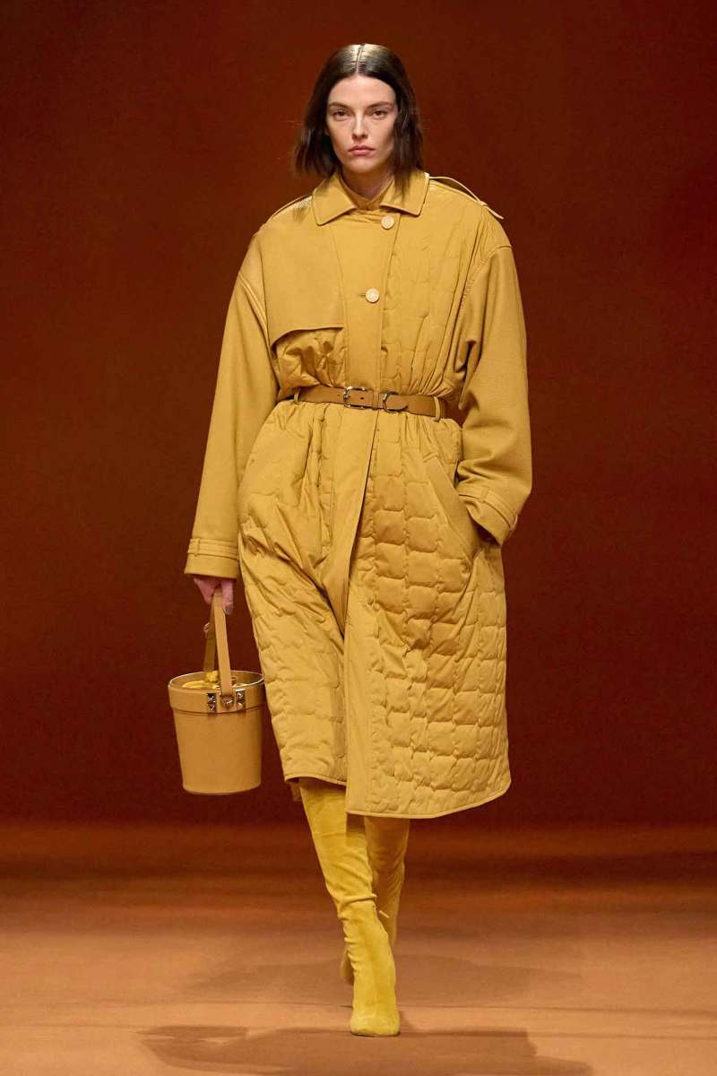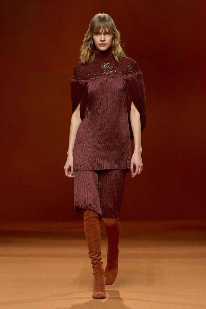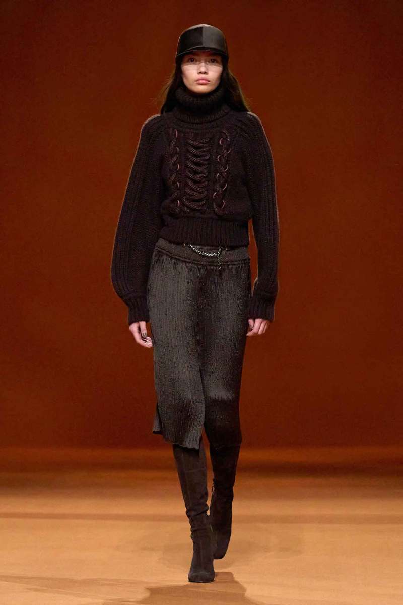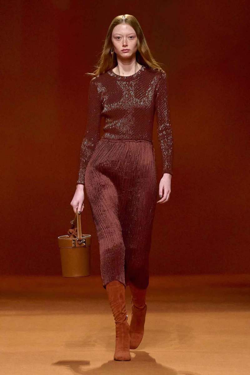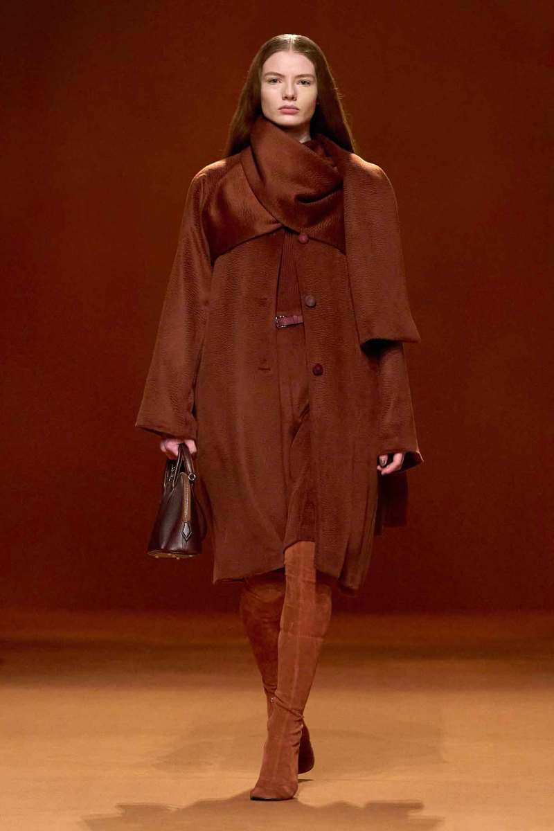 Per la settimana della moda parigina Hermès presenta la sua nuova collezione AI 2023-24 firmata Nadège Vanhee-Cybulski. I colori infuocati fanno da protagonisti e spiccano sullo sfondo color corteccia che, insieme al soundtrack rock, avvolge lo show.