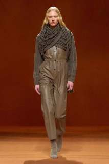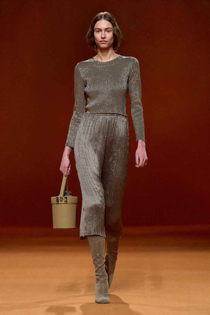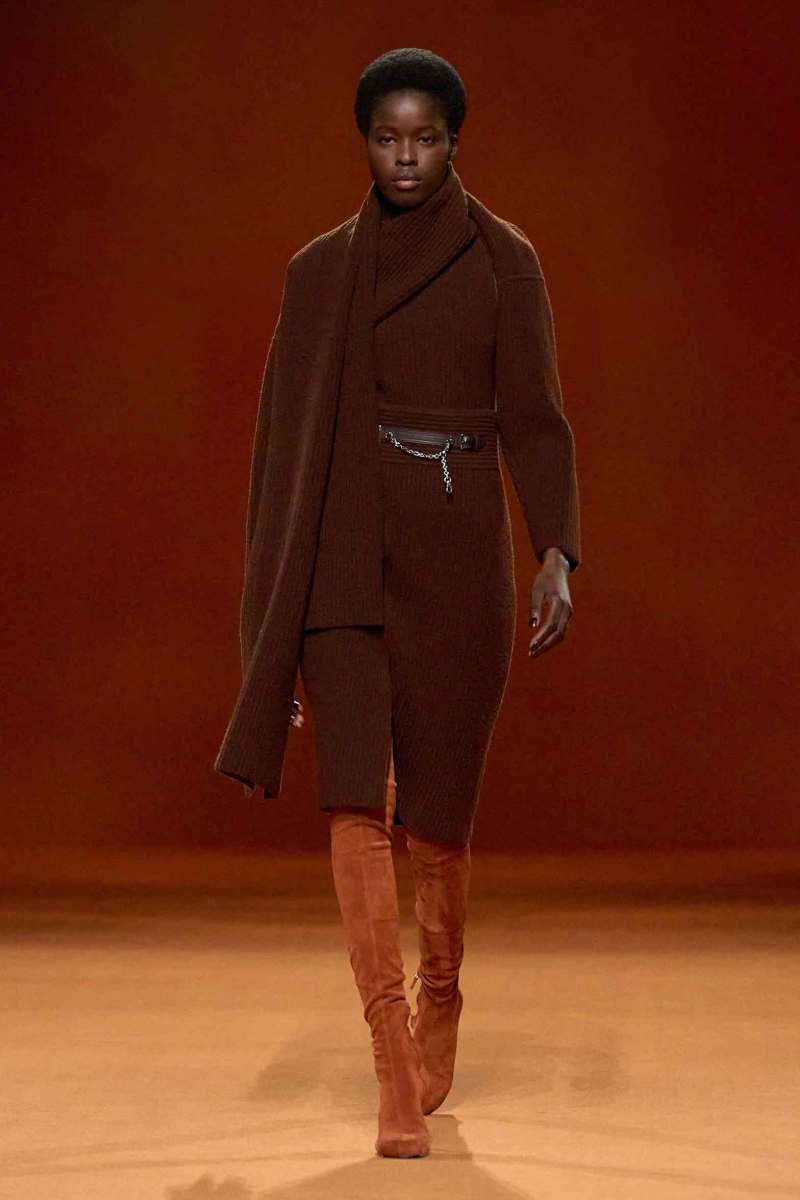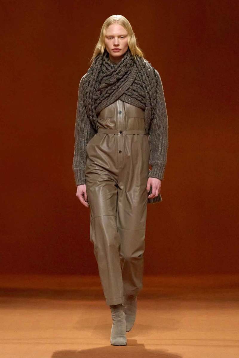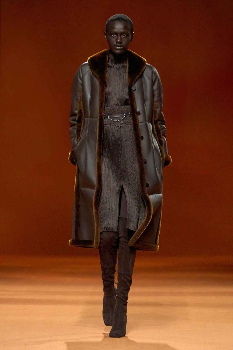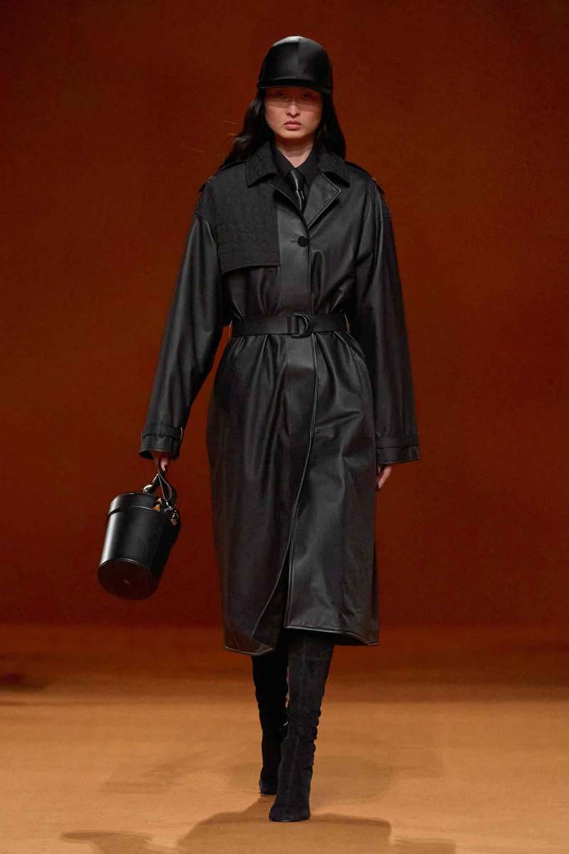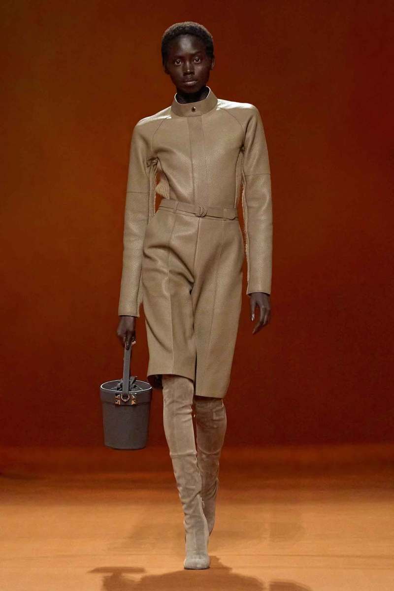 Protagonisti risultano inoltre essere gli accessori, numerose infatti le cinture e le scarpe, tra cui spiccano gli stivali alti alla coscia scamosciati della stessa tonalità dei capi. Presenti, infine, anche le borse Médor e Birkin.