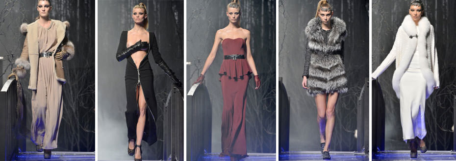 La nuova collezione autunno – inverno 2013/2014 di Philipp Plein è come una “fiaba lussuosa”. Pelliccie in volpe, ricami preziosi, stampe, jacquard e bouclé, decolletè glitterati e shopper con frange lunghissime. Fascie metalliche con serpente segnano in vita il mermaid dress in velluto di seta. Sexy pantaloni di pelle nera con inserti di pitone abbinati ai mini leather jackets, bracciali oro con serpente che fasciano le braccia e mini dress che vanno dal bianco al color borgogna.