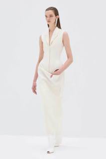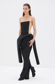 In un’intervista a Vogue ha dichiarato di non essere amante delle decorazioni, di ciò che in realtà solitamente definisce le sfilate di Alta Moda; la sua collezione infatti si arricchisce di linee e drappeggi sapientemente studiati. Drappeggi che diventano portabili e dall’allure senza sforzo, con le modelle che mostravano le tasche create dal tessuto, dalla tela alla pelle che copre metà del viso, fino alle trasparenze dei nude look finali. Giacche, slip dress e t-shirt cascavano sui corpi delle modelle lasciando spazio ai corsetti con una palette che dal nero al blu notte, il sabbia e il bianco, sfumava su una passerella quadrata.
