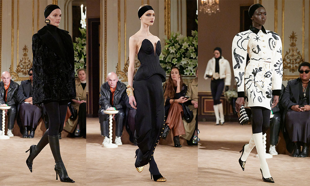 Daniel Roseberry, direttore creativo della celebre casa di haute couture italiana, porta in passerella una collezione che si compone di capi che si trasformano in vere e proprie opere d’arte. Quella di Schiaparelli è, ancora una volta, una donna elegante e raffinata, circondata da un’aura solenne e celestiale. Il colore dominante è il nero, che viene accostato a importanti gioielli dorati, in piena linea con l’imperituro stile della Maison.