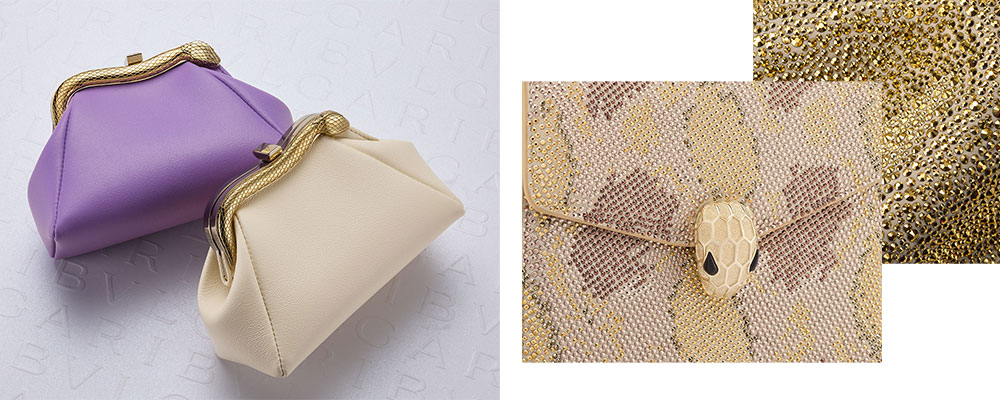 Bulgari accoglie due accattivanti novità, le nano bag Serpenti Reverse e Serpenti Pouch, accanto alla borsa portagioie Serpenti Nano, ispirata ai colori e alla texture della malachite, e dell’ultra-mini tracolla frizzante Serpenti Forever in metallo oro chiaro. Ricca di originalità e di stili versatili, la collezione Textile invita a un viaggio tra i colori emblematici, i motivi estetici e le fonti di ispirazione firmate Bulgari.