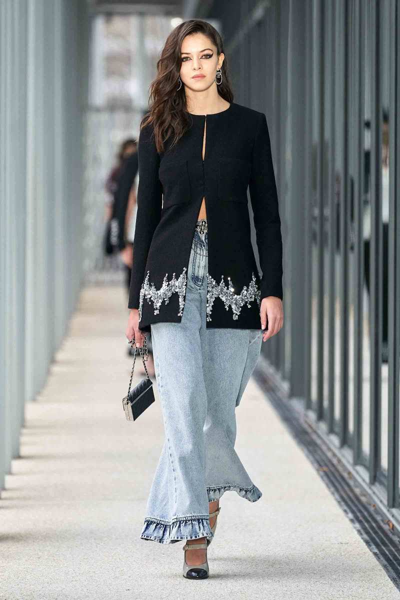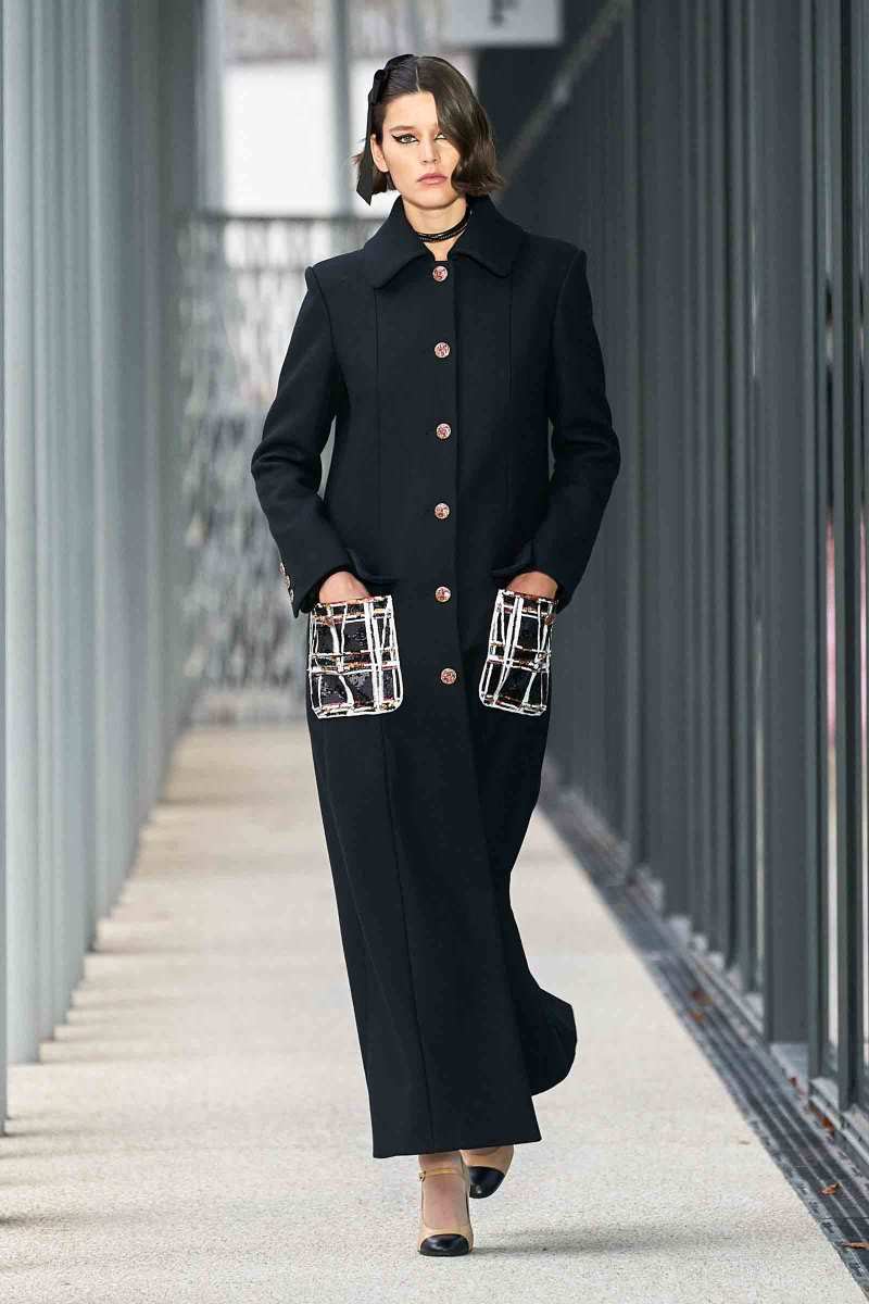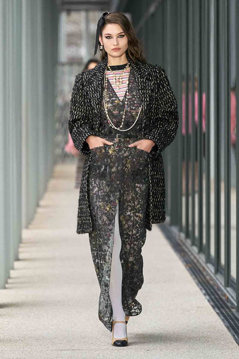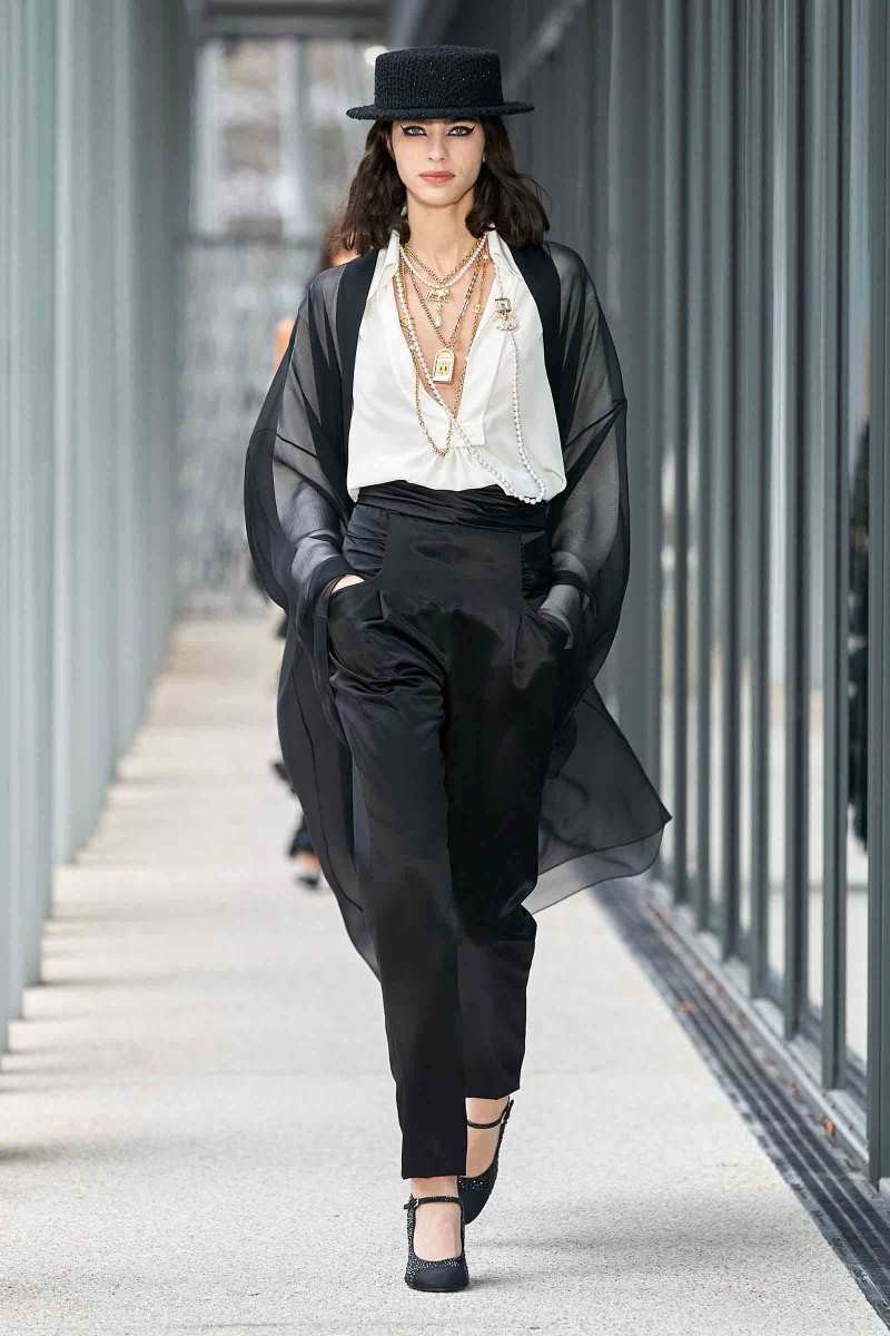 Per i più “conservatori”, Virginie Viard ha pensato a una giacca nera con linee adornate di paillettes argentate; un cappotto di tweed color crema lungo fino a toccare terra e ad una versione sbarazzina della classica uniform Chanel: camicia bianca, pantaloni a sigaretta neri e spolverino di chiffon trasparente, il tutto reso attuale da un cappello da barca total black.