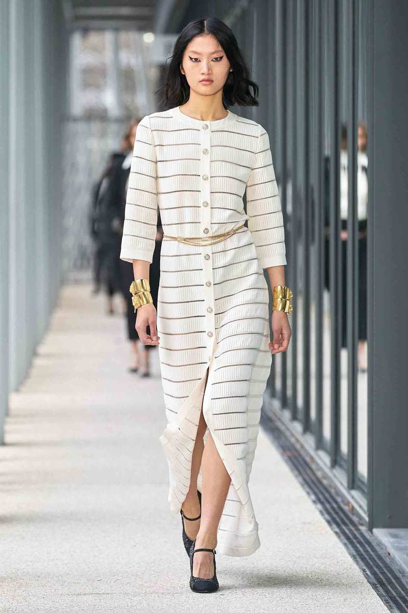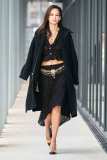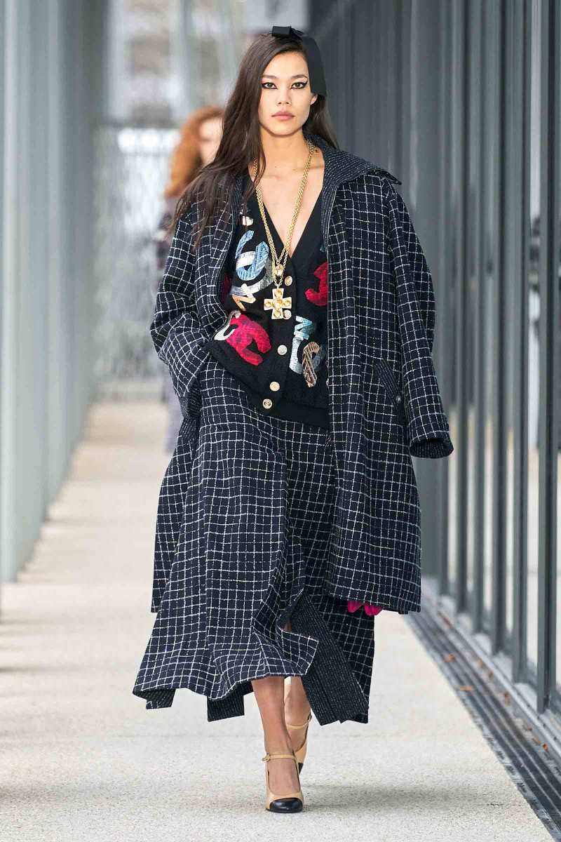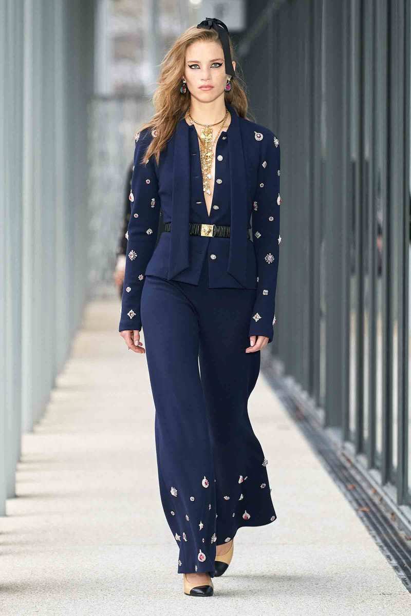 Per i più “conservatori”, Virginie Viard ha pensato a una giacca nera con linee adornate di paillettes argentate; un cappotto di tweed color crema lungo fino a toccare terra e ad una versione sbarazzina della classica uniform Chanel: camicia bianca, pantaloni a sigaretta neri e spolverino di chiffon trasparente, il tutto reso attuale da un cappello da barca total black.