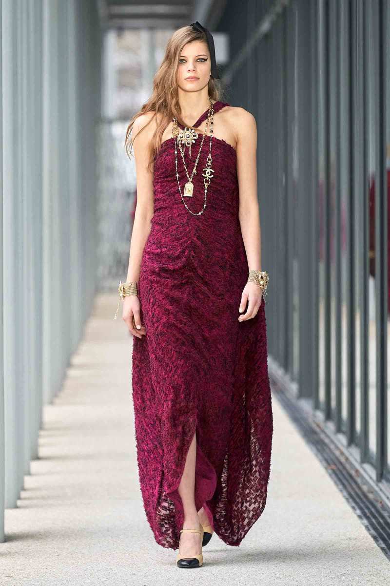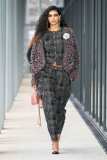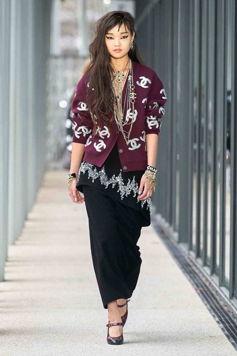 Una pletora di capispalla per sfidare il freddo all’aperto: dai cappotti in tweed scintillante di paillettes argentate, abbinati a jeans decolorati con bordo arricciato o pantaloni logati CC, agli iconici cardigan, very comfy, con grandi tasche applicate, indossati su abiti e top di lustrini, fino ad arrivare a un bomber in tweed con maniche in felpa ricamate di perle, per rendere omaggio anche qui alla charmant Coco.
