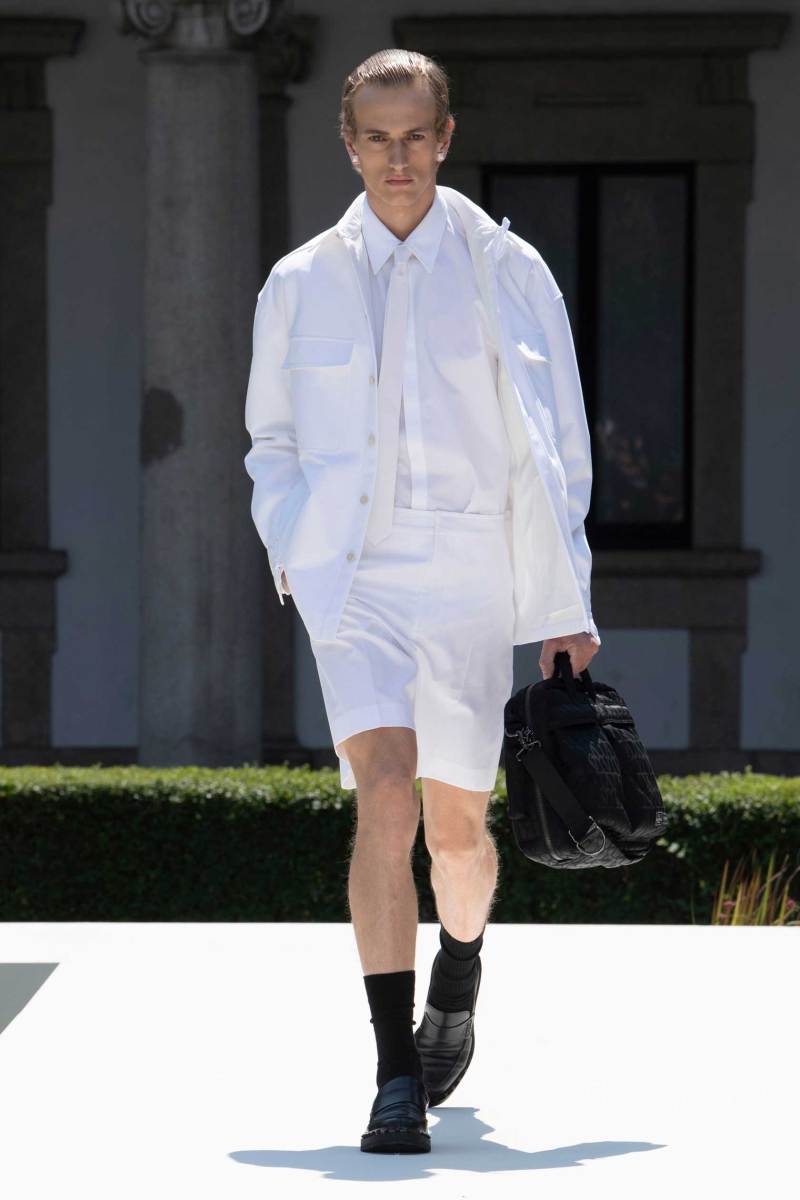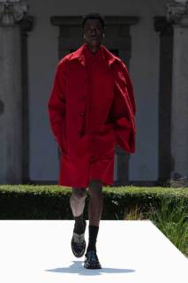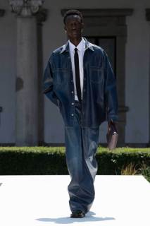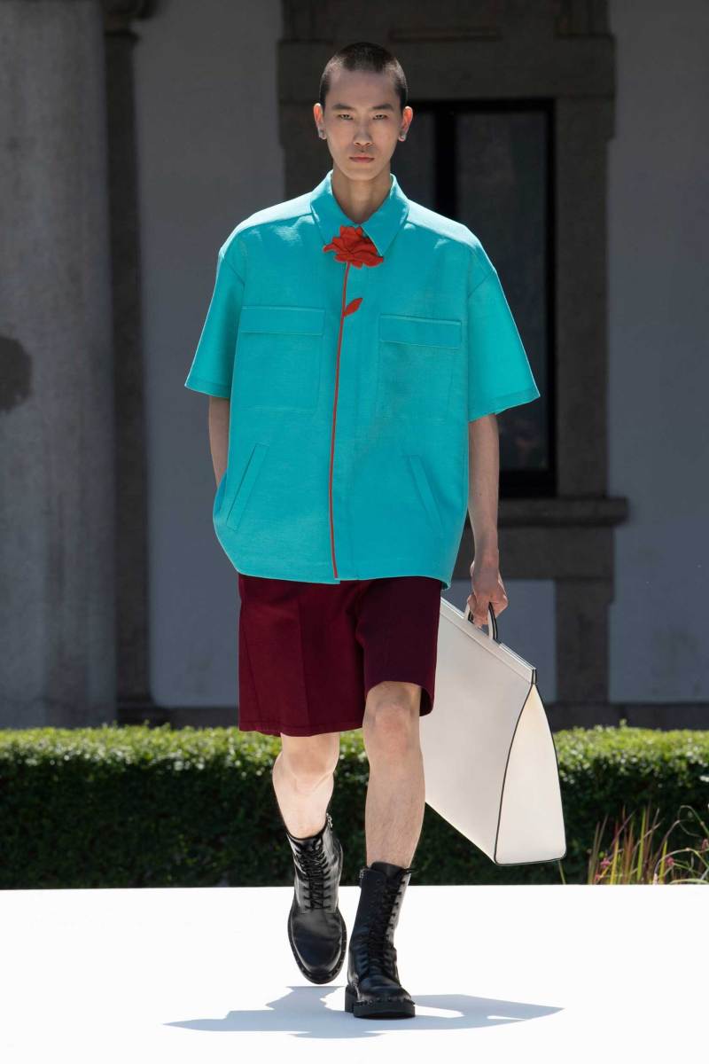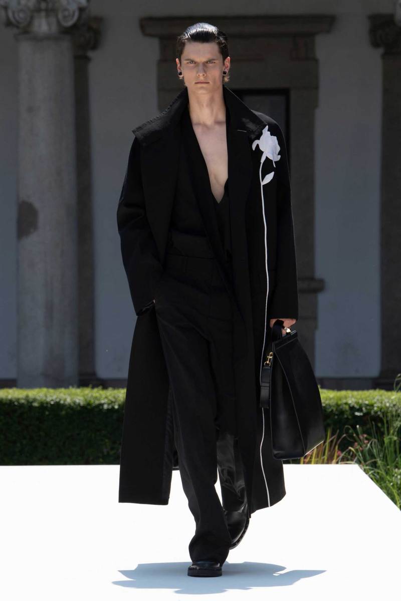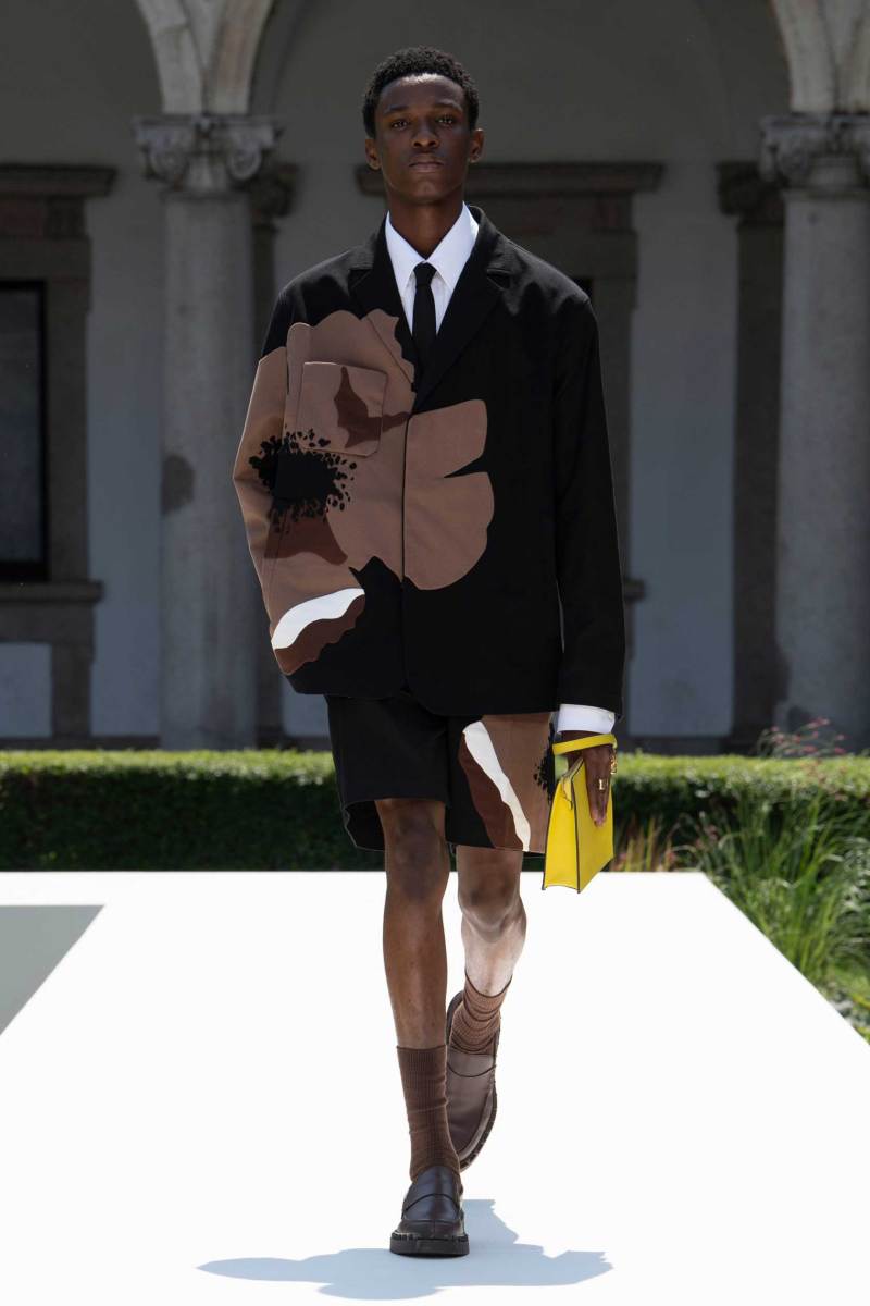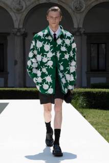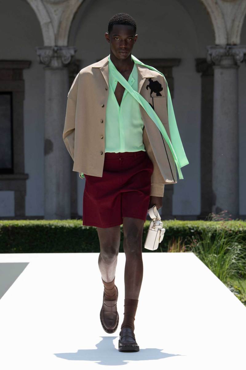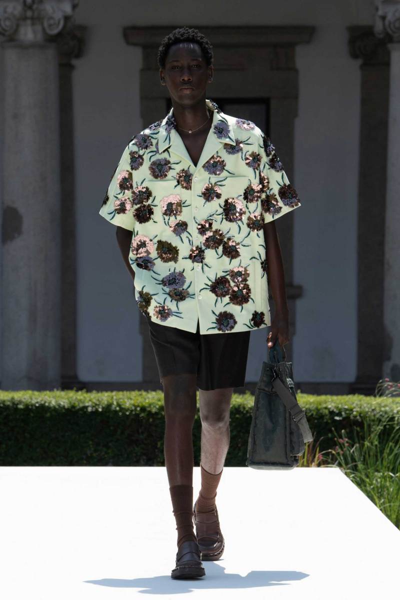 Il tutto si traduce in una palette di look monocromatici bianchi, neri, rosa, rossi, verdi e blu che lasciano spazio al denim e ricami floreali, ad indicare la fragilità dell’uomo, spesso un tabù. Il fiore si fa anche macro stampa alla Andy Warhol e stelo ricamato lungo l’abbottonatura, sulle camicie della collezione. Già sdoganato dal parterre di invitati, si riconferma per Spring Summer 2024 il completo giacca-bermuda, abbinato a mocassino e calzino a metà polpaccio. No alle mezze misure in fatto di accessori, maxi bag rigide gialle, rose e rosse oltre che nere, fino a mini bag che stanno nel palmo d’una mano.