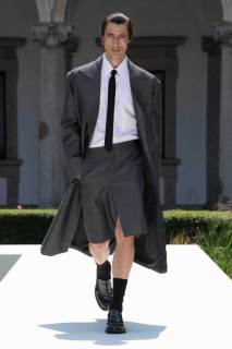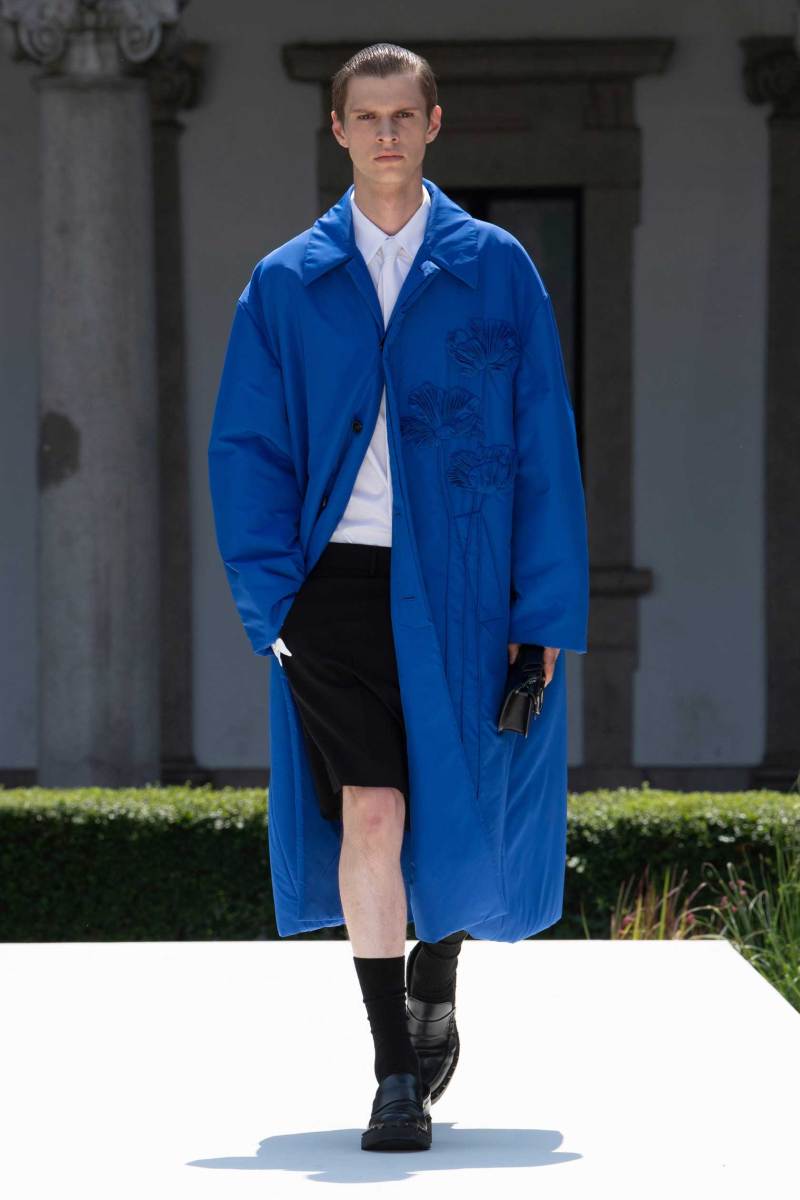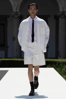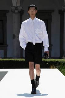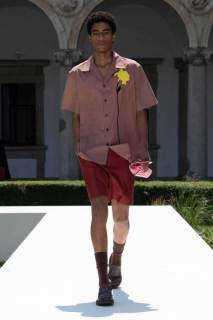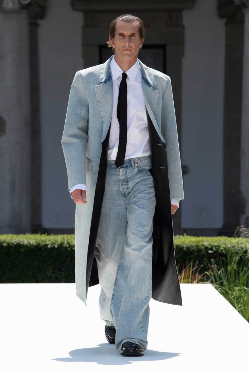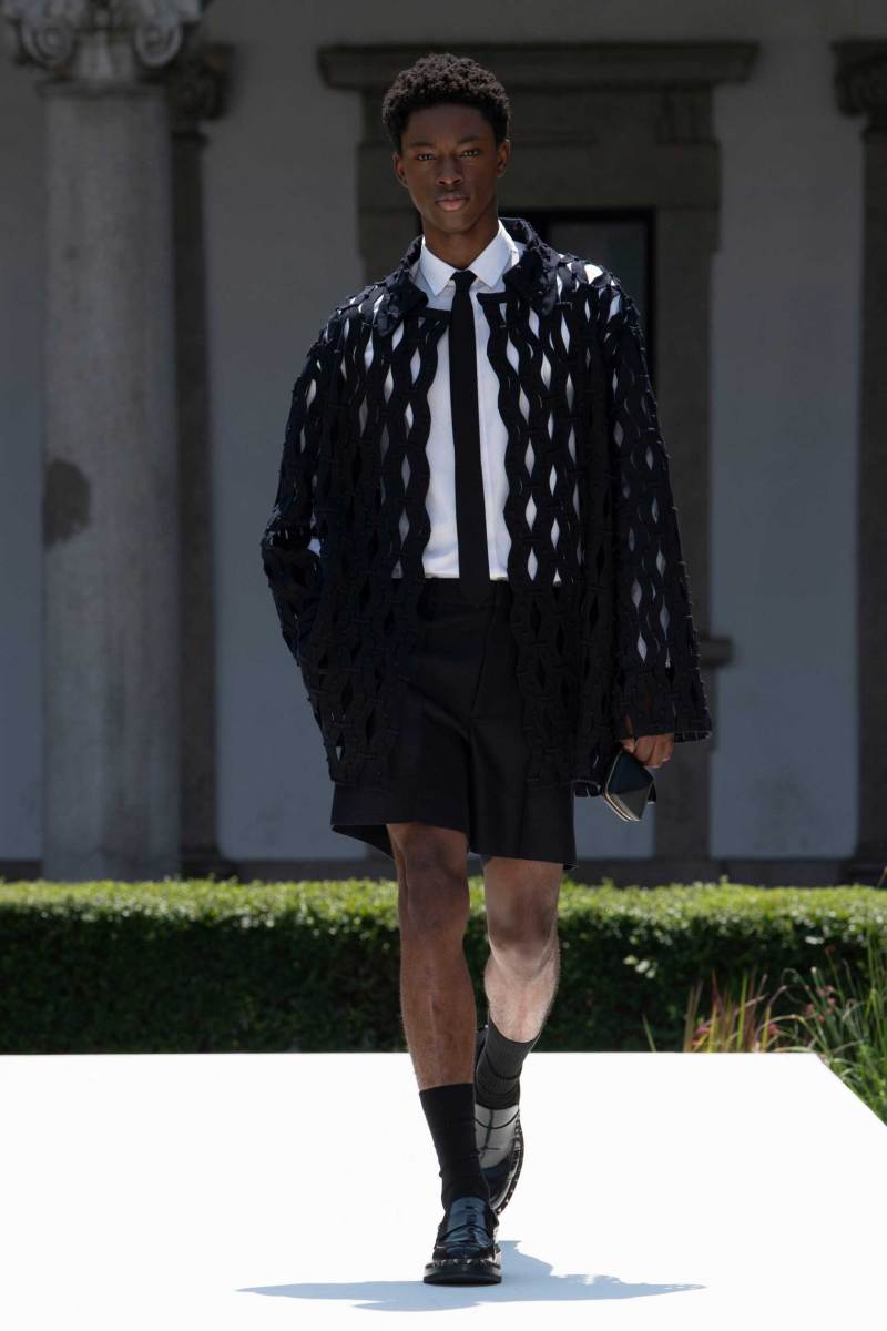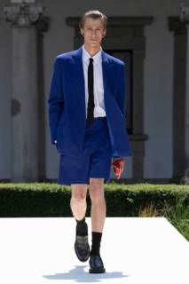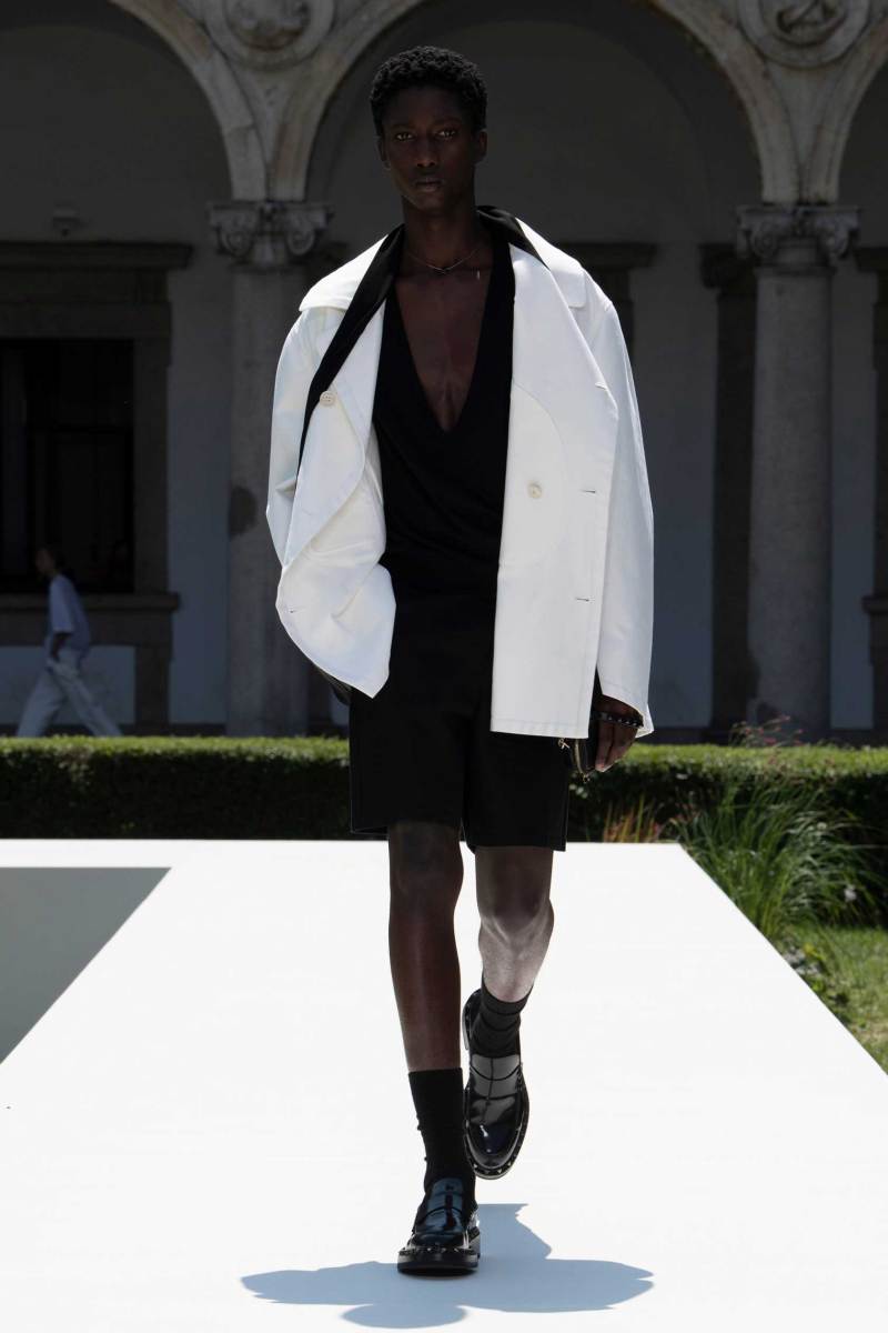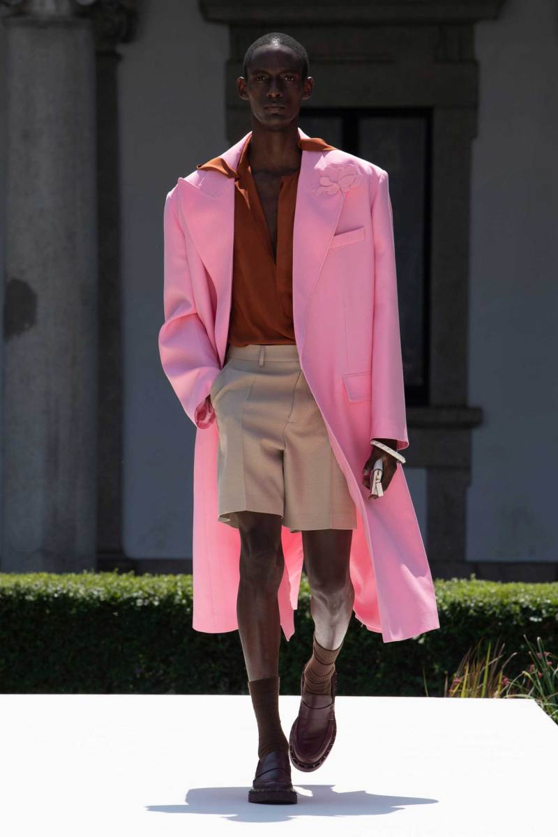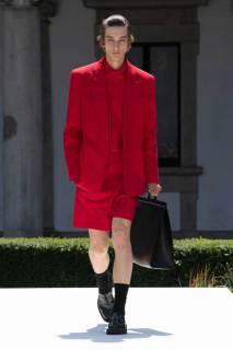 Il tutto si traduce in una palette di look monocromatici bianchi, neri, rosa, rossi, verdi e blu che lasciano spazio al denim e ricami floreali, ad indicare la fragilità dell’uomo, spesso un tabù. Il fiore si fa anche macro stampa alla Andy Warhol e stelo ricamato lungo l’abbottonatura, sulle camicie della collezione. Già sdoganato dal parterre di invitati, si riconferma per Spring Summer 2024 il completo giacca-bermuda, abbinato a mocassino e calzino a metà polpaccio. No alle mezze misure in fatto di accessori, maxi bag rigide gialle, rose e rosse oltre che nere, fino a mini bag che stanno nel palmo d’una mano.